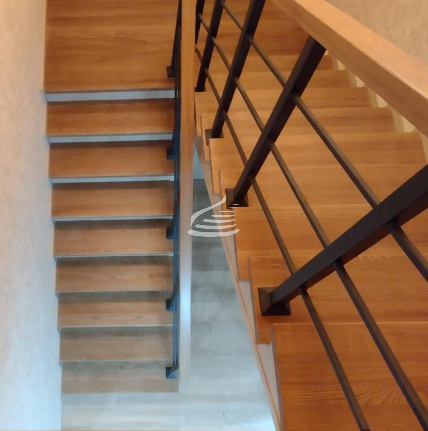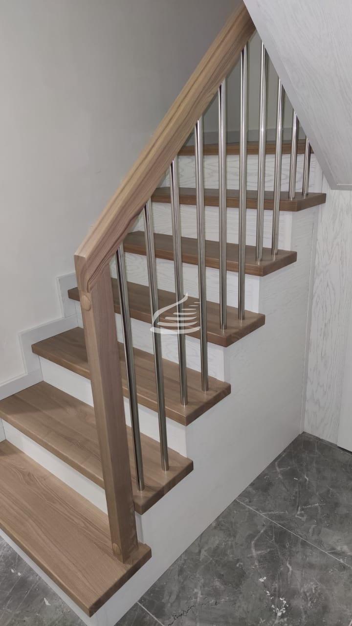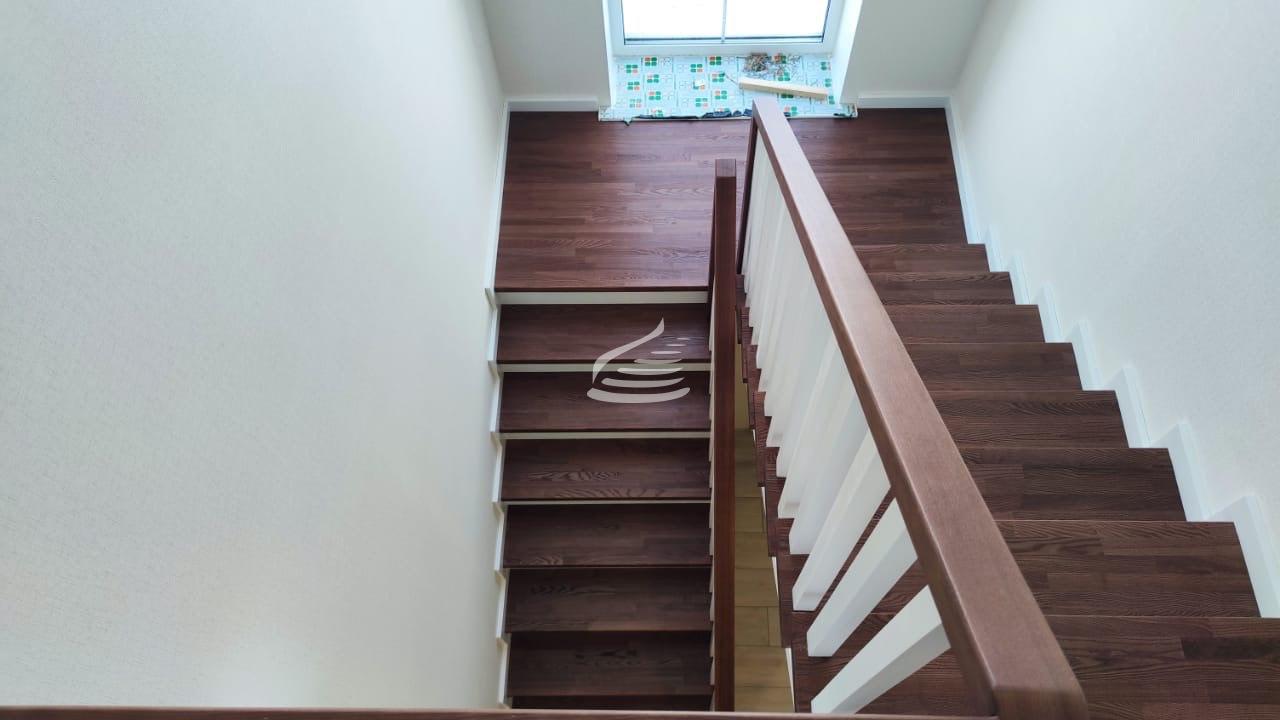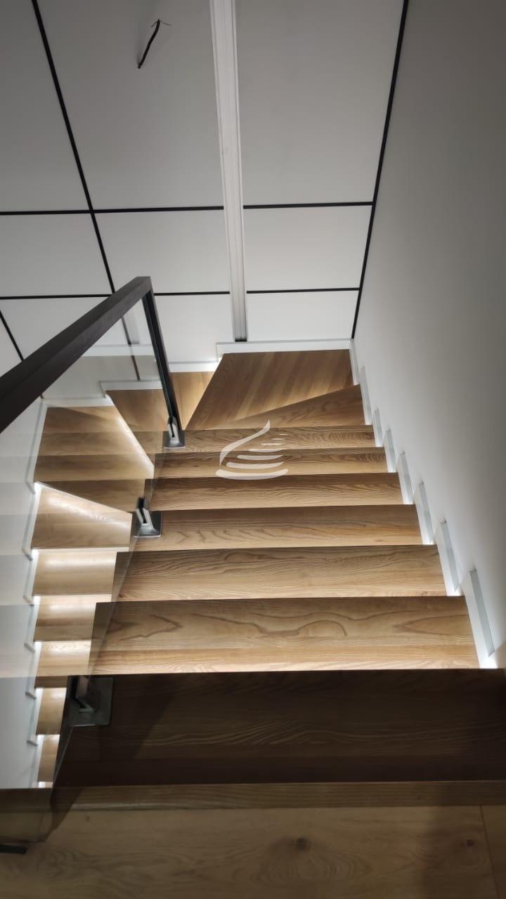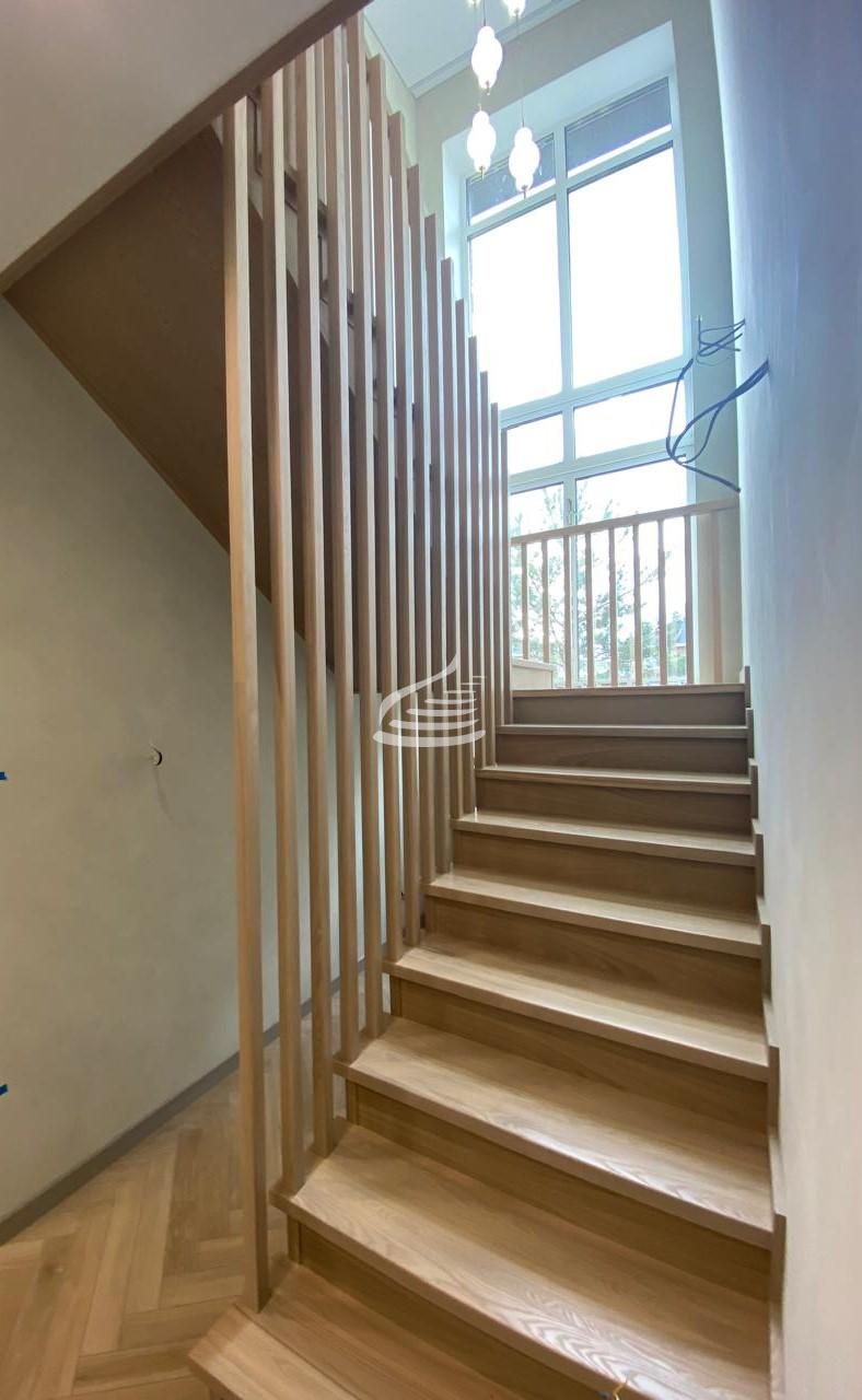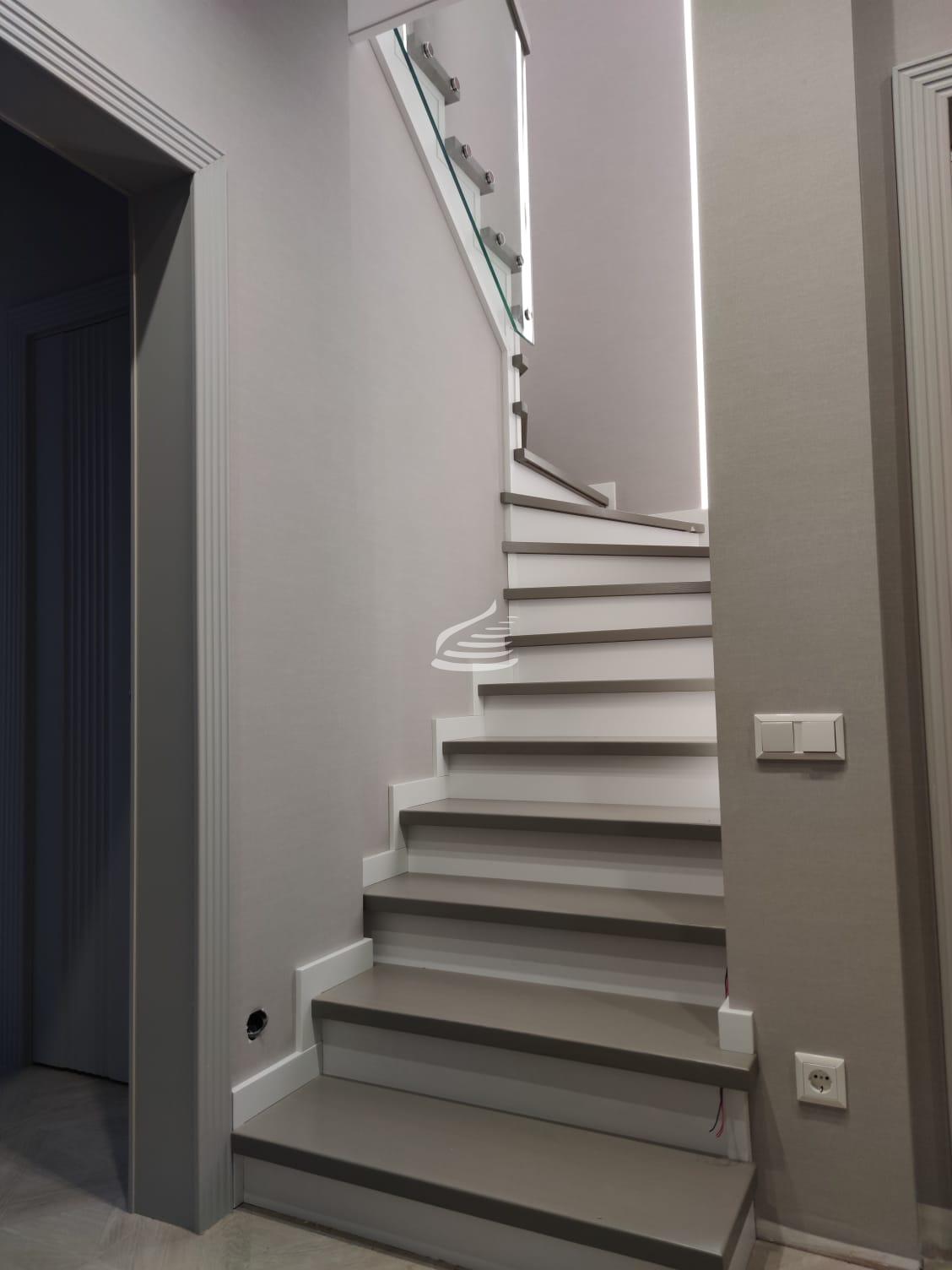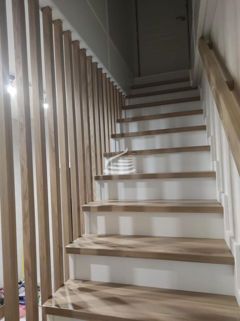 Лестница между стен, с пристенным поручнем и подиумными ступенями, в серых тонах, из цельноламельного Ясеня. Обшивка готового металлокаркаса.