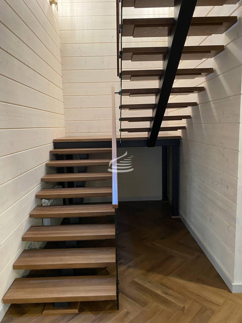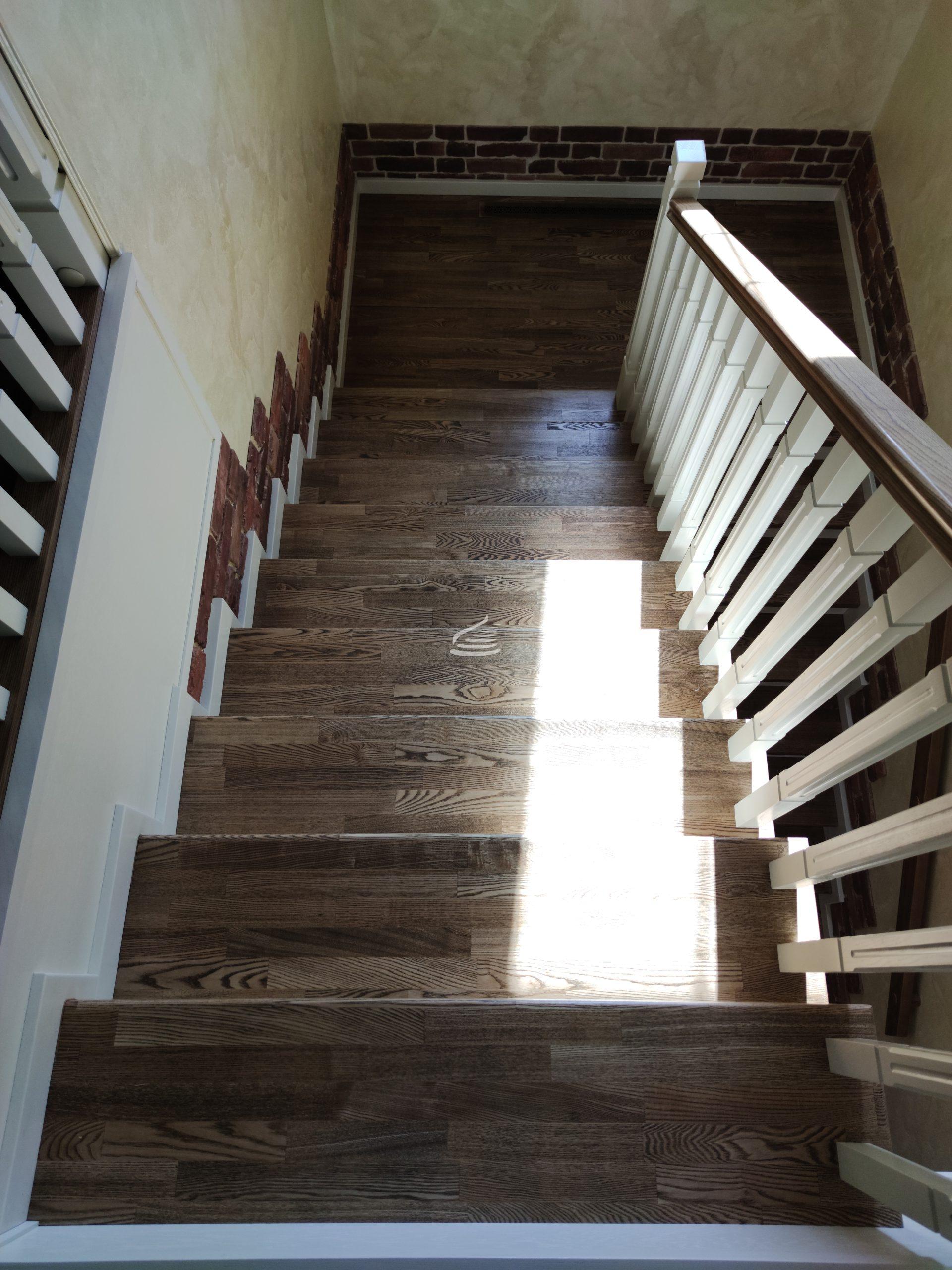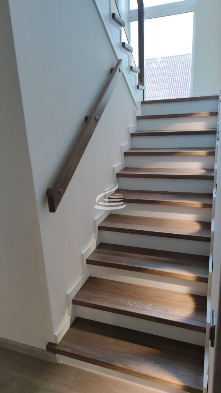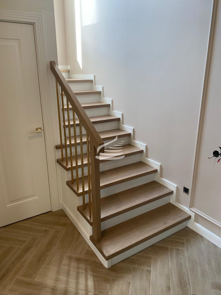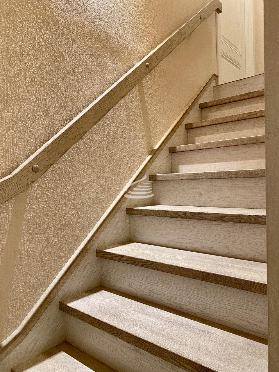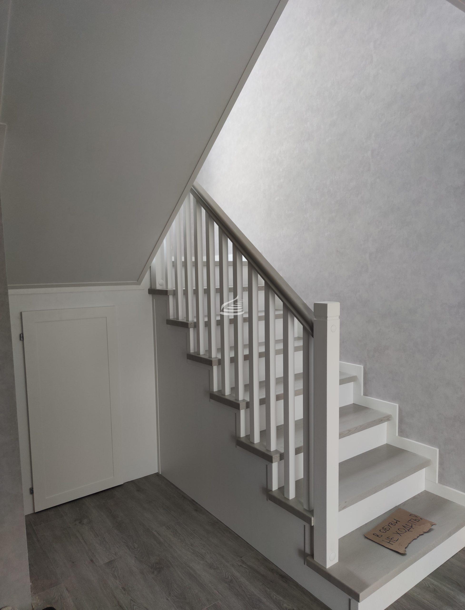 Лестница между стен, с пристенным поручнем и подиумными ступенями, в серых тонах, из цельноламельного Ясеня. Обшивка готового металлокаркаса.