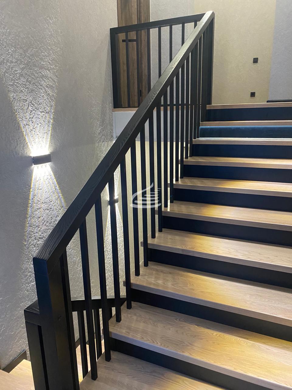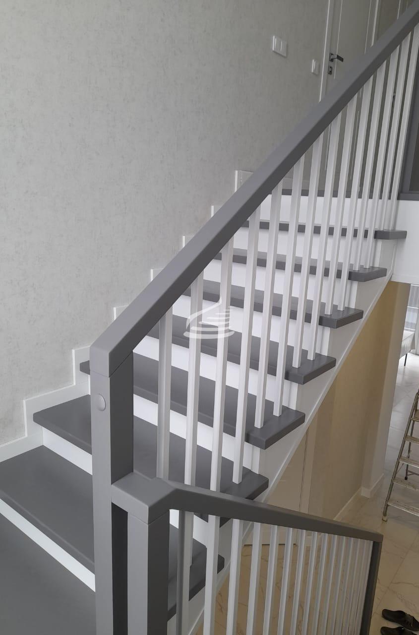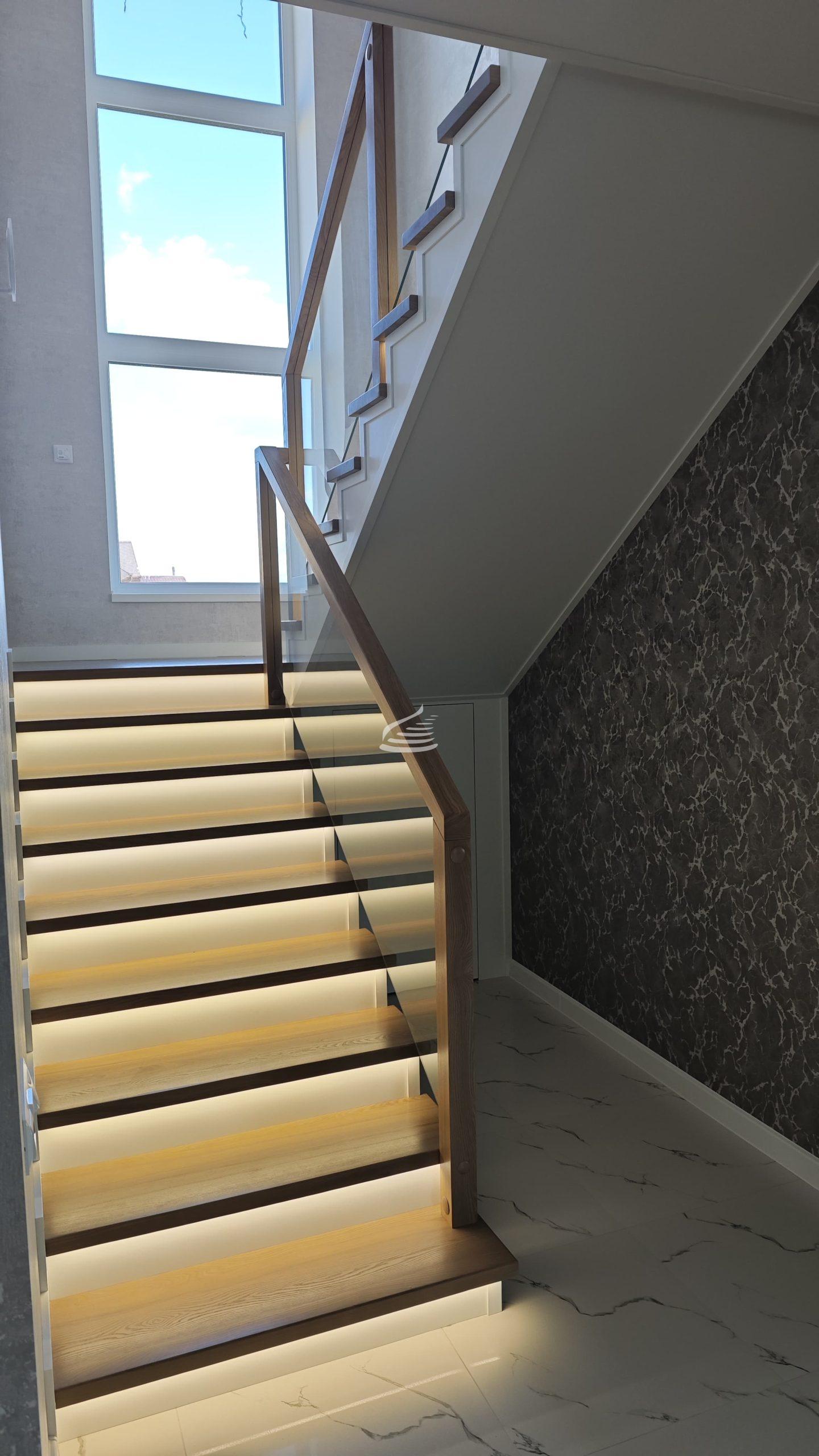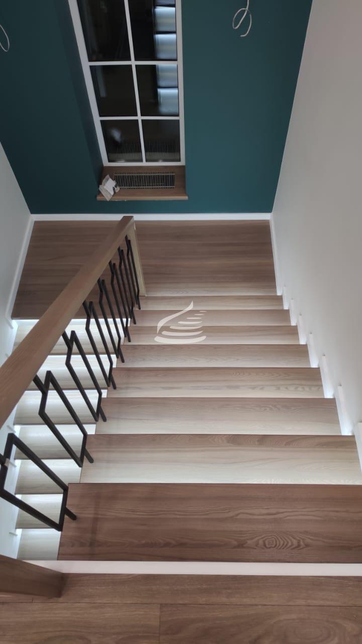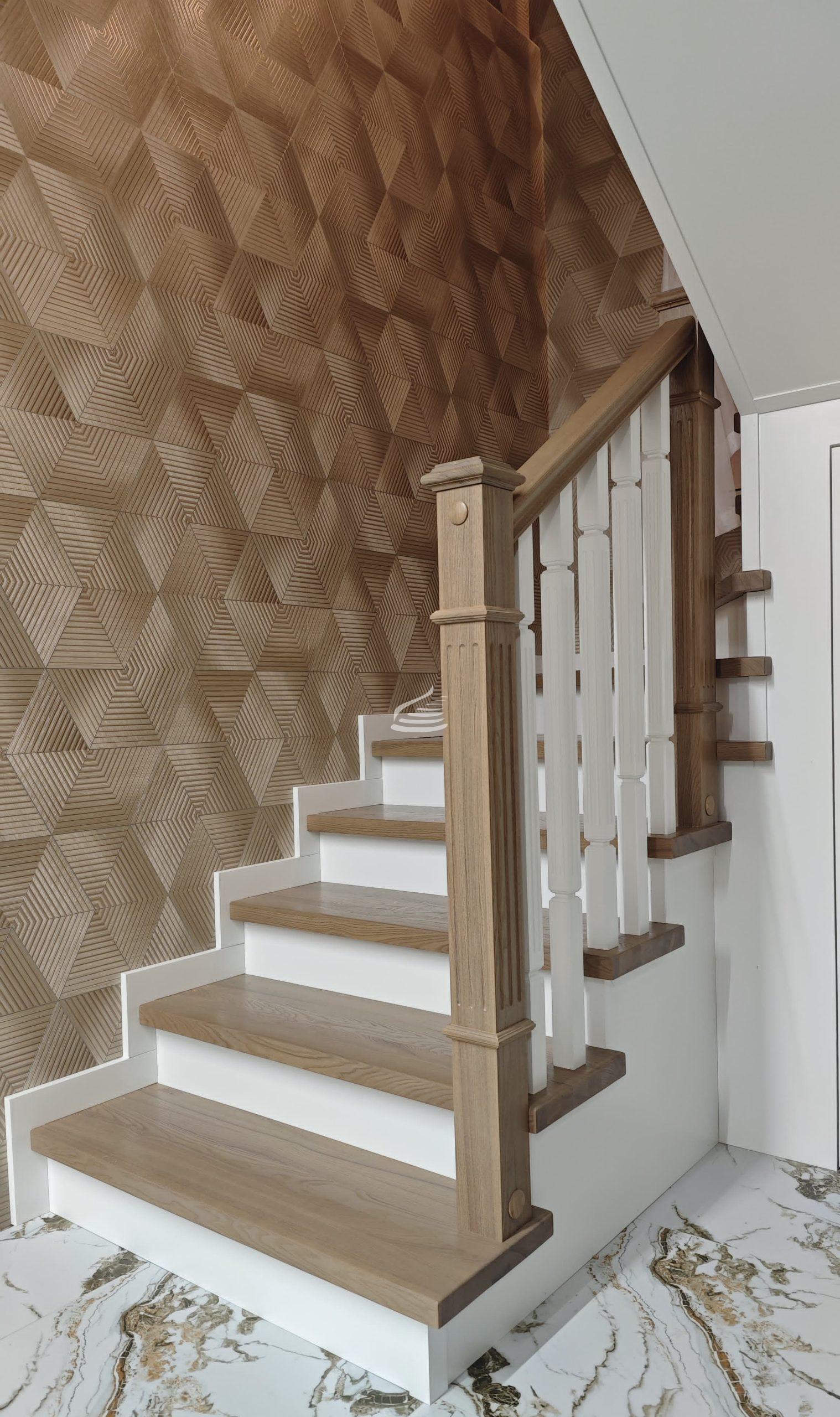 Лестница между стен, с пристенным поручнем и подиумными ступенями, в серых тонах, из цельноламельного Ясеня. Обшивка готового металлокаркаса.