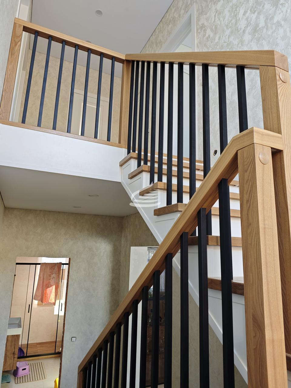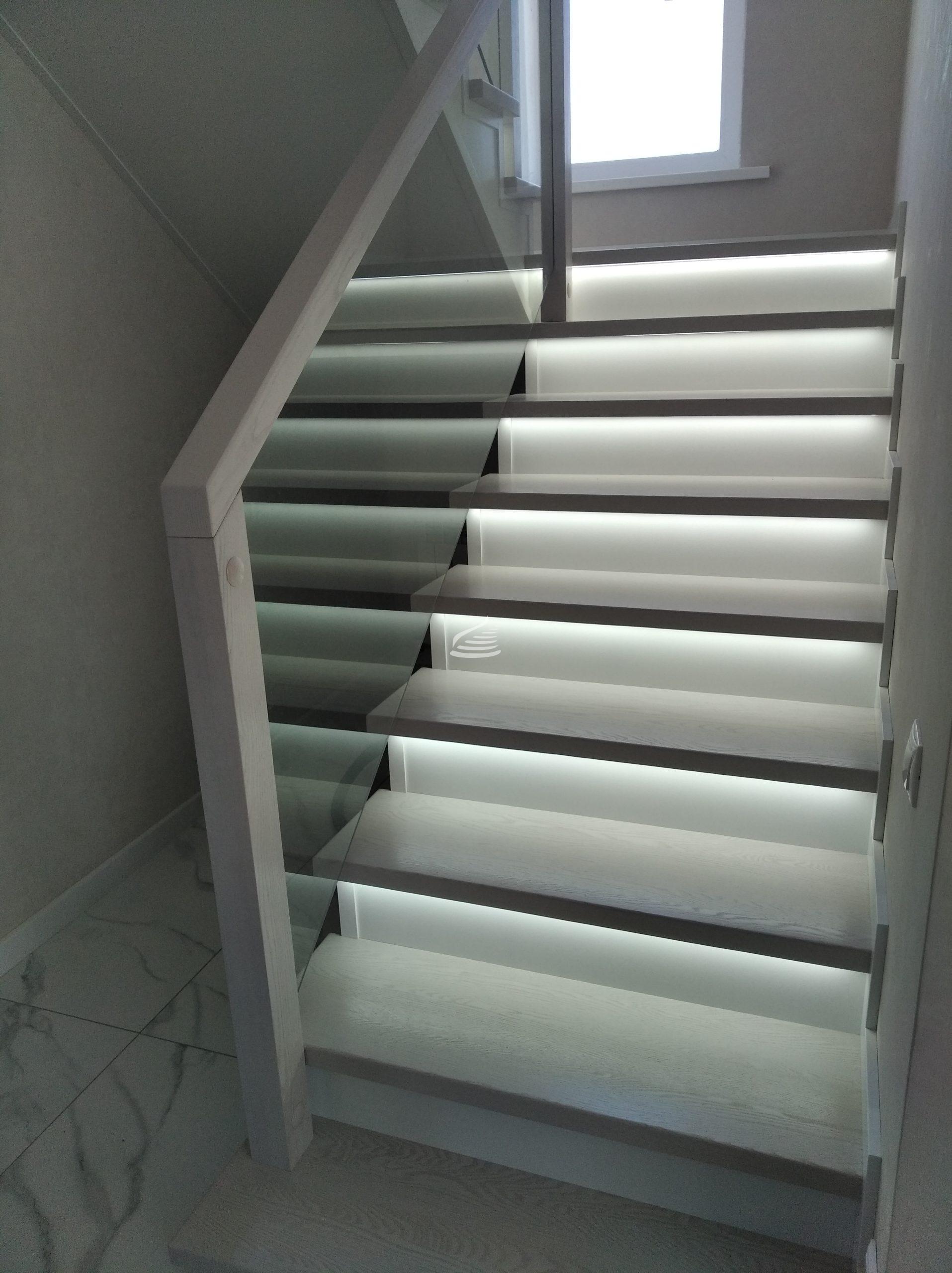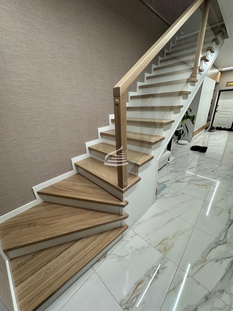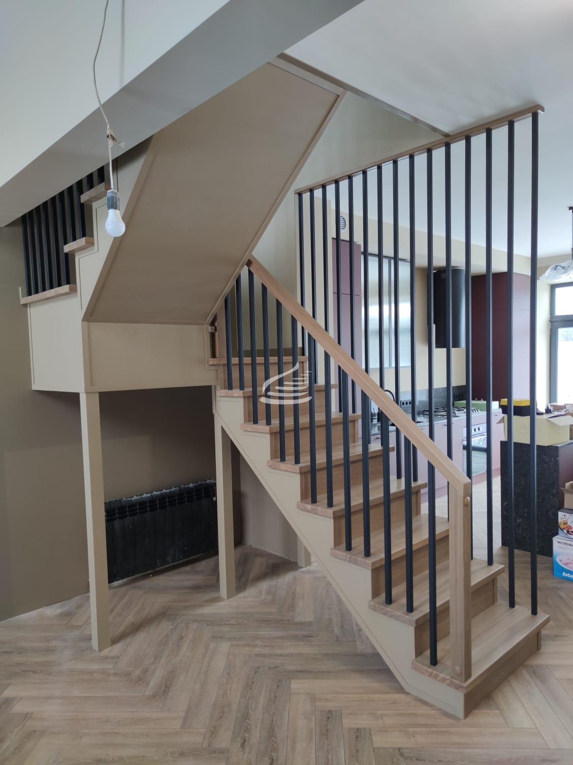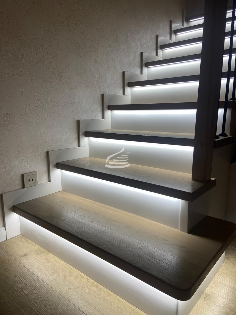 Лестница между стен, с пристенным поручнем и подиумными ступенями, в серых тонах, из цельноламельного Ясеня. Обшивка готового металлокаркаса.