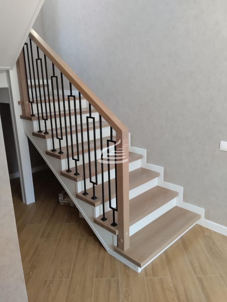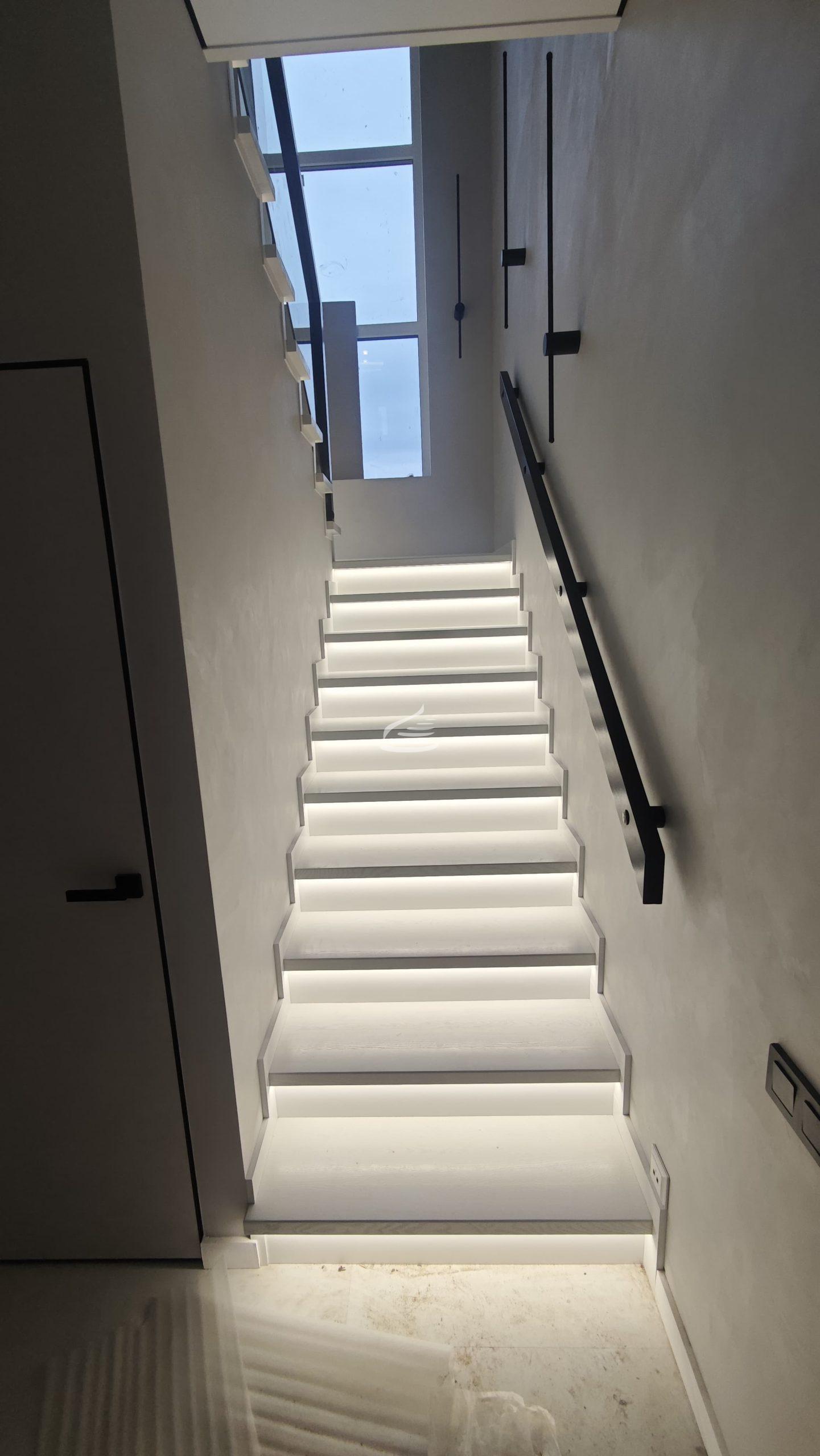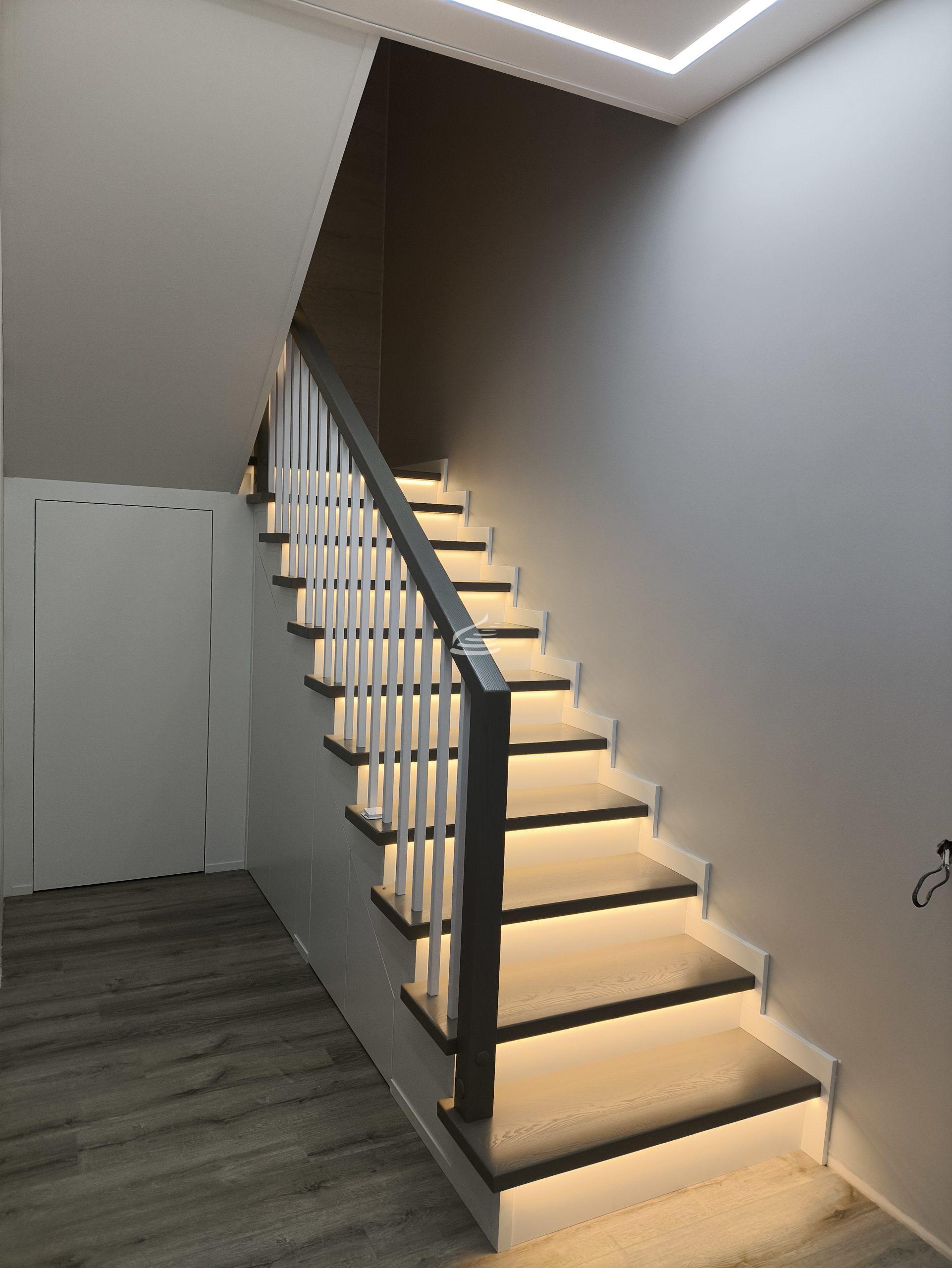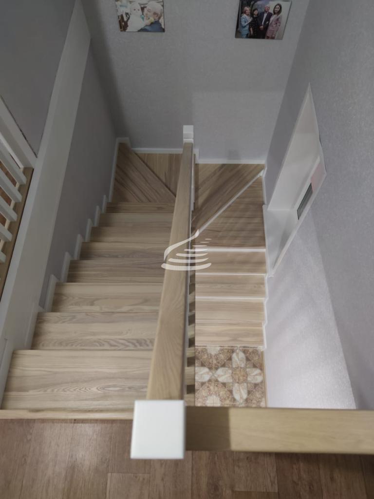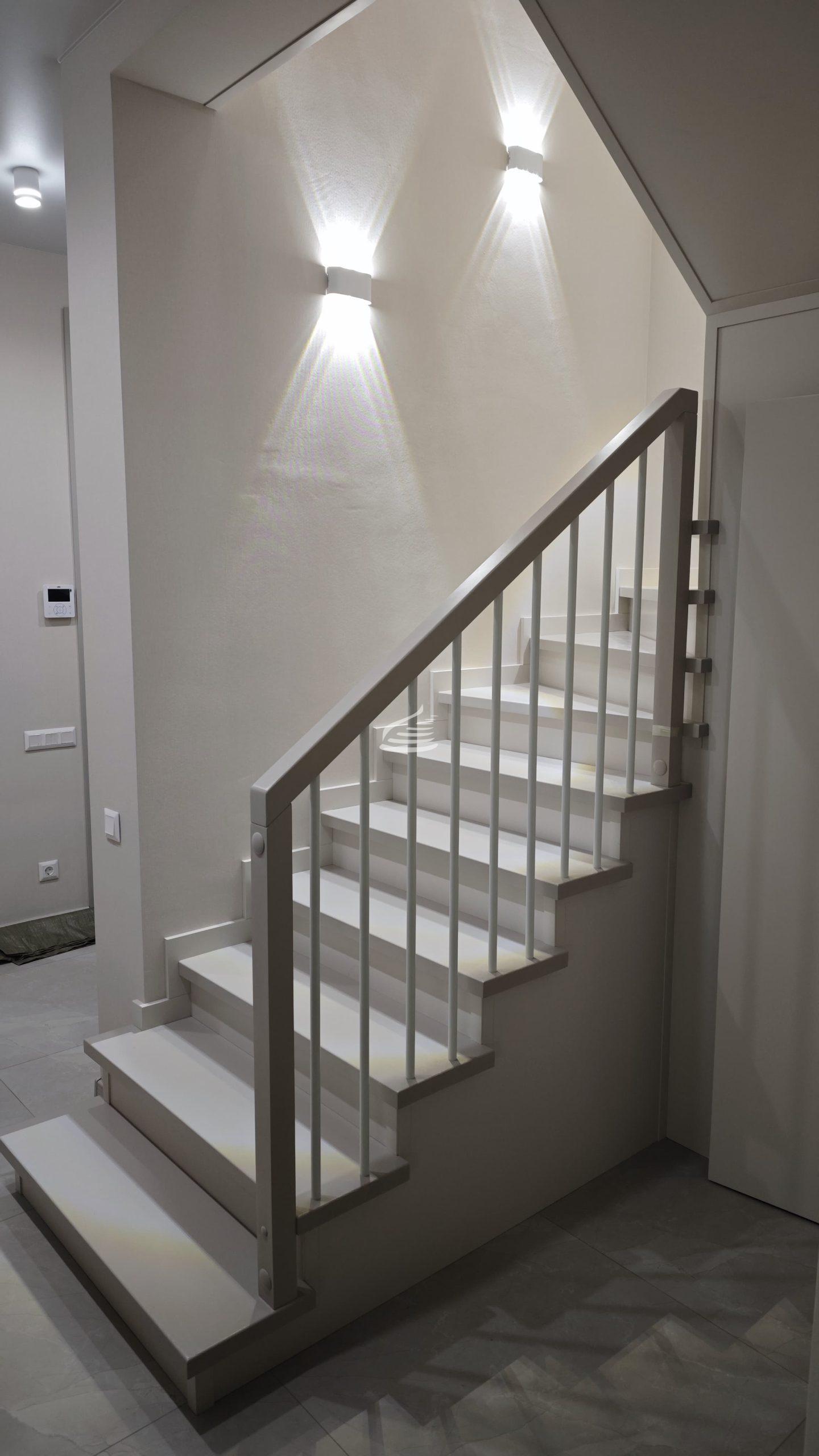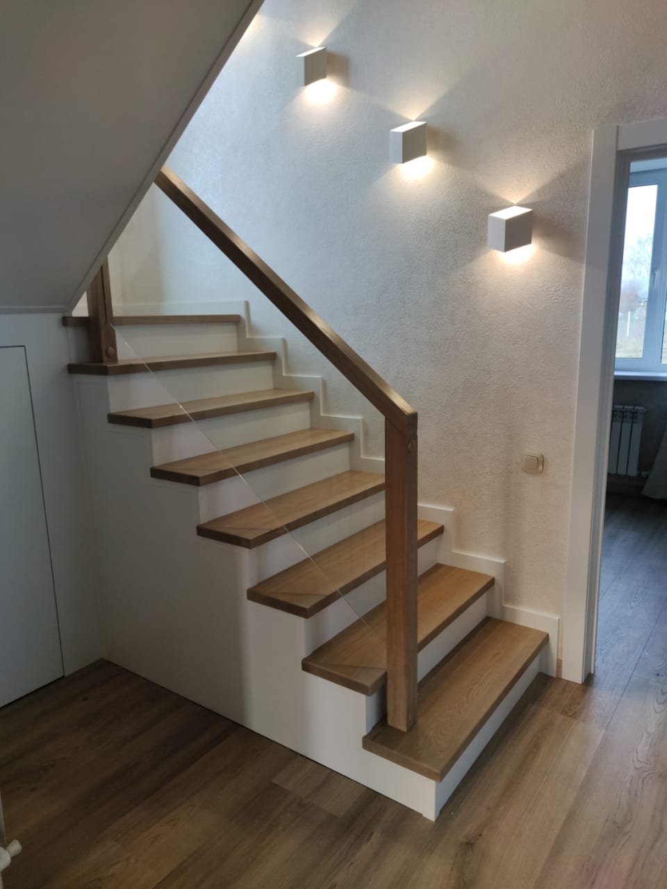 Лестница между стен, с пристенным поручнем и подиумными ступенями, в серых тонах, из цельноламельного Ясеня. Обшивка готового металлокаркаса.