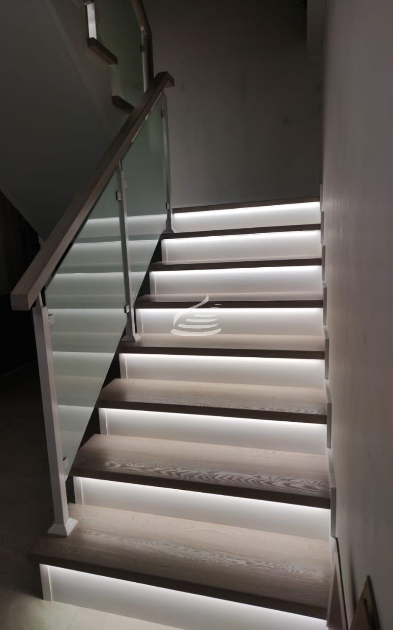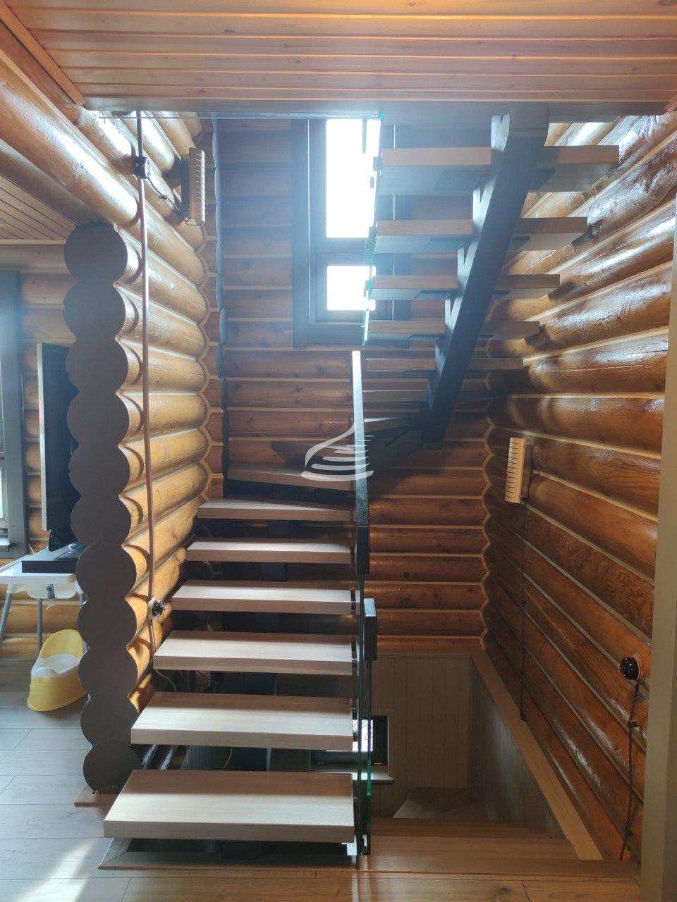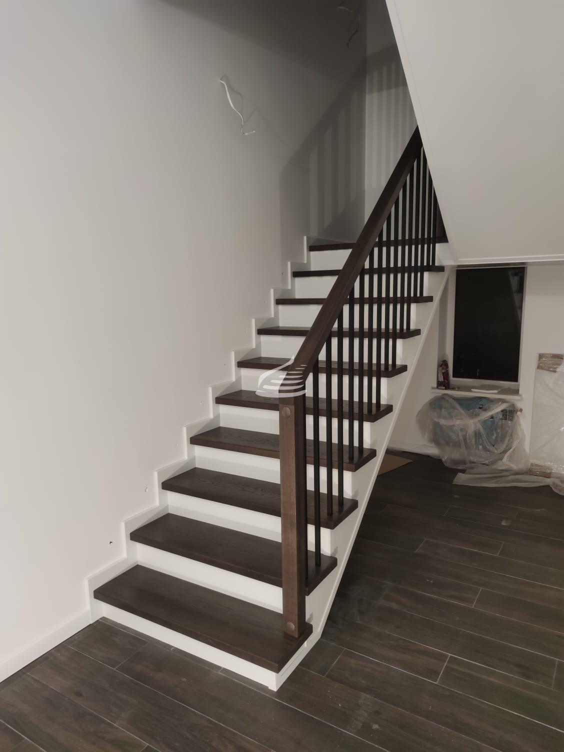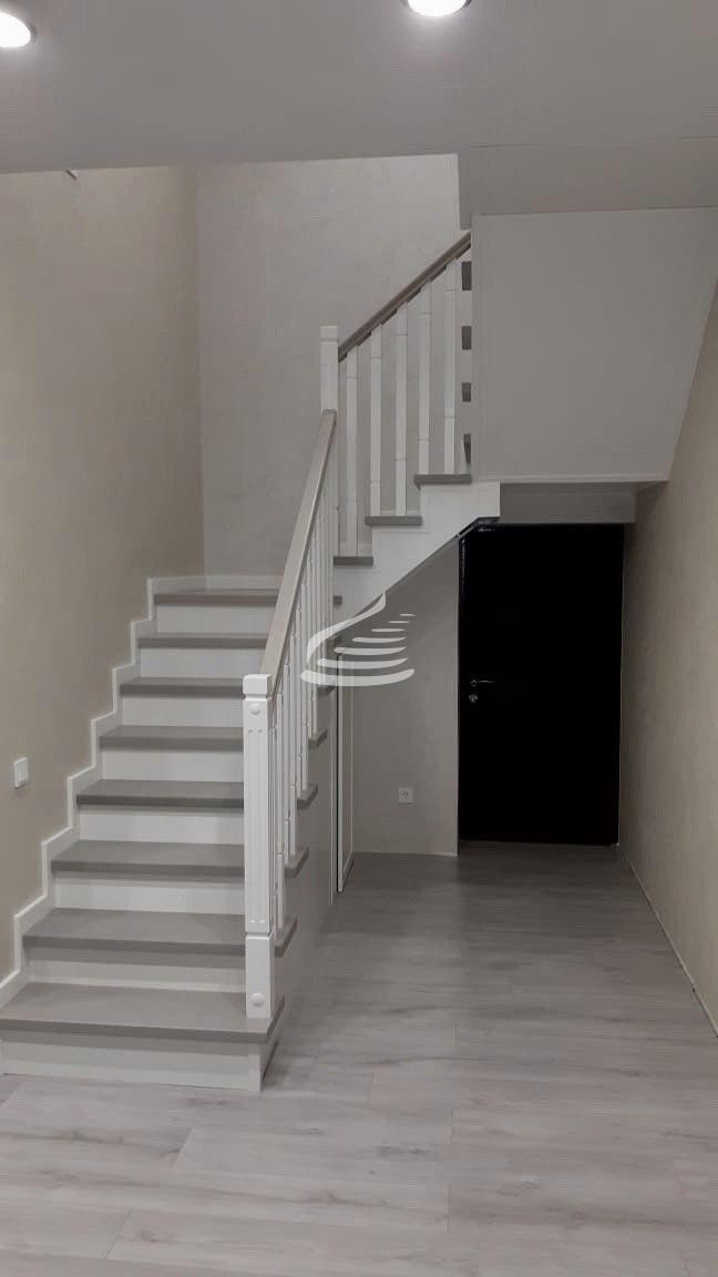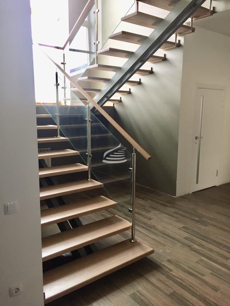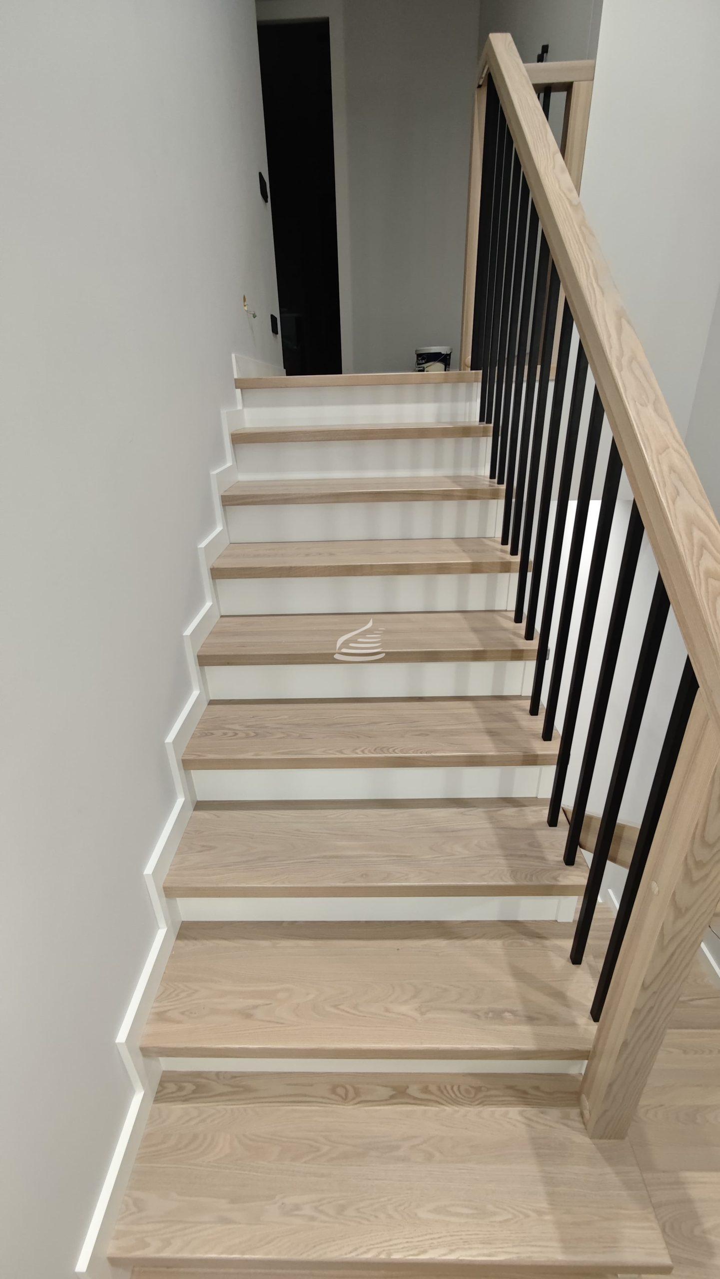 Лестница между стен, с пристенным поручнем и подиумными ступенями, в серых тонах, из цельноламельного Ясеня. Обшивка готового металлокаркаса.