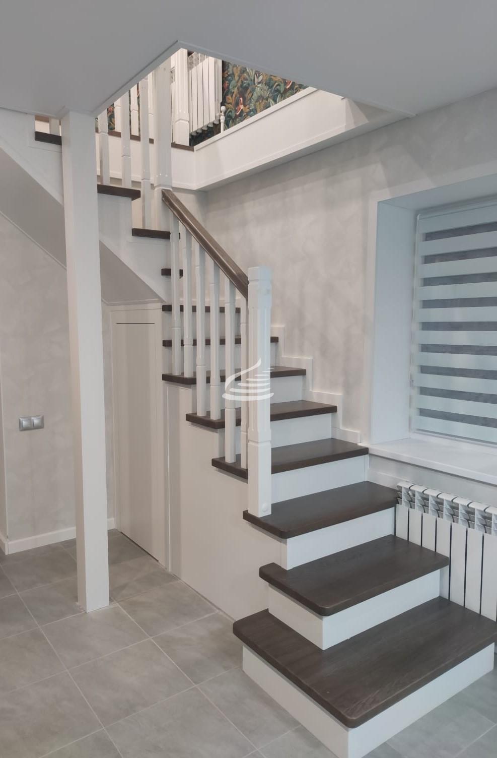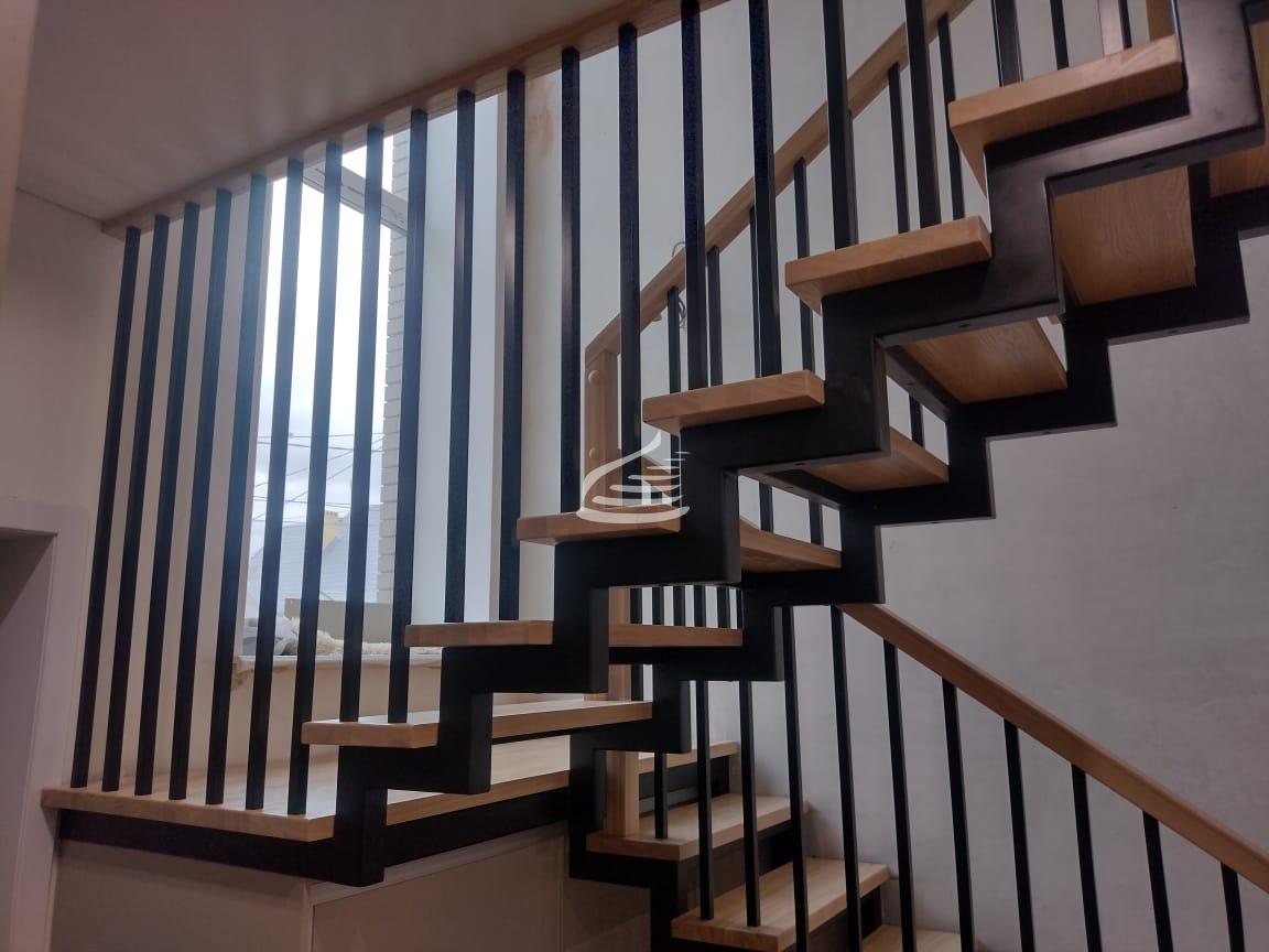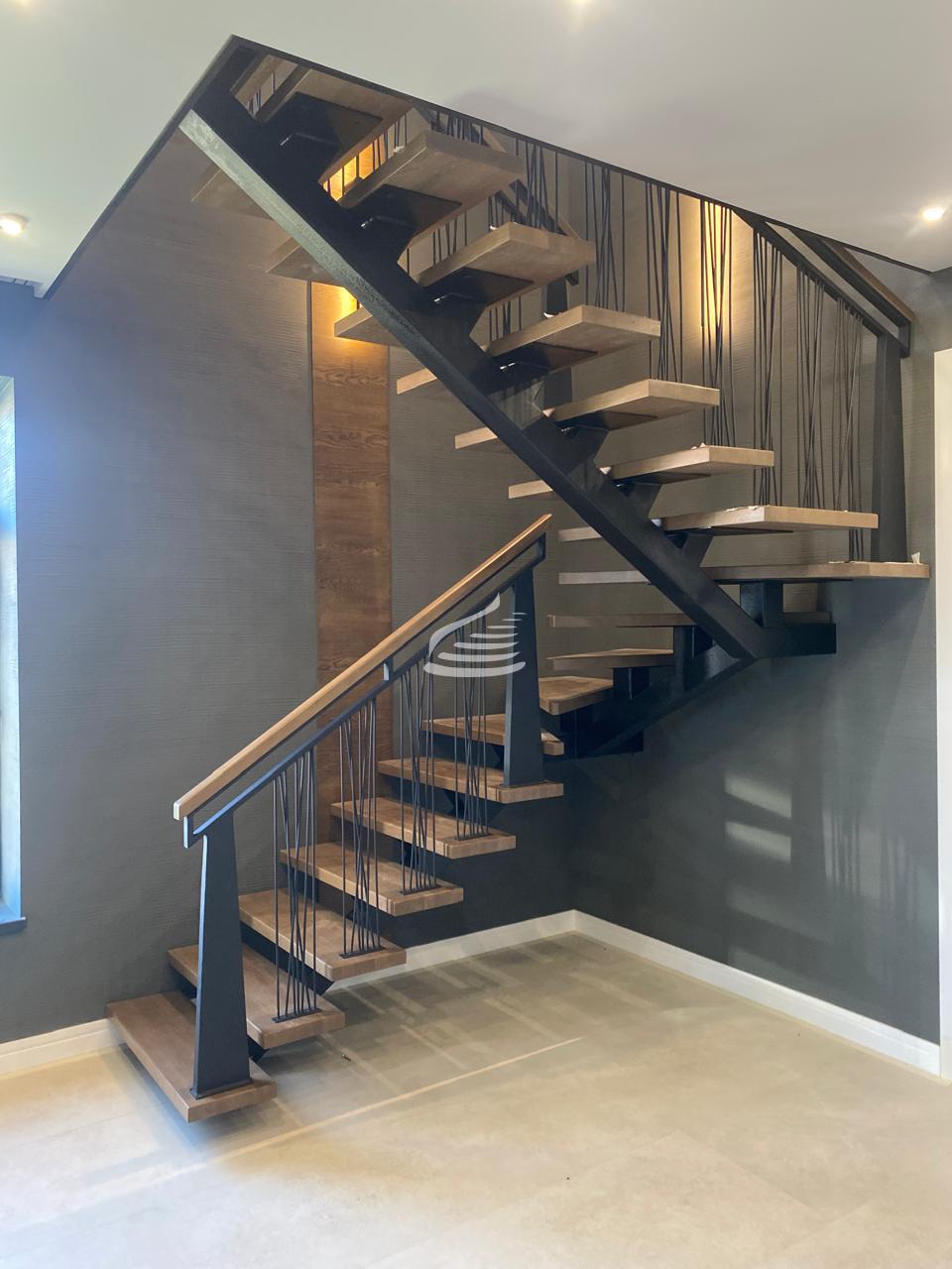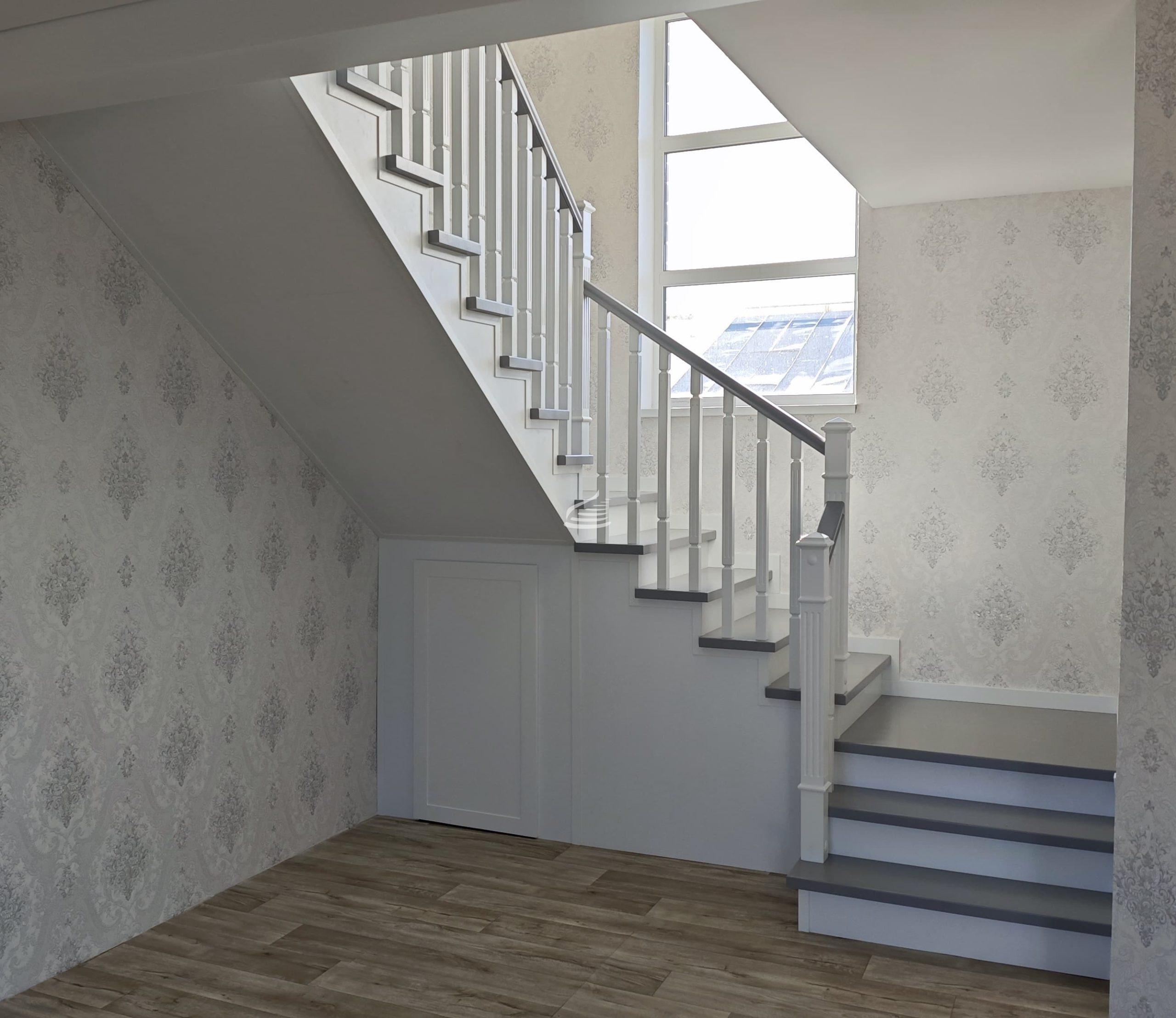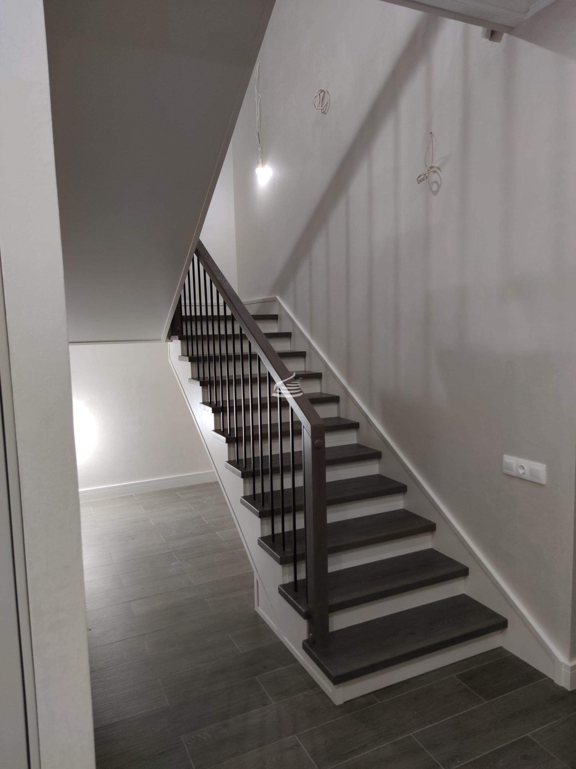 Лестница между стен, с пристенным поручнем и подиумными ступенями, в серых тонах, из цельноламельного Ясеня. Обшивка готового металлокаркаса.