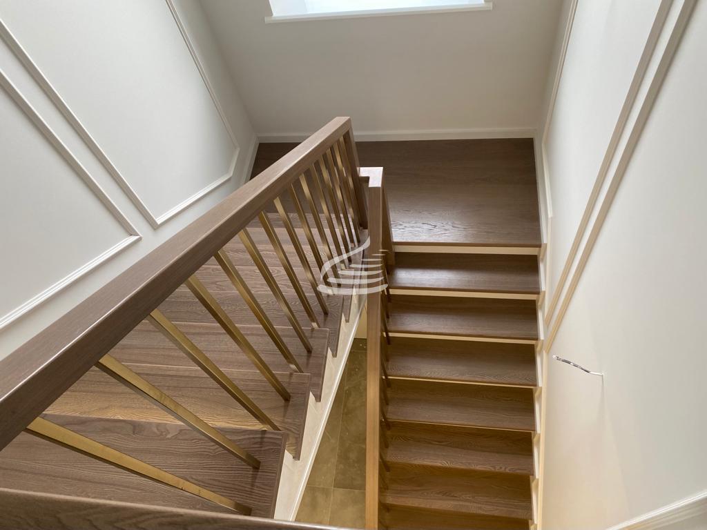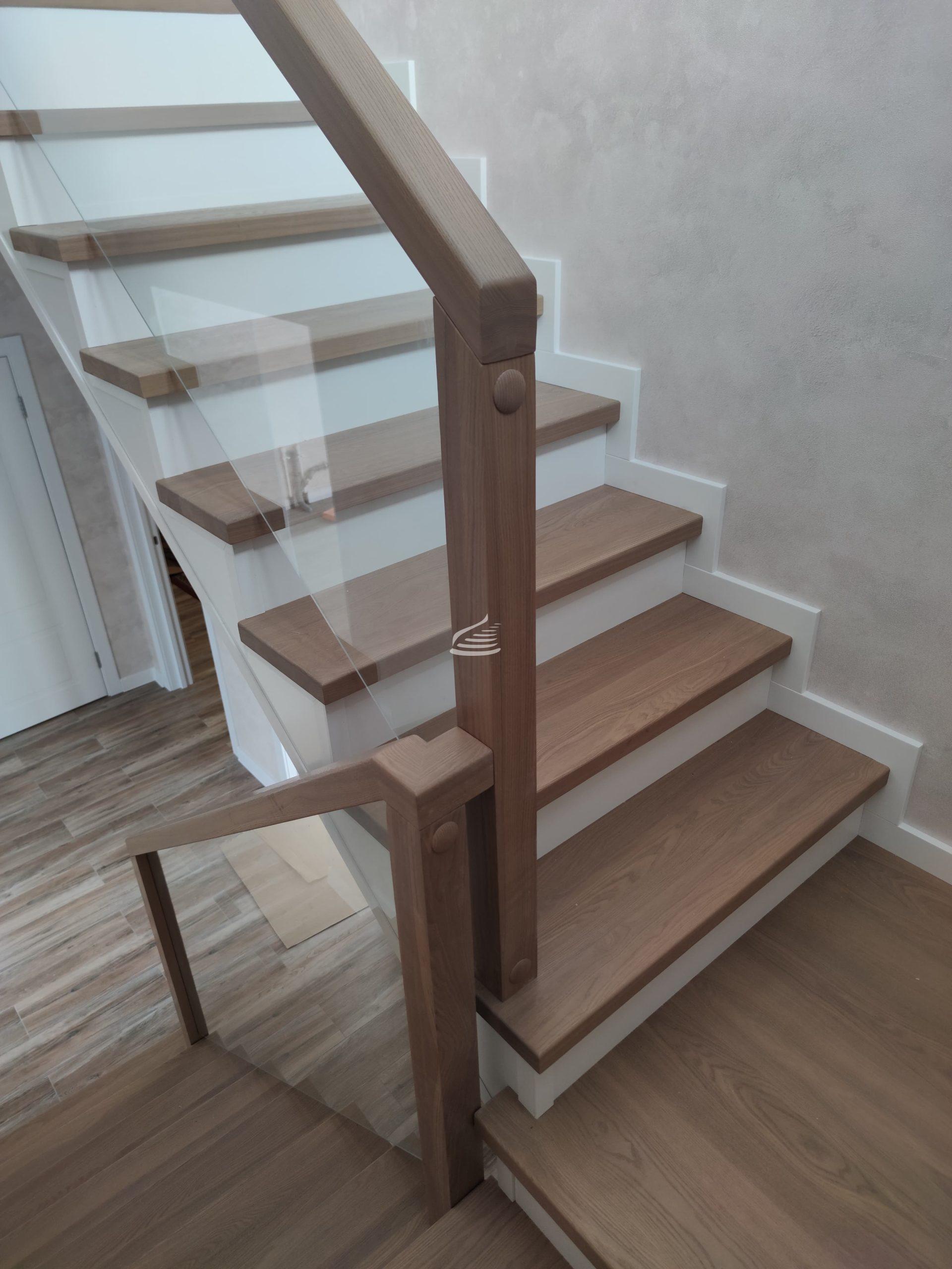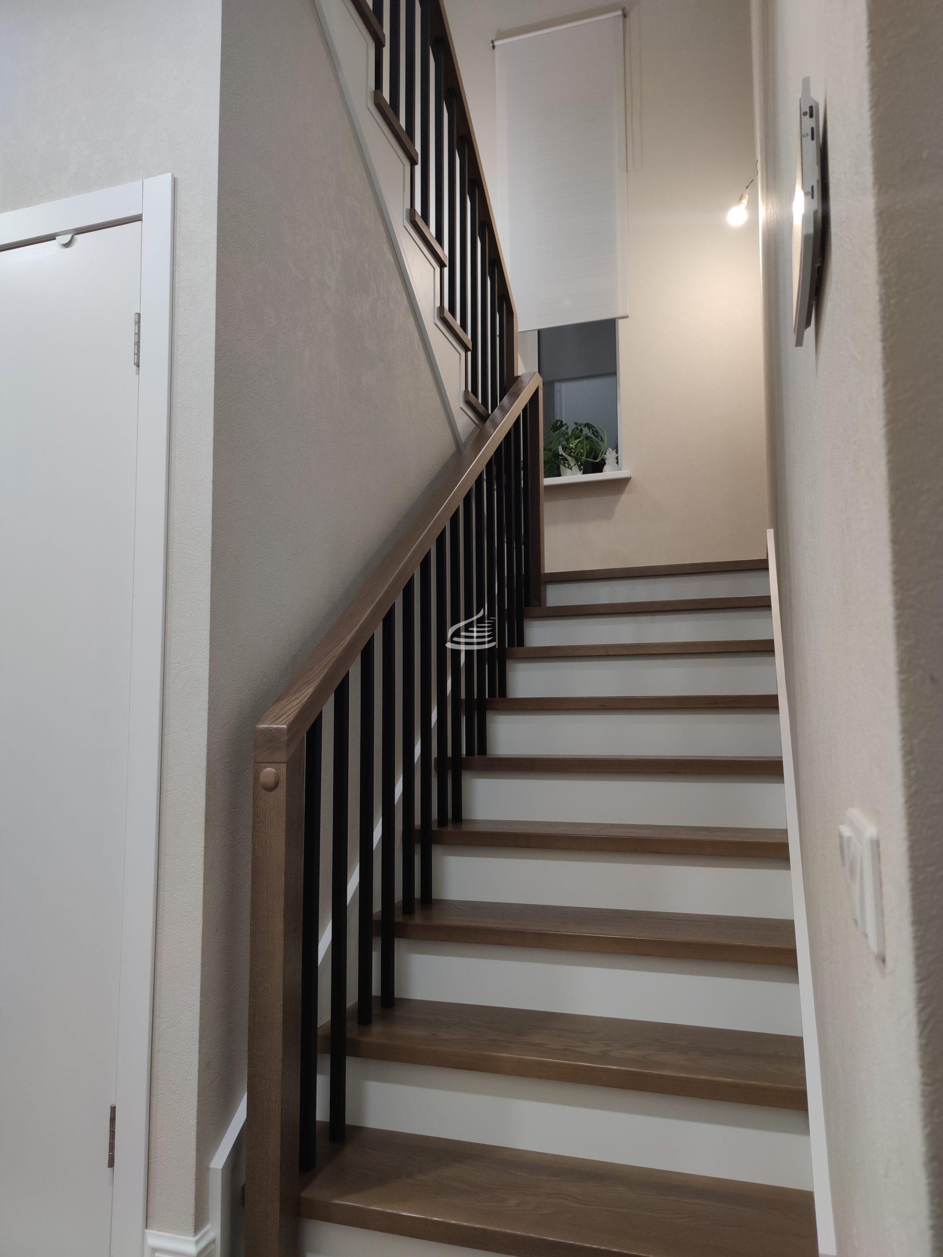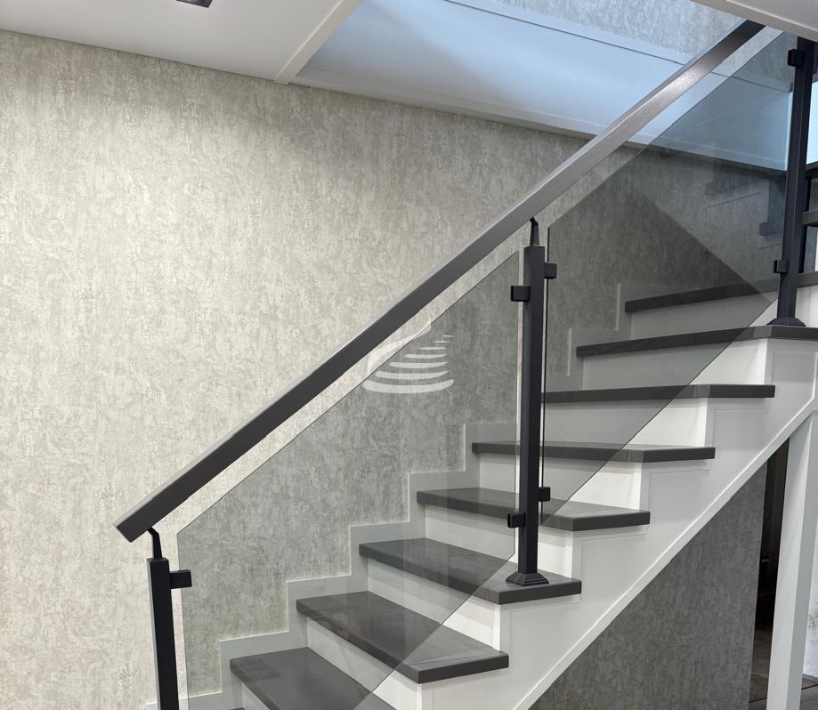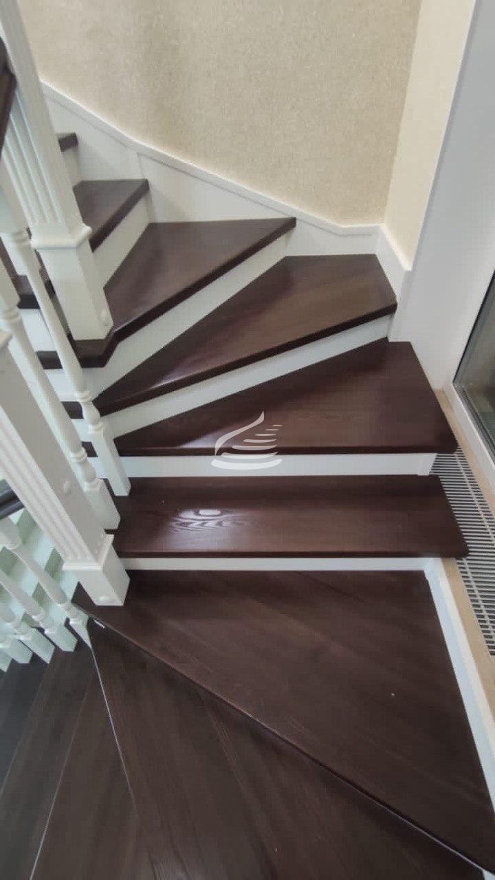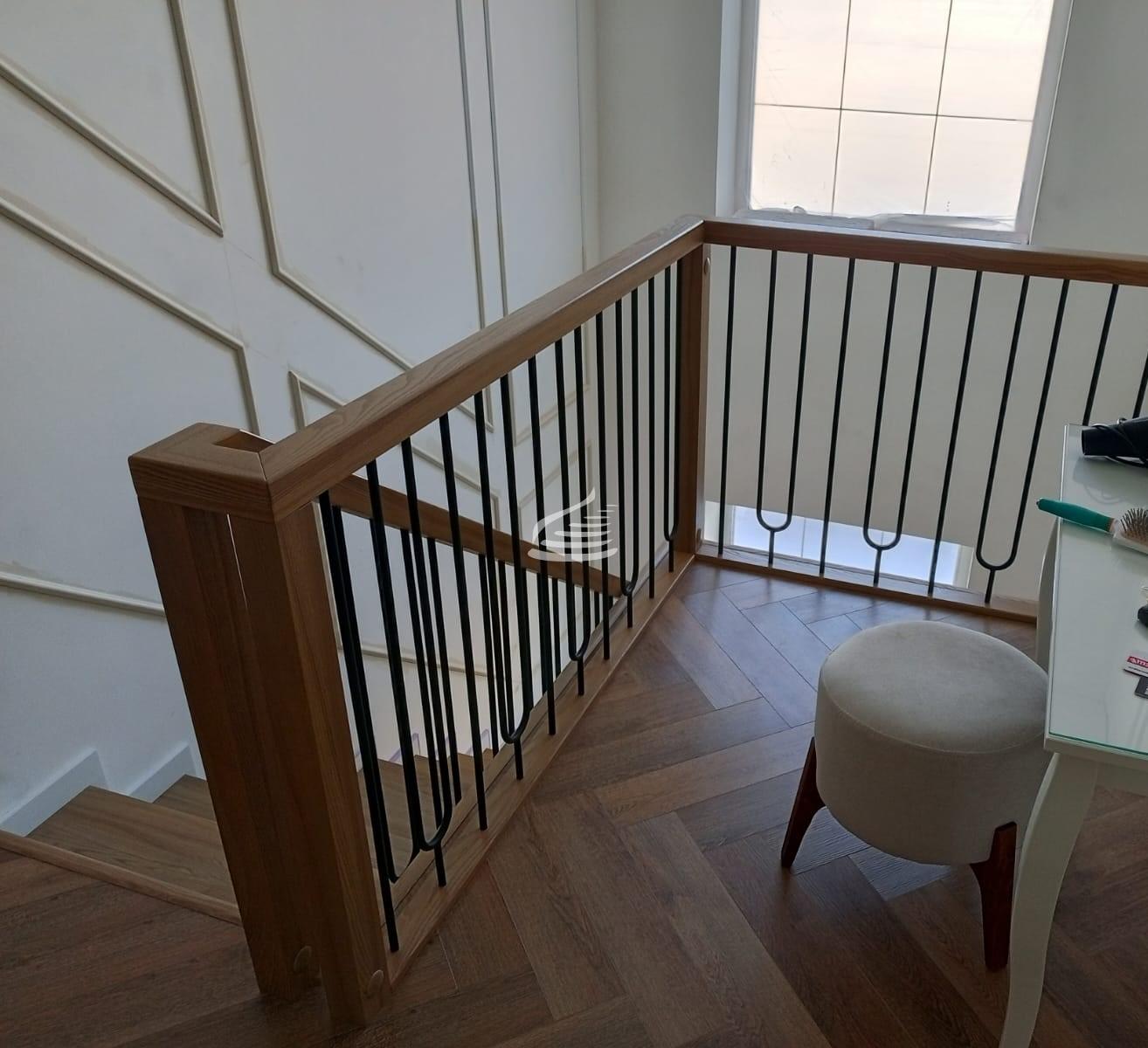Лестница между стен, с пристенным поручнем и подиумными ступенями, в серых тонах, из цельноламельного Ясеня. Обшивка готового металлокаркаса.