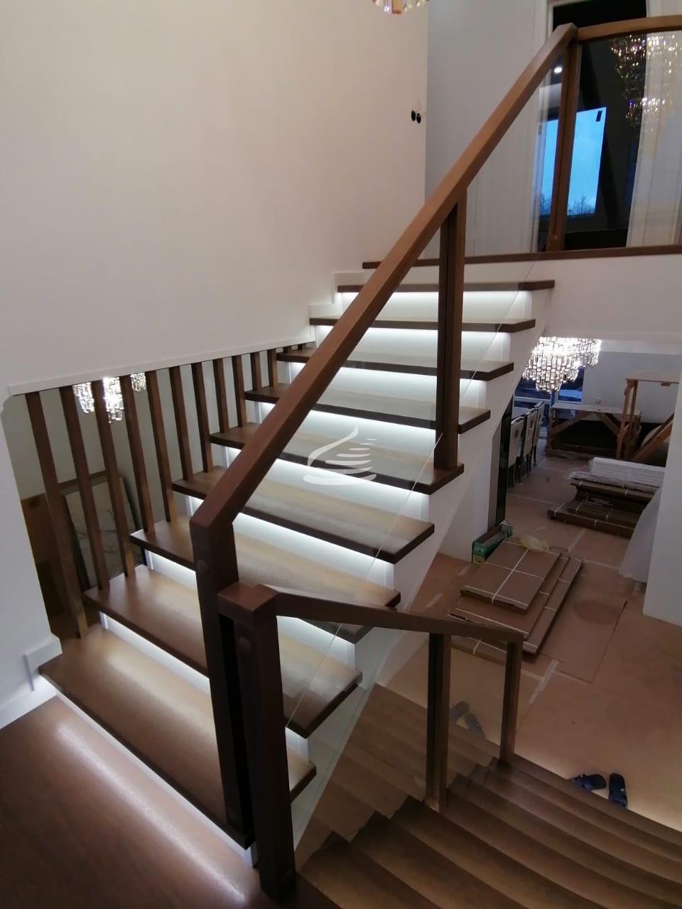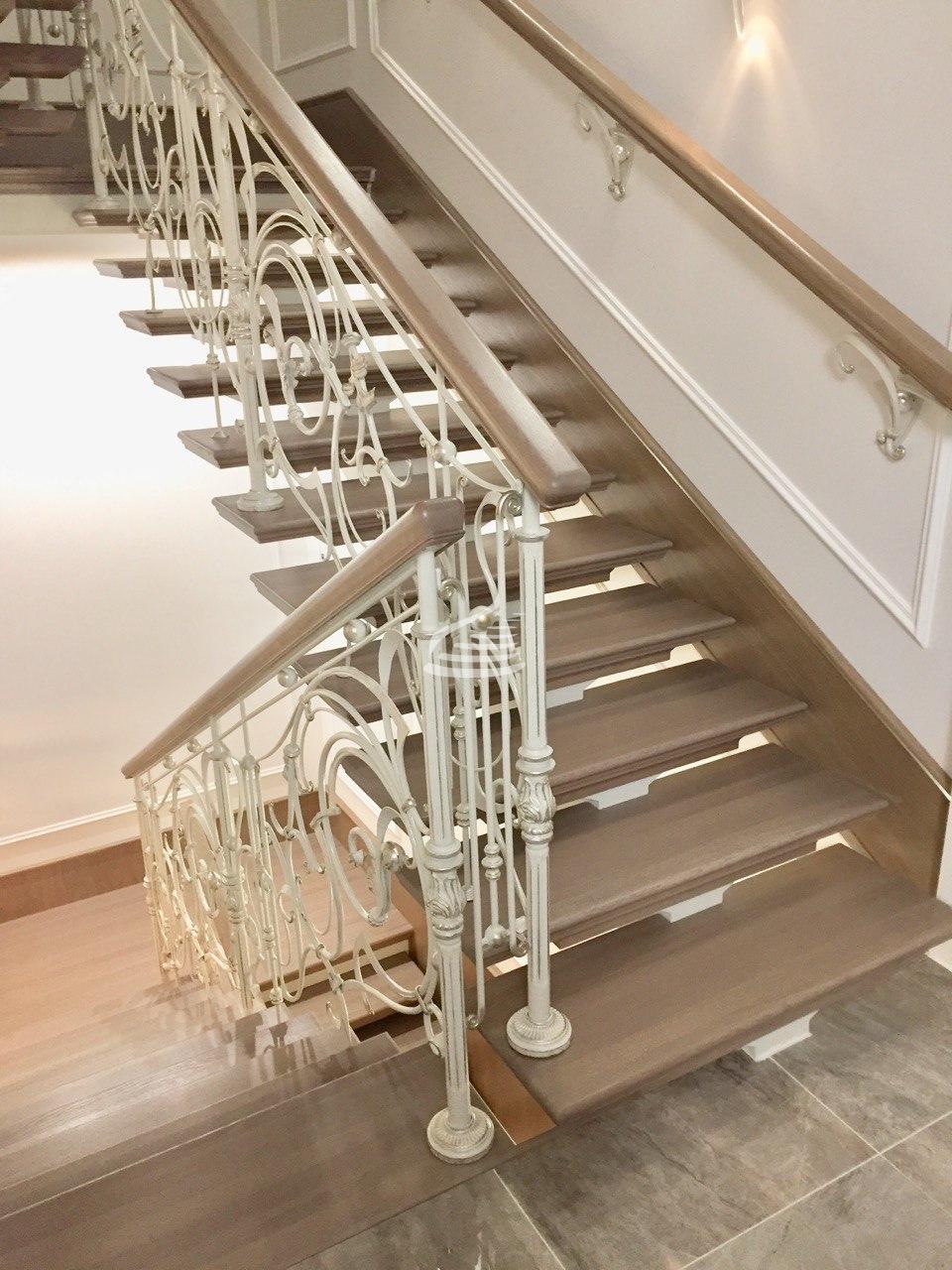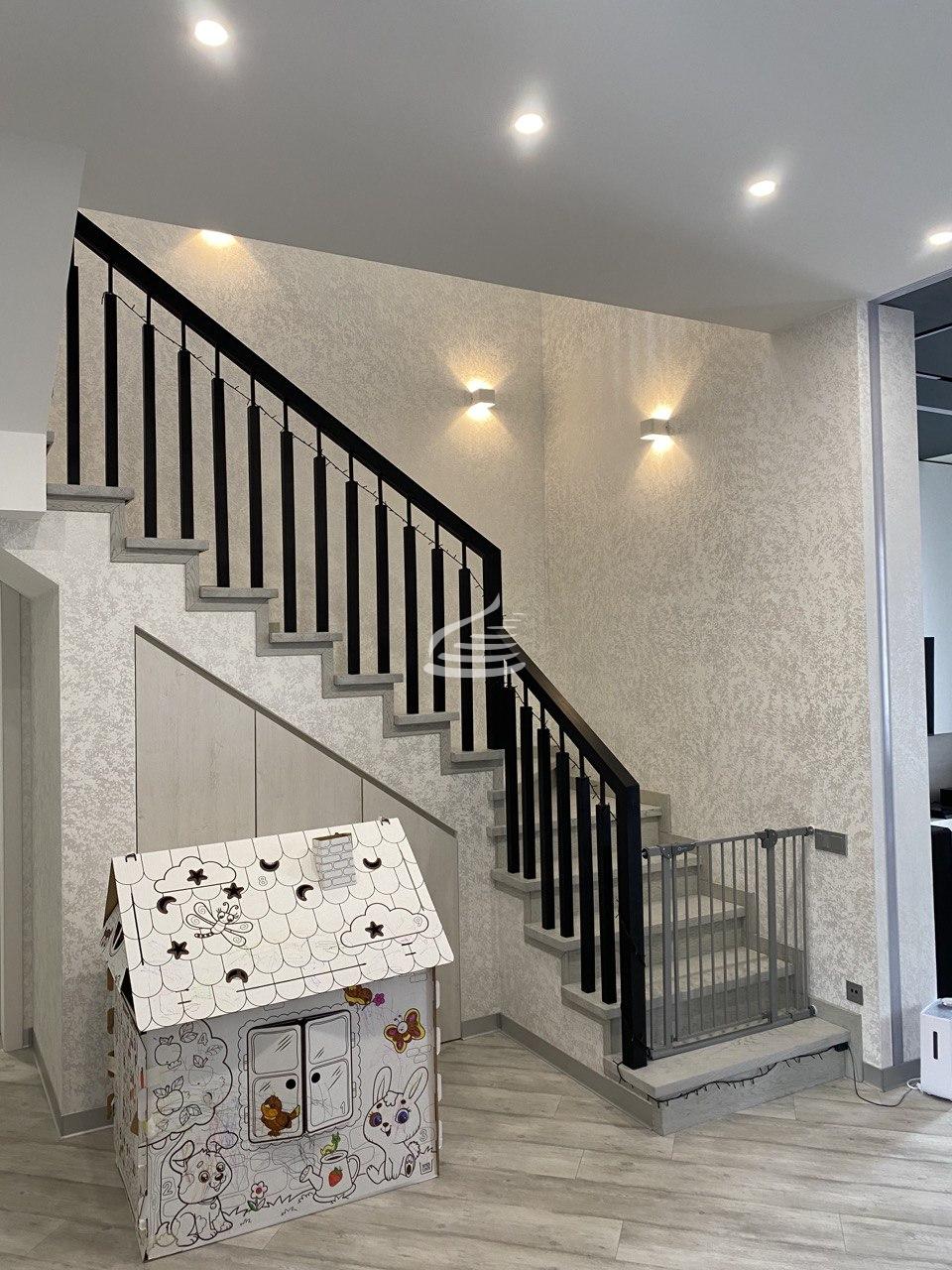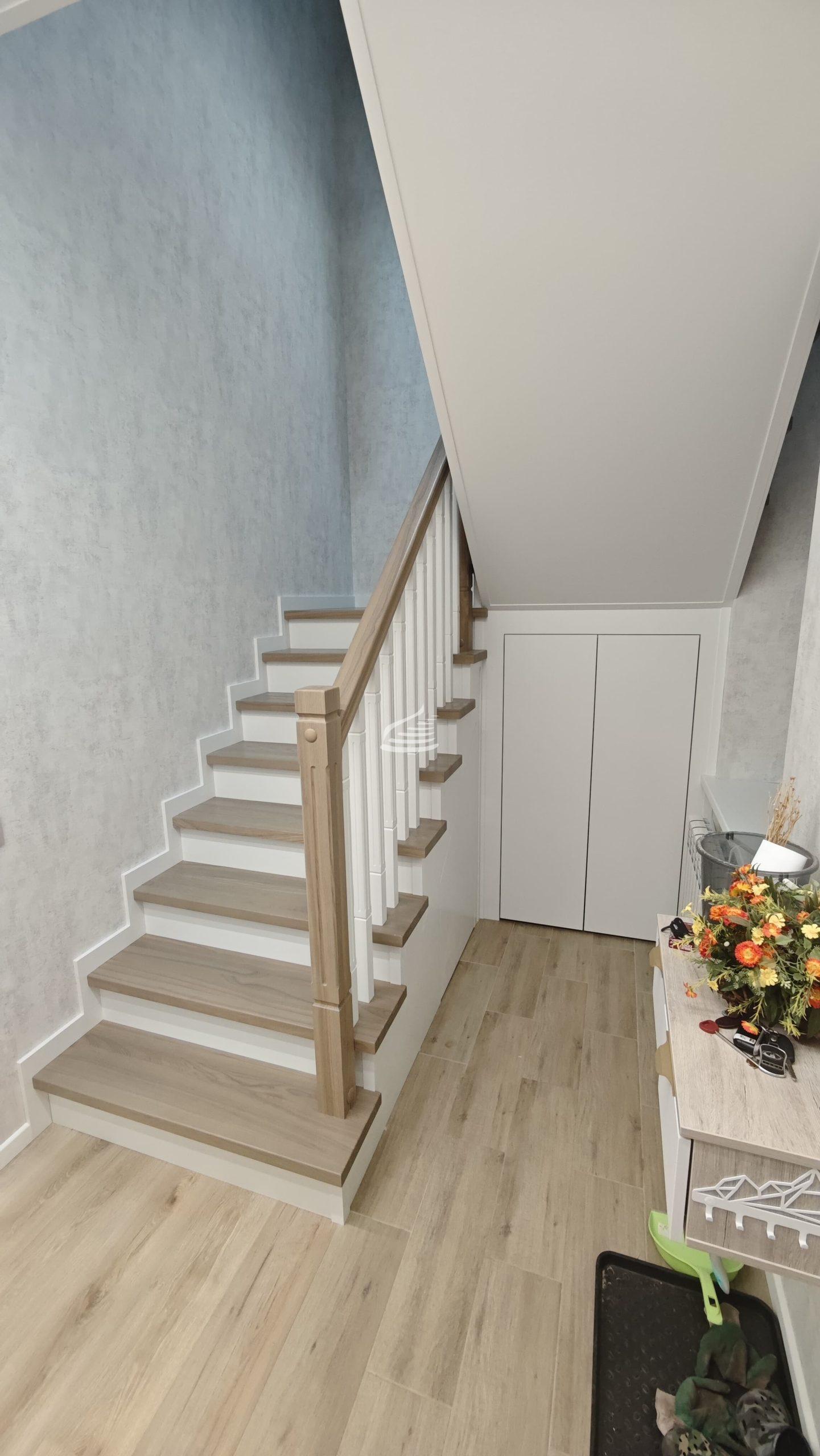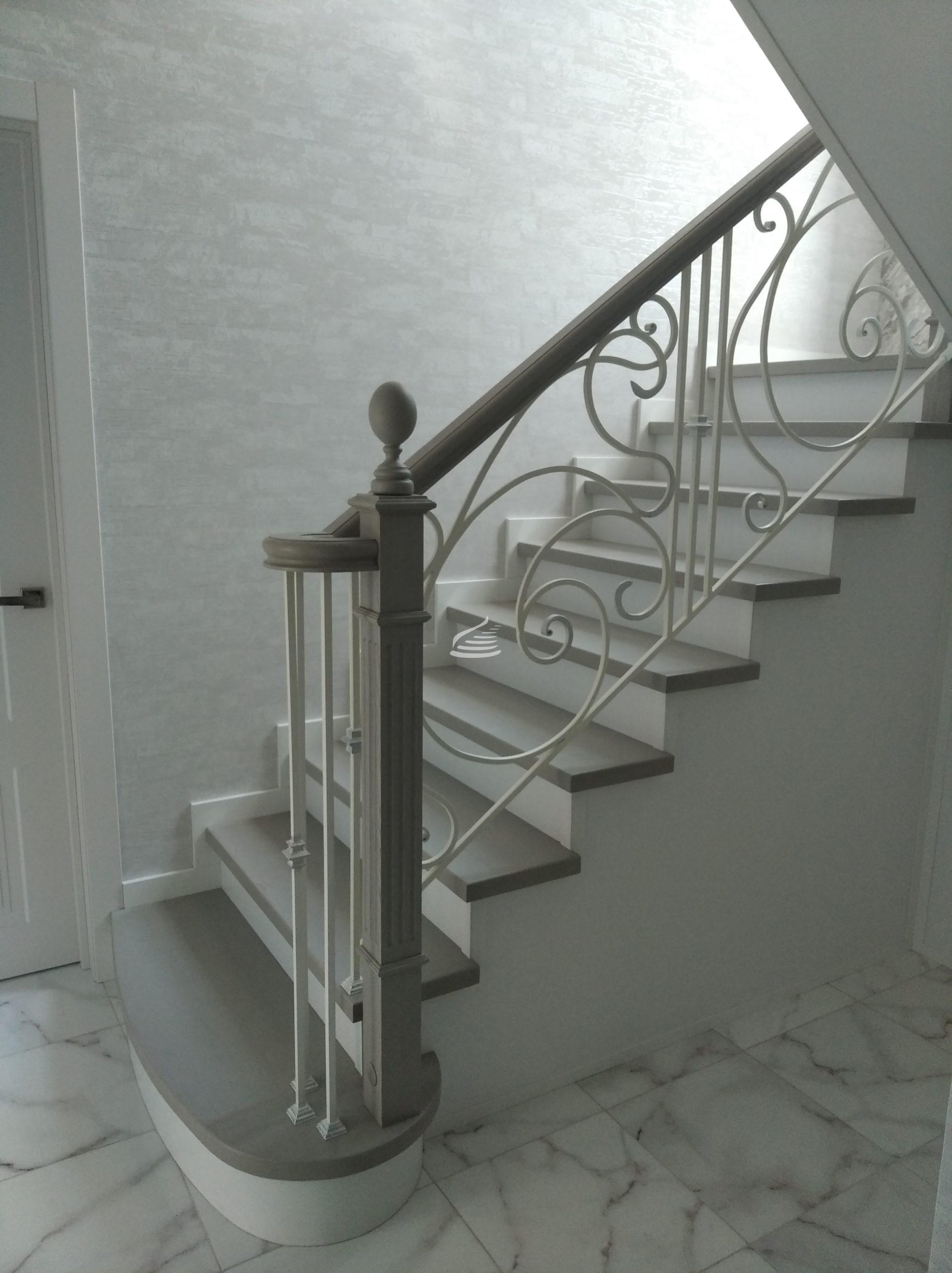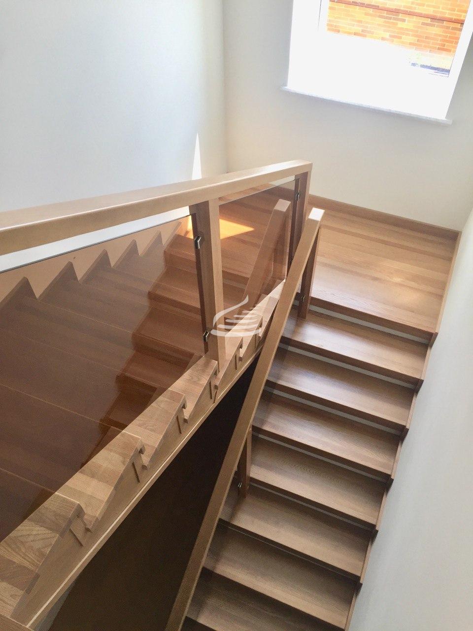 Лестница между стен, с пристенным поручнем и подиумными ступенями, в серых тонах, из цельноламельного Ясеня. Обшивка готового металлокаркаса.