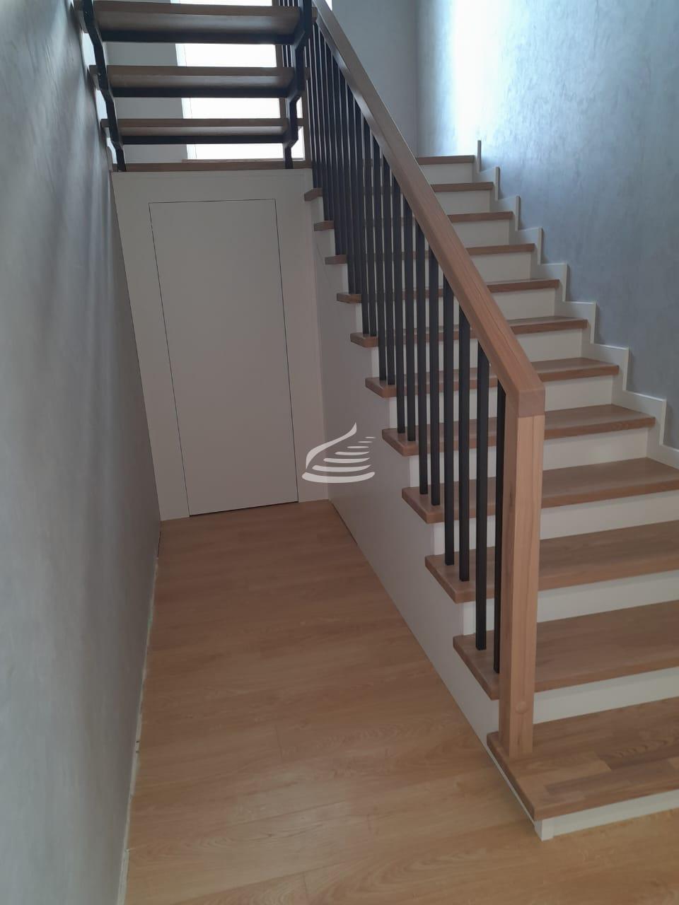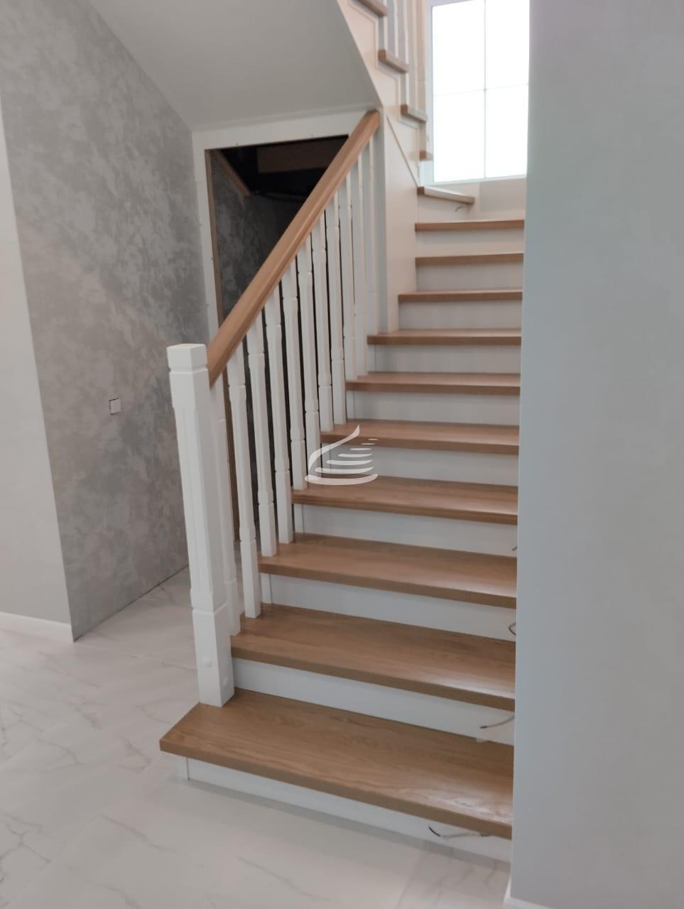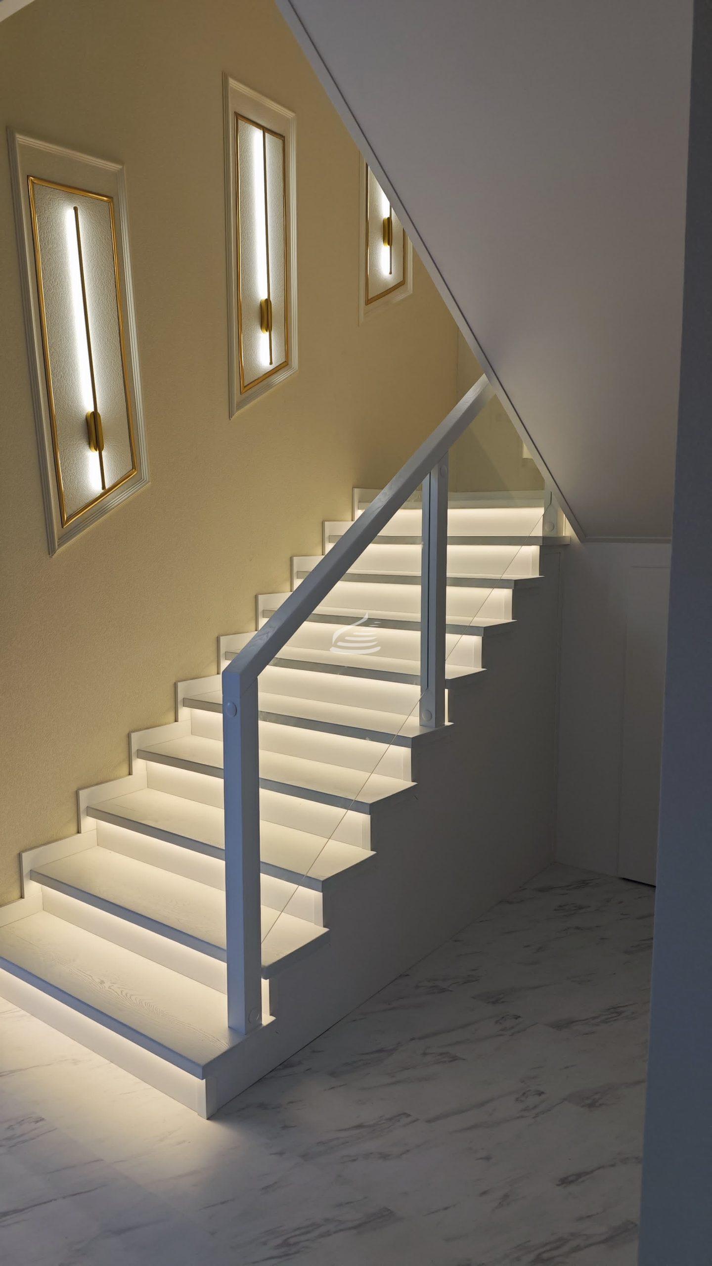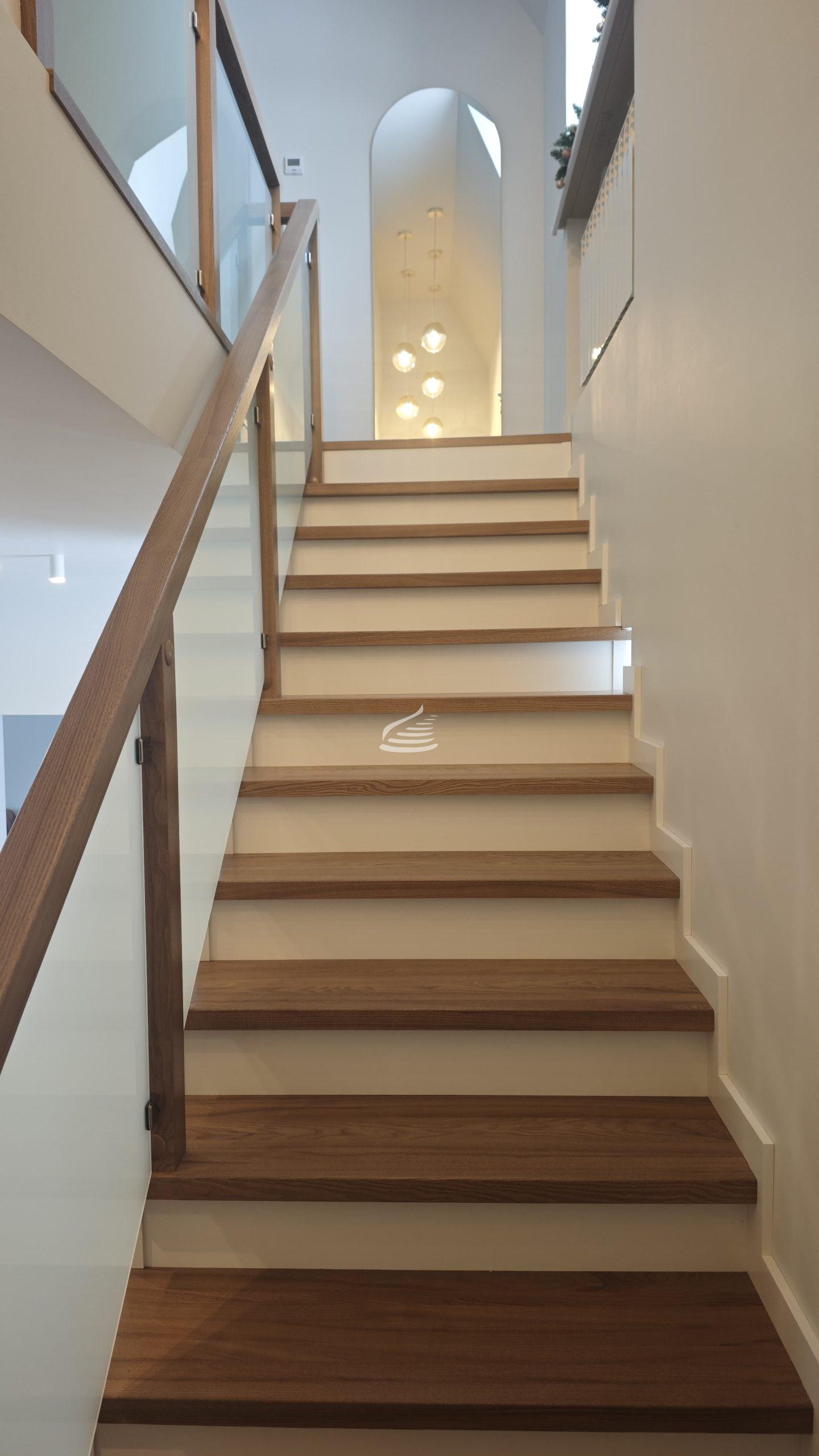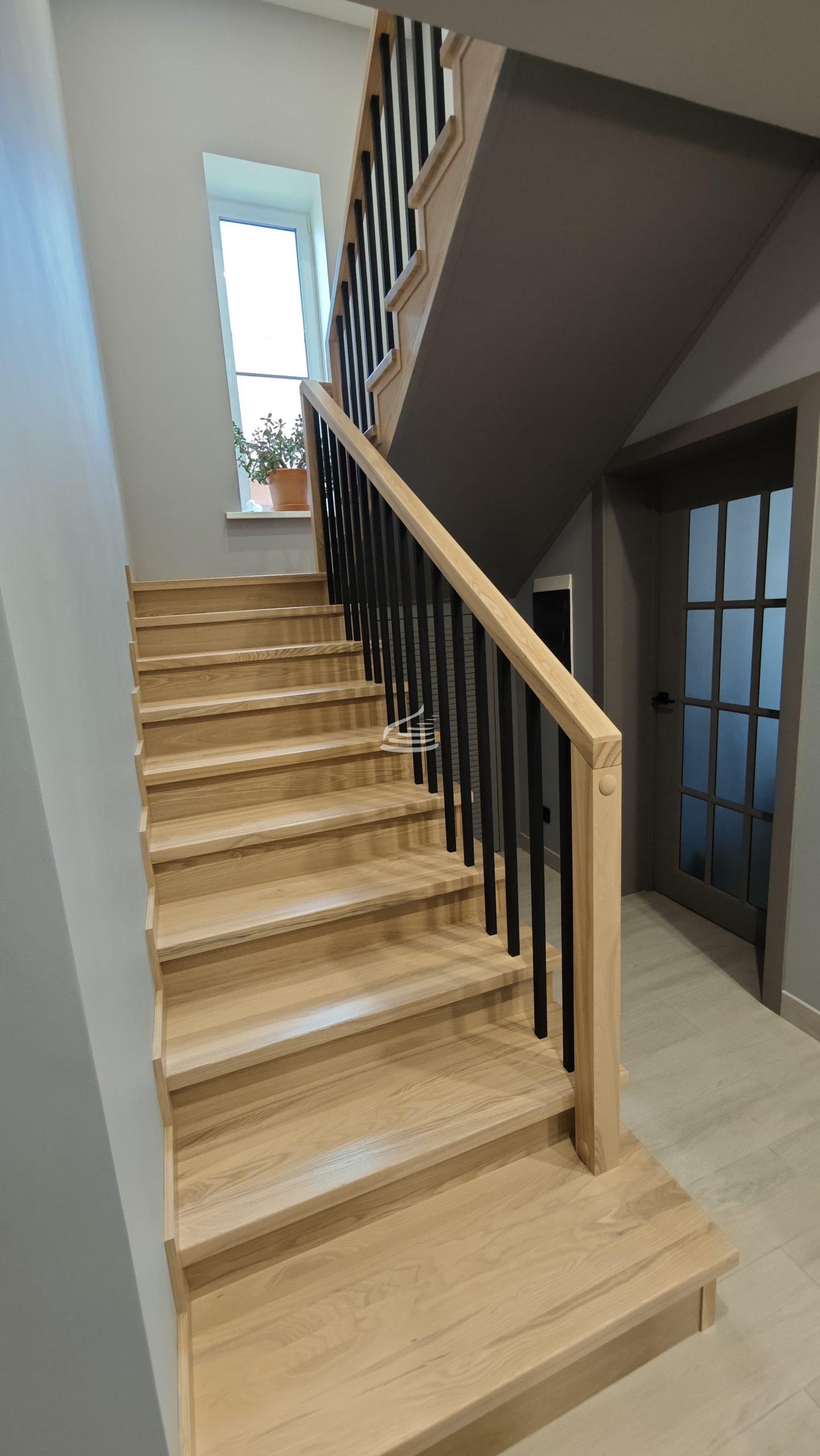 Лестница между стен, с пристенным поручнем и подиумными ступенями, в серых тонах, из цельноламельного Ясеня. Обшивка готового металлокаркаса.