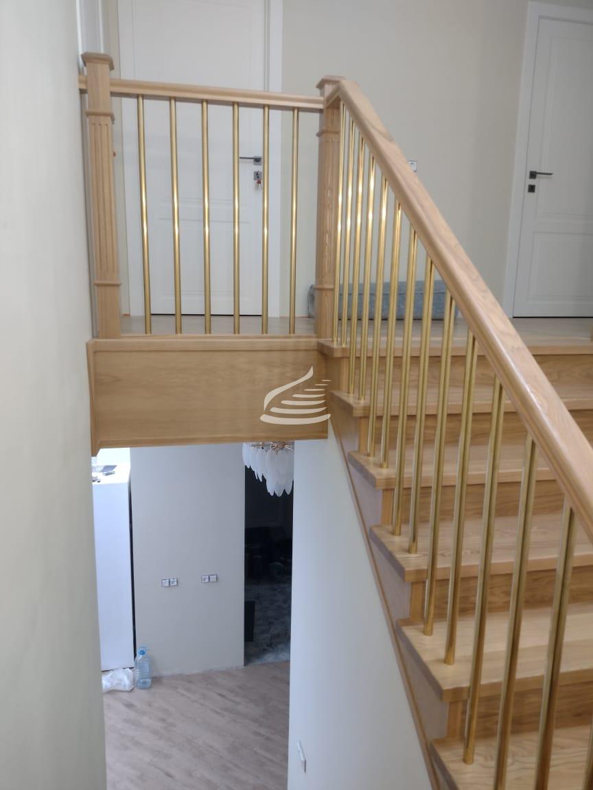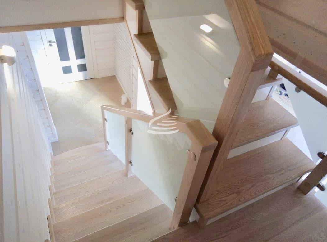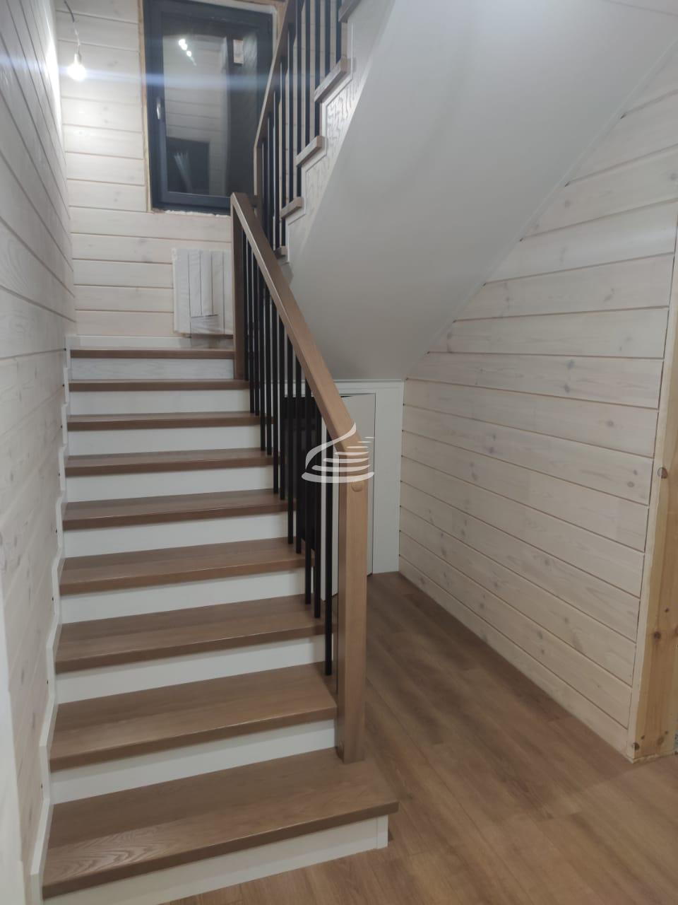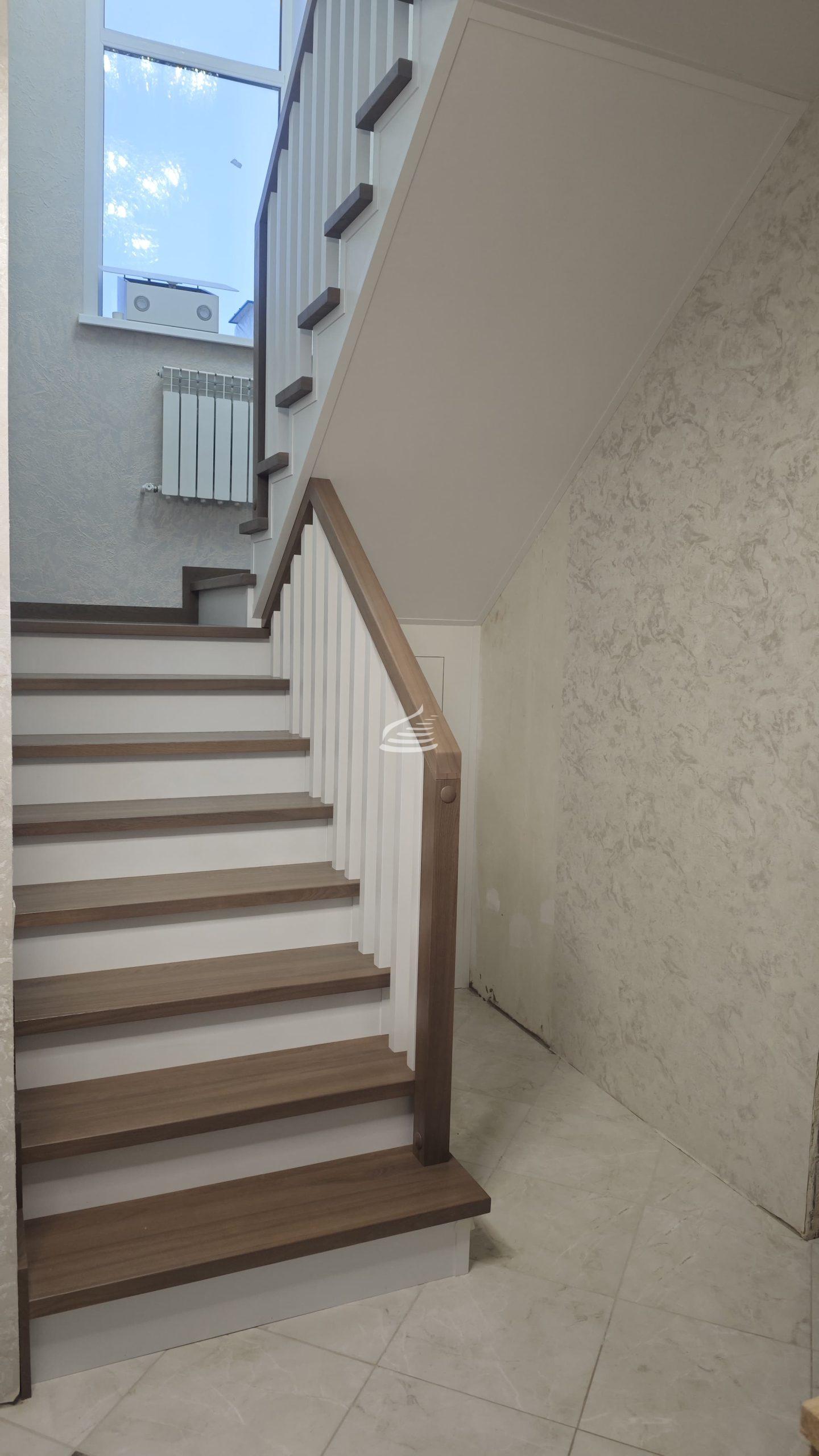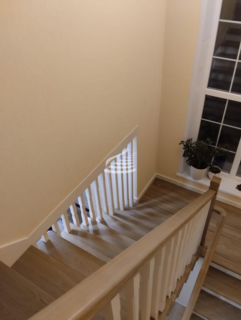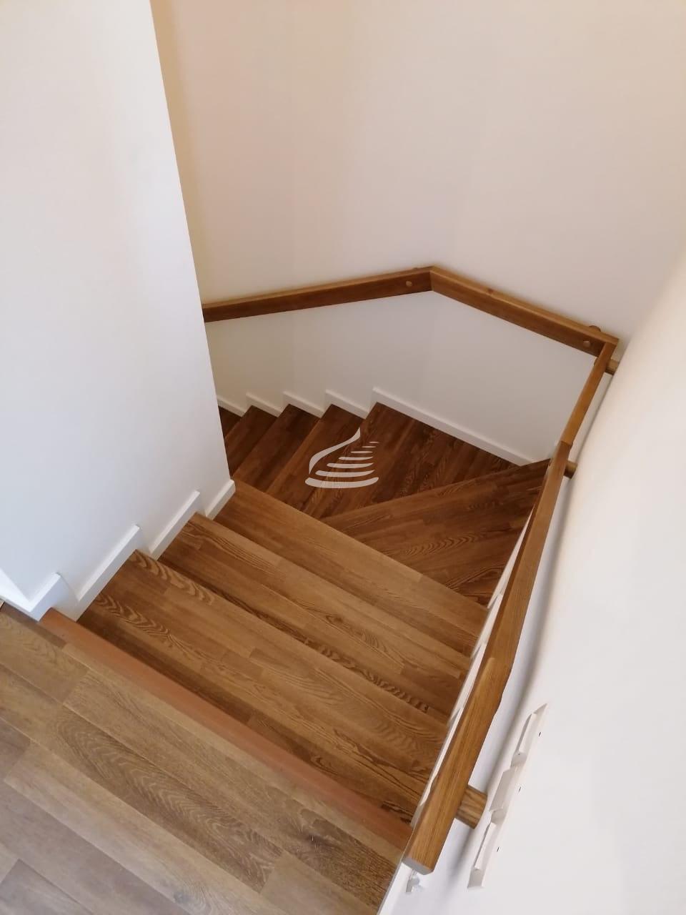 Лестница между стен, с пристенным поручнем и подиумными ступенями, в серых тонах, из цельноламельного Ясеня. Обшивка готового металлокаркаса.