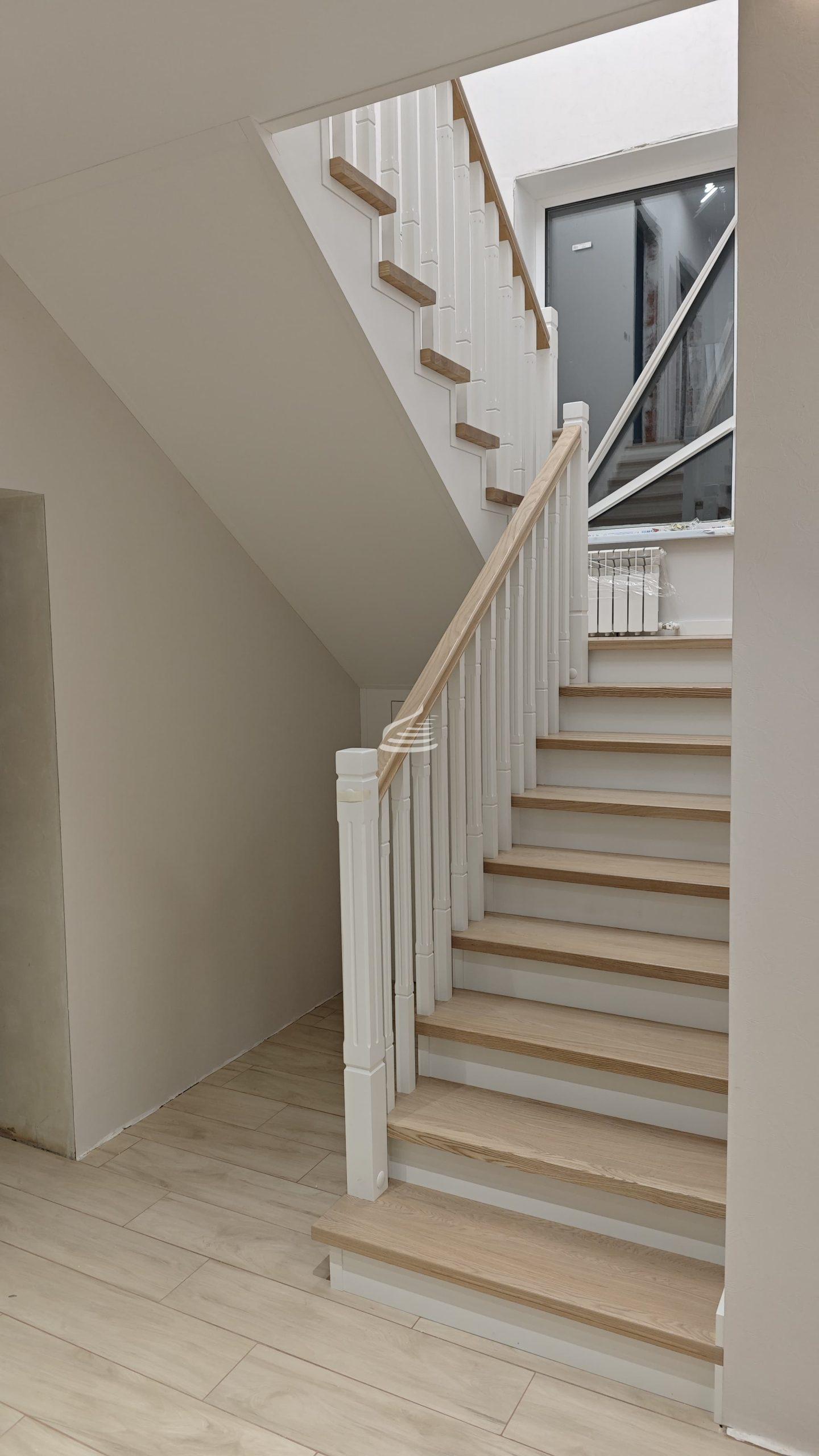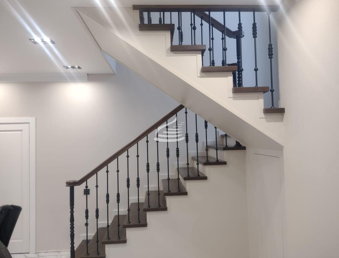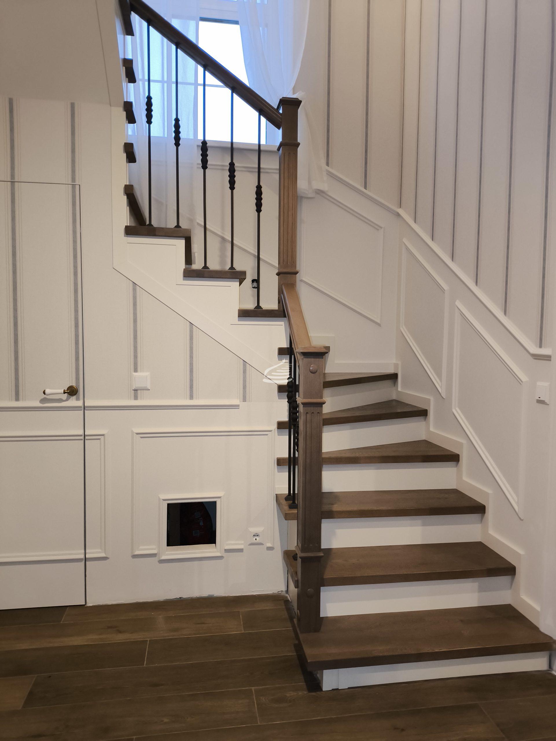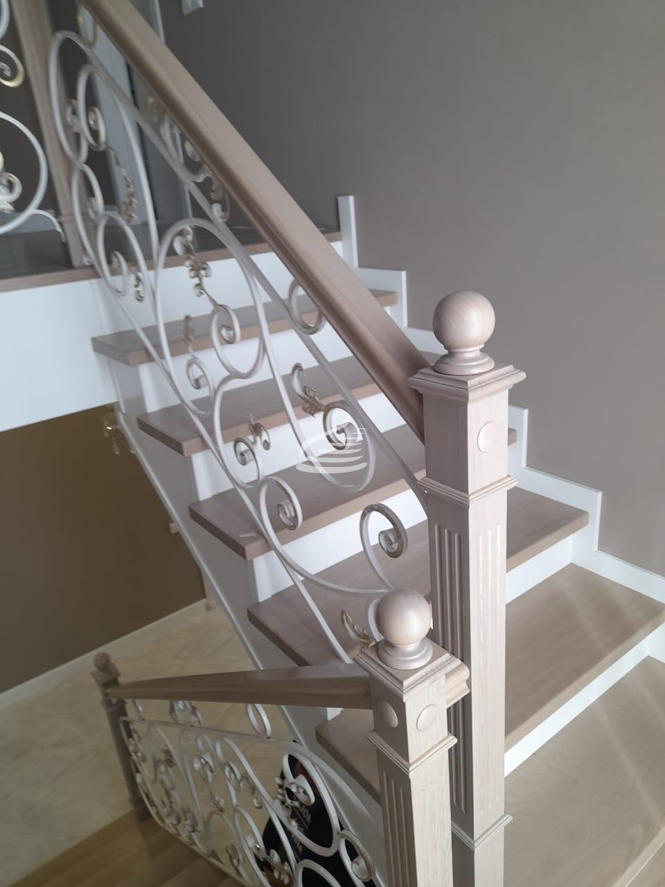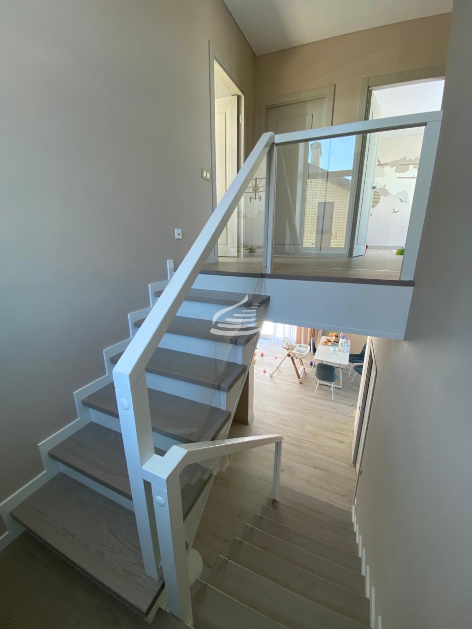 Лестница между стен, с пристенным поручнем и подиумными ступенями, в серых тонах, из цельноламельного Ясеня. Обшивка готового металлокаркаса.