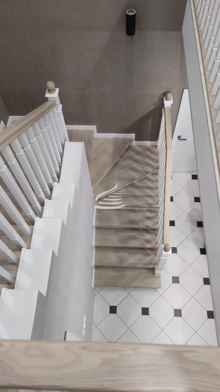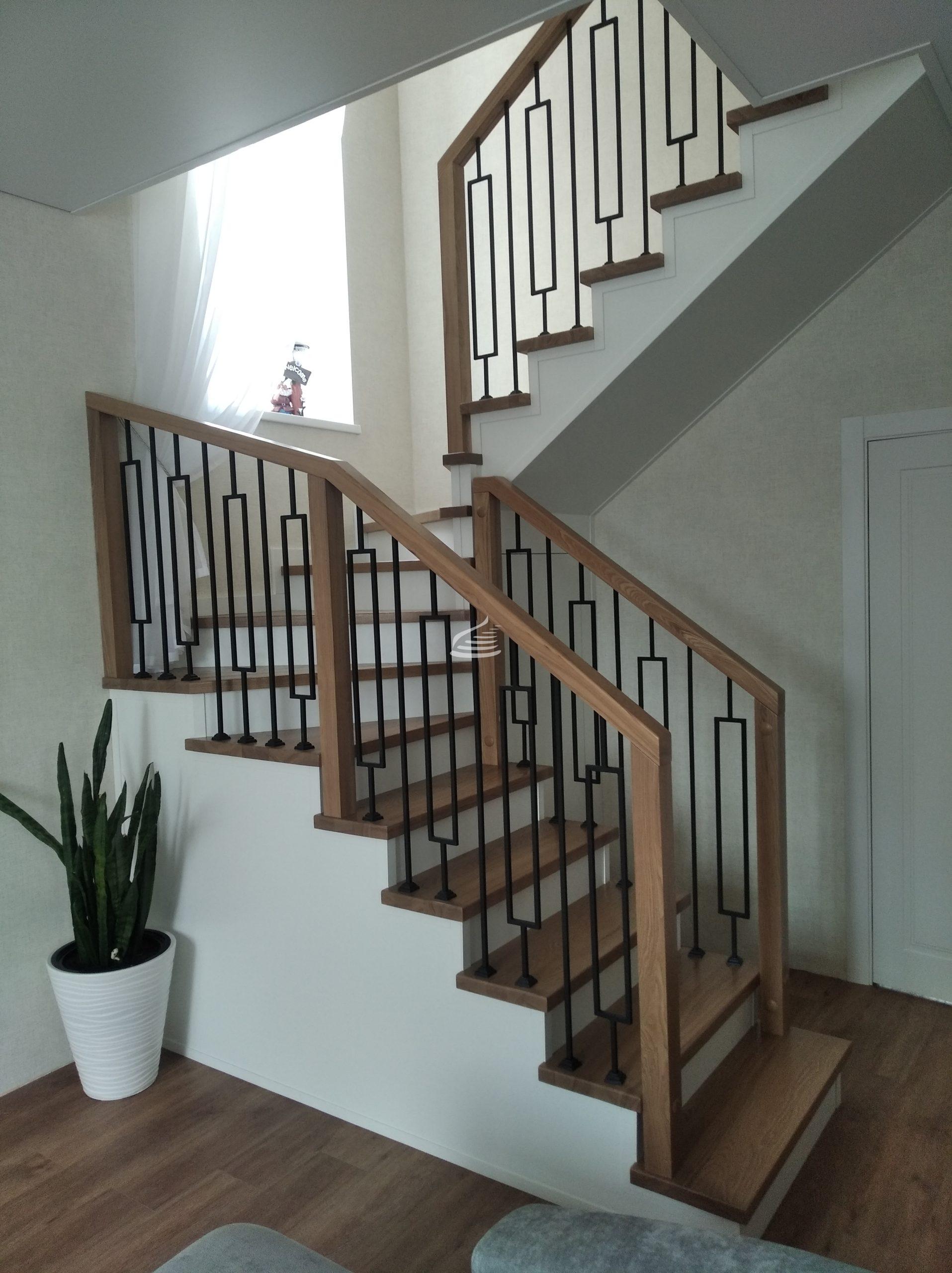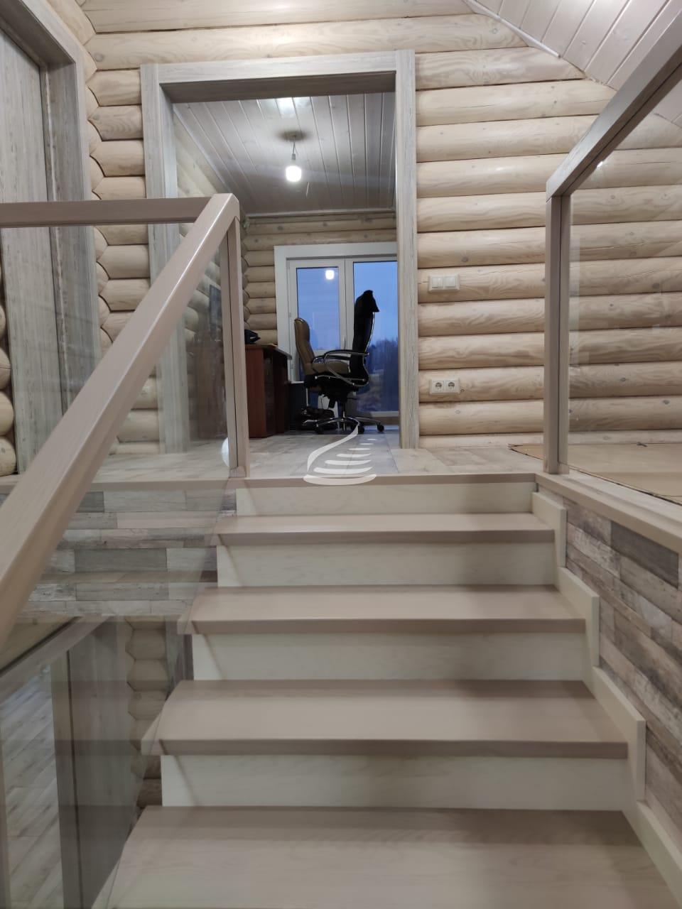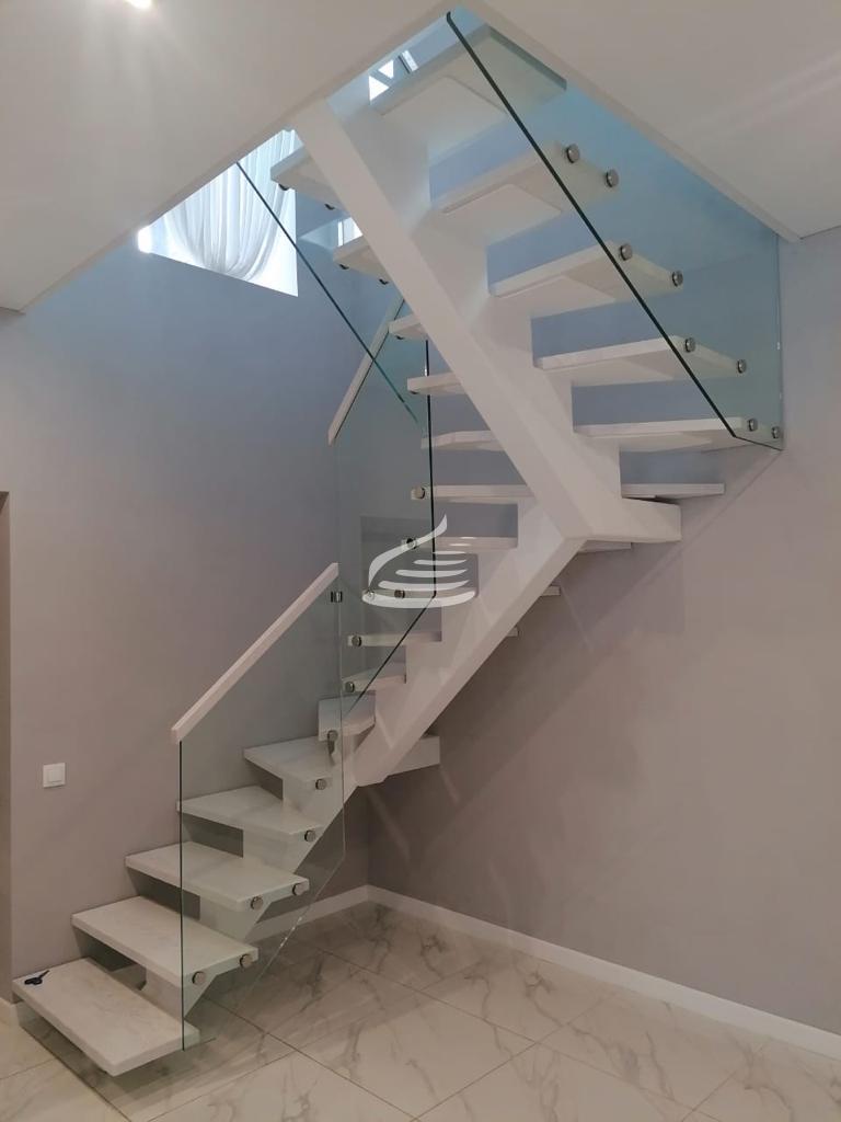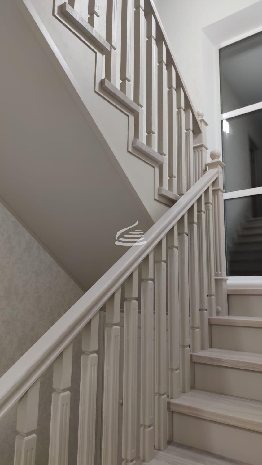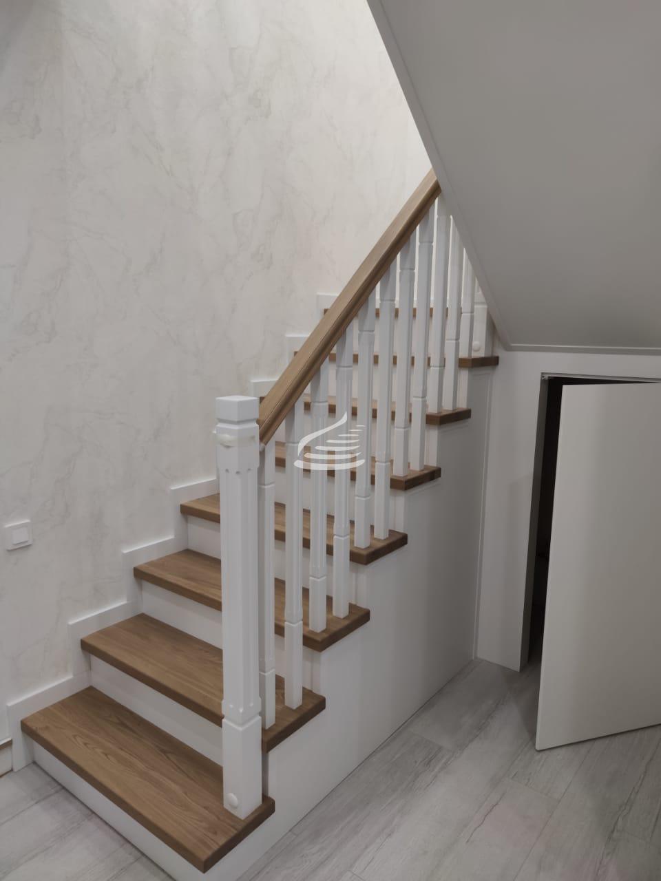 Лестница между стен, с пристенным поручнем и подиумными ступенями, в серых тонах, из цельноламельного Ясеня. Обшивка готового металлокаркаса.