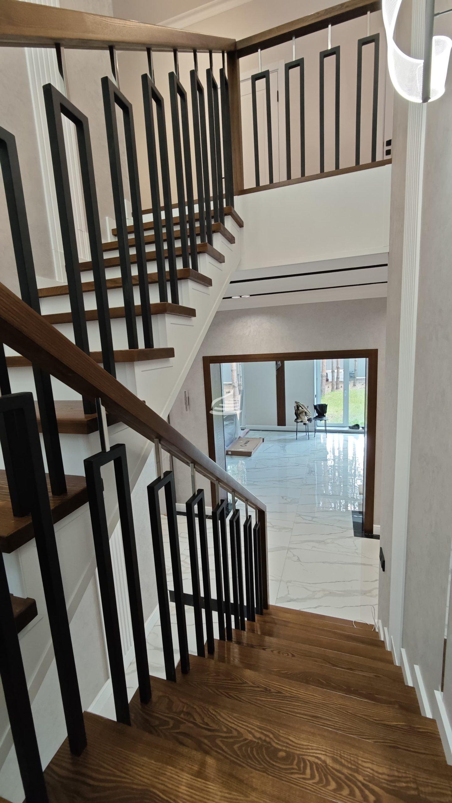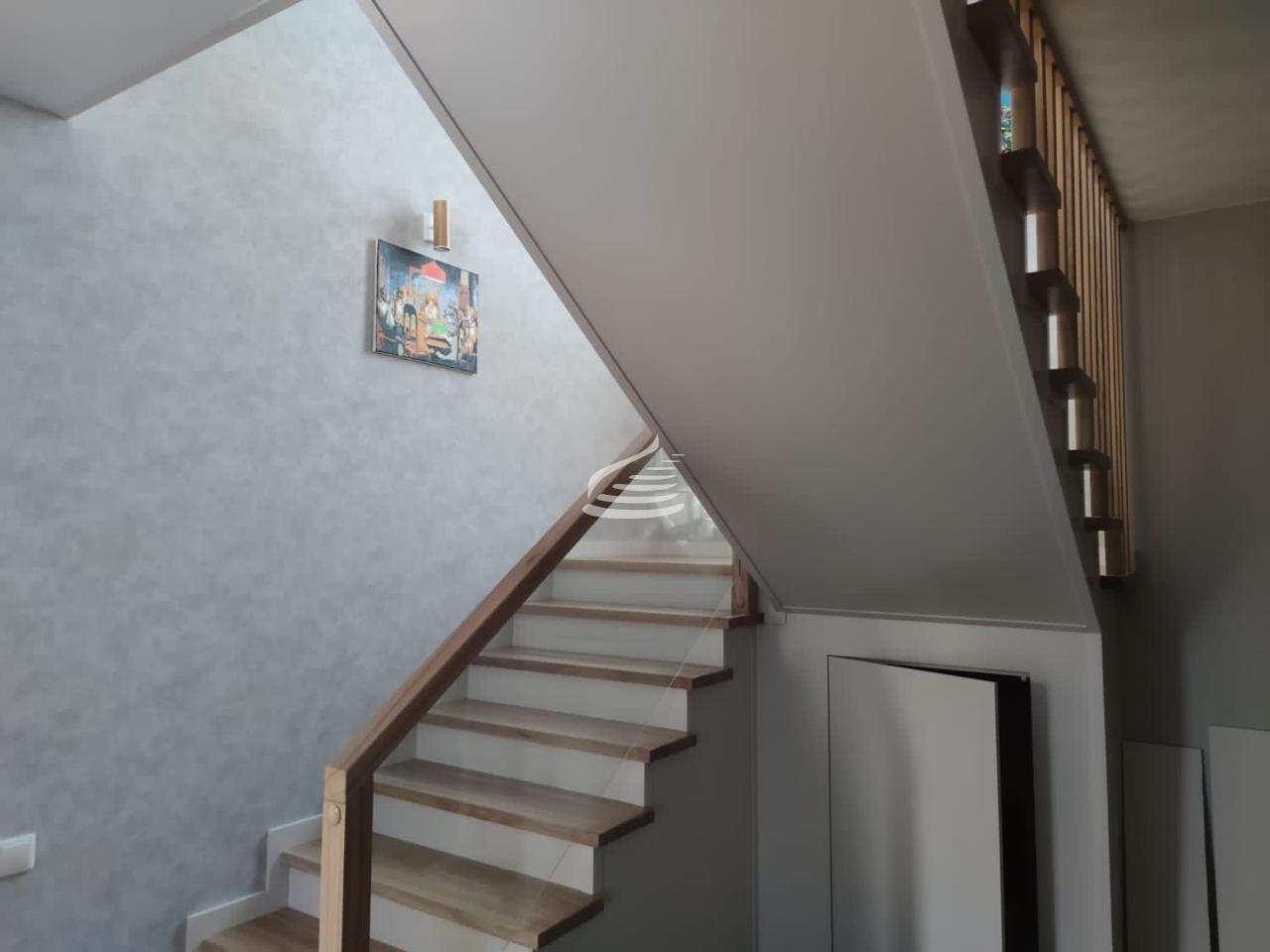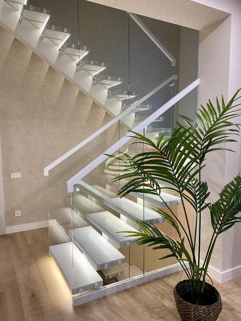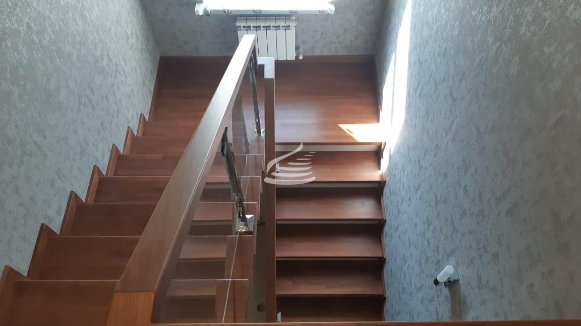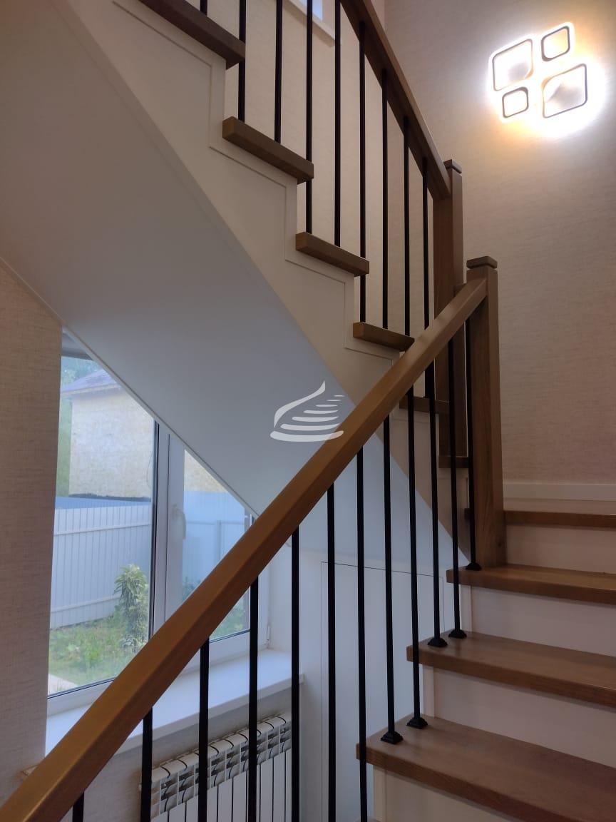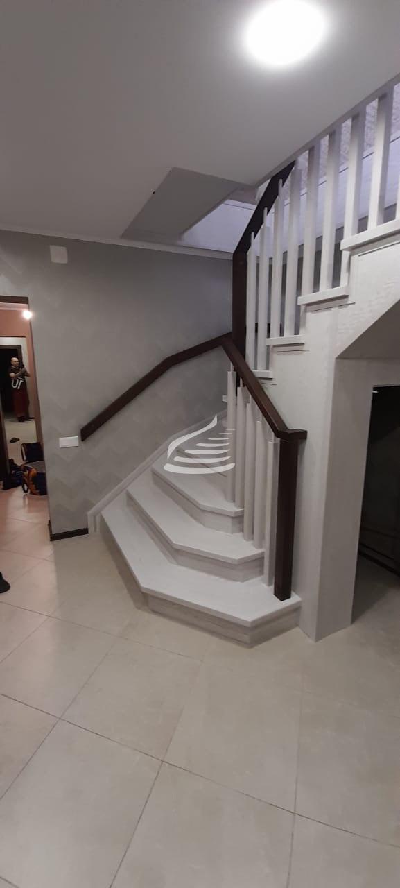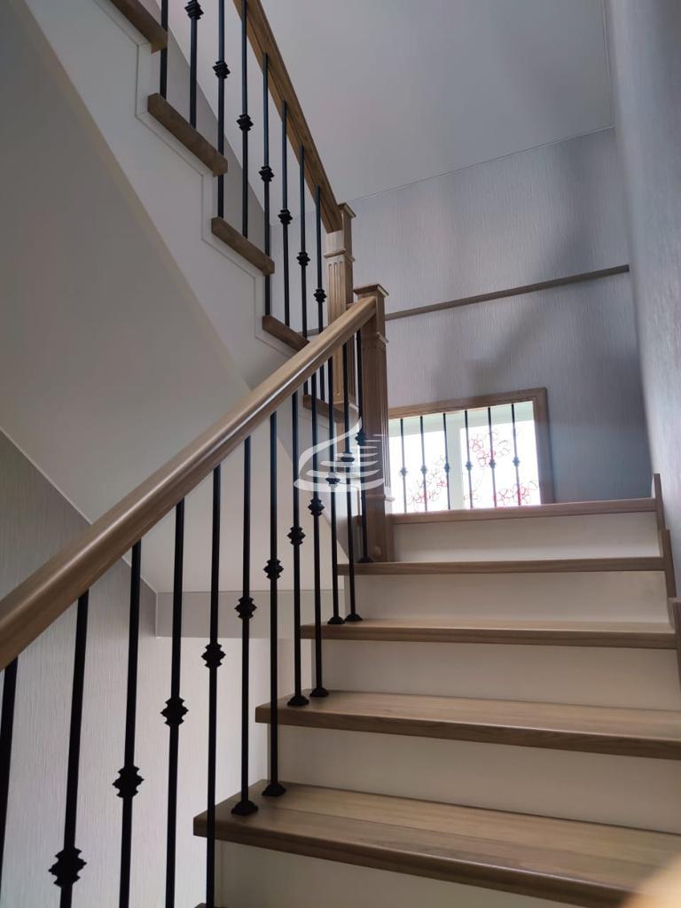Лестница между стен, с пристенным поручнем и подиумными ступенями, в серых тонах, из цельноламельного Ясеня. Обшивка готового металлокаркаса.