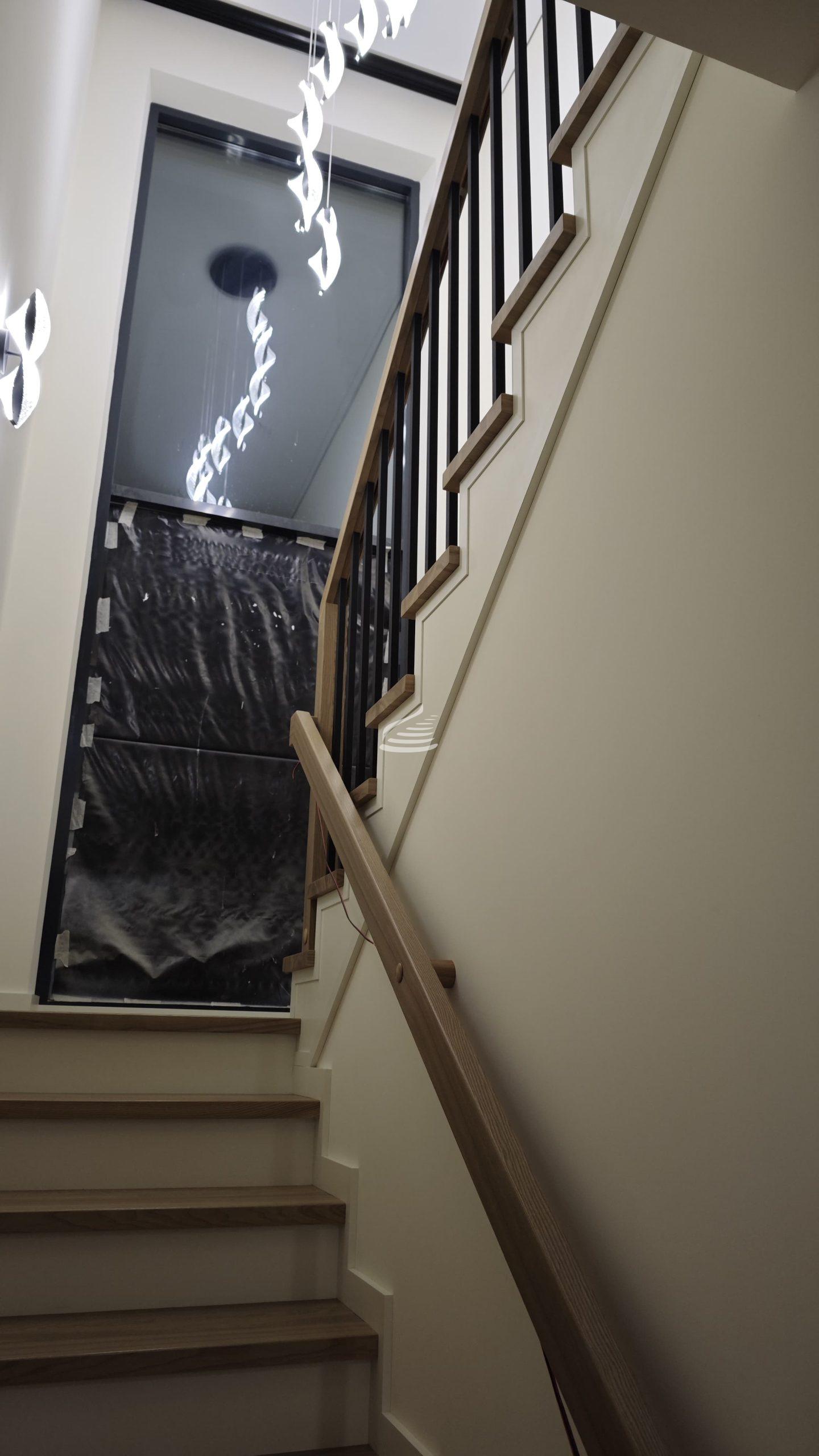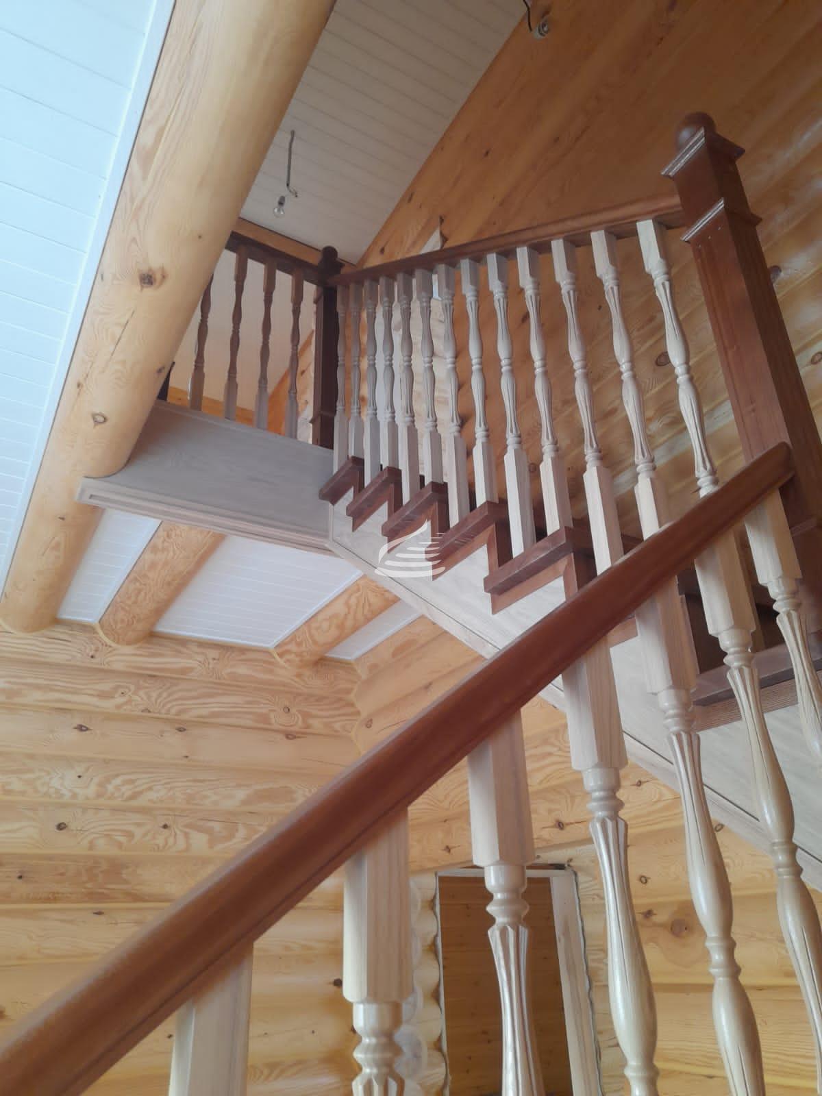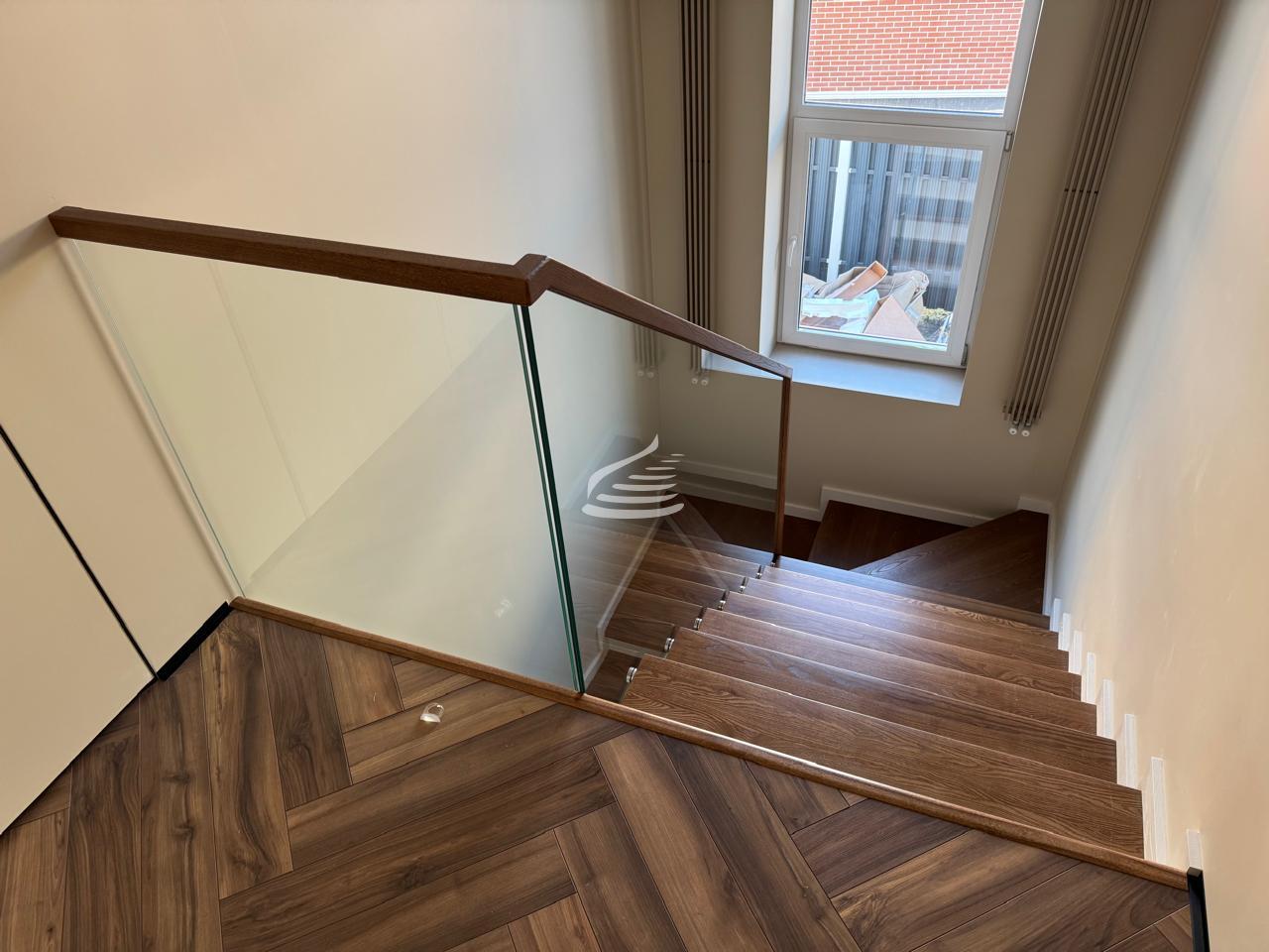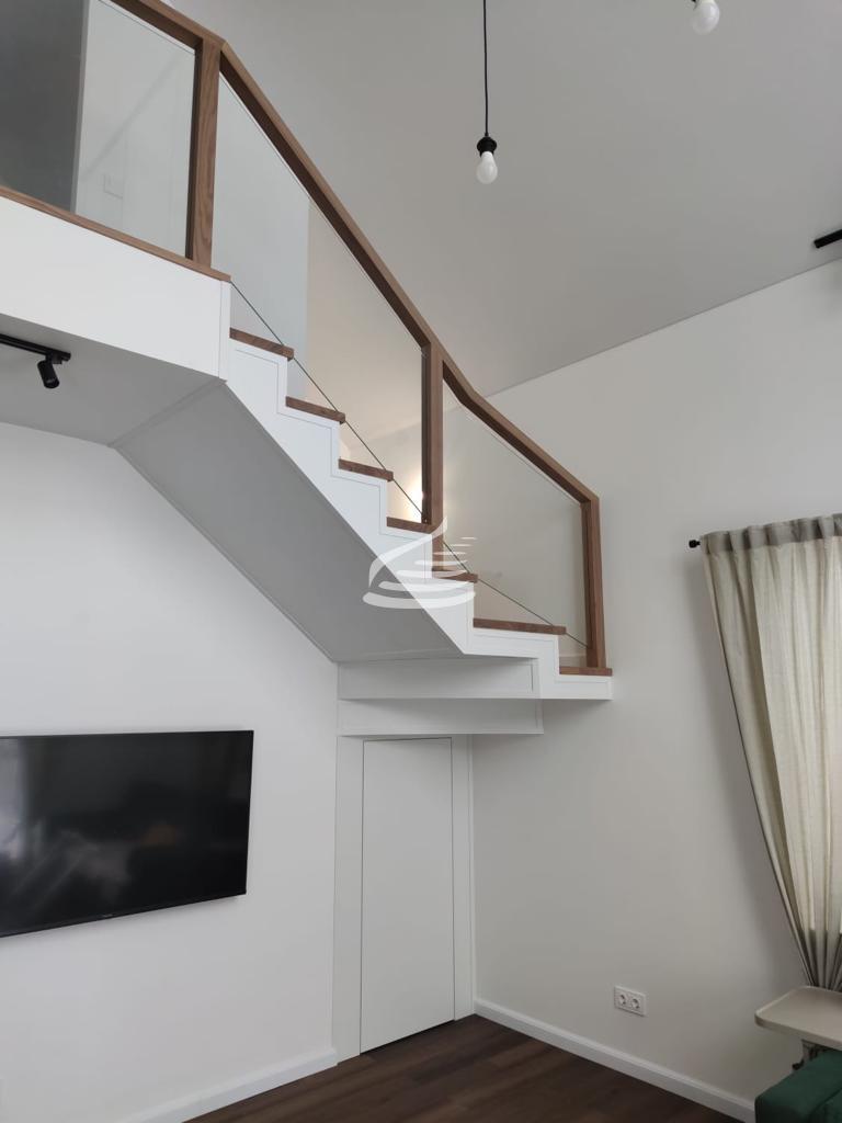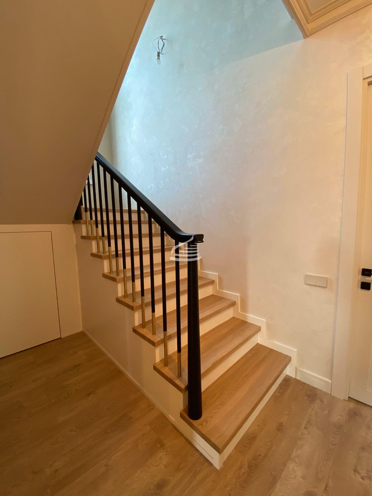 Лестница между стен, с пристенным поручнем и подиумными ступенями, в серых тонах, из цельноламельного Ясеня. Обшивка готового металлокаркаса.