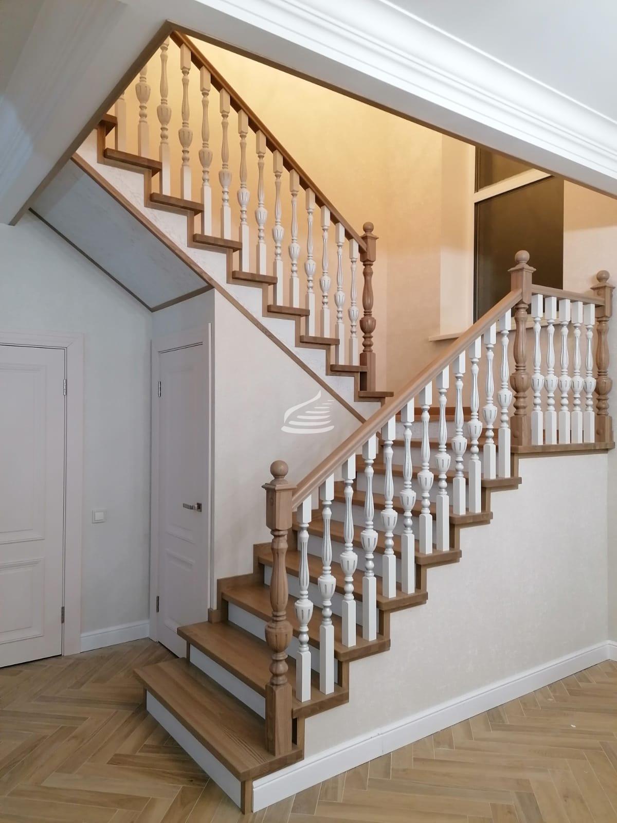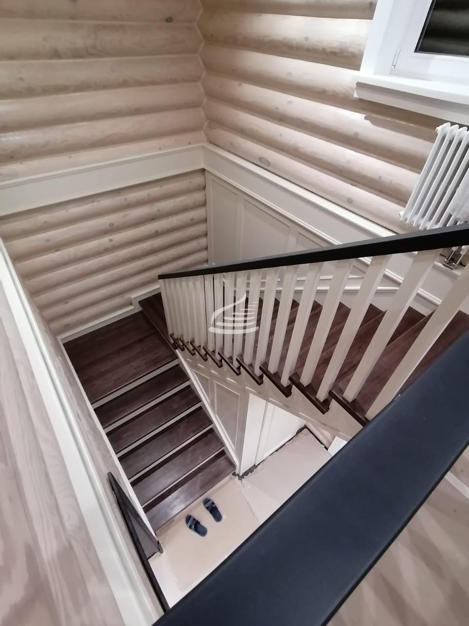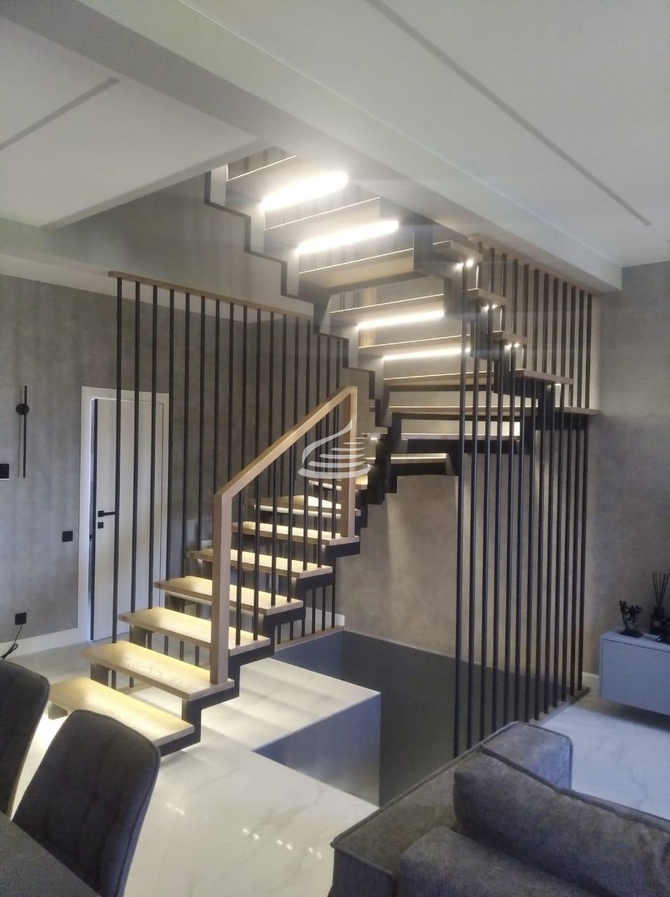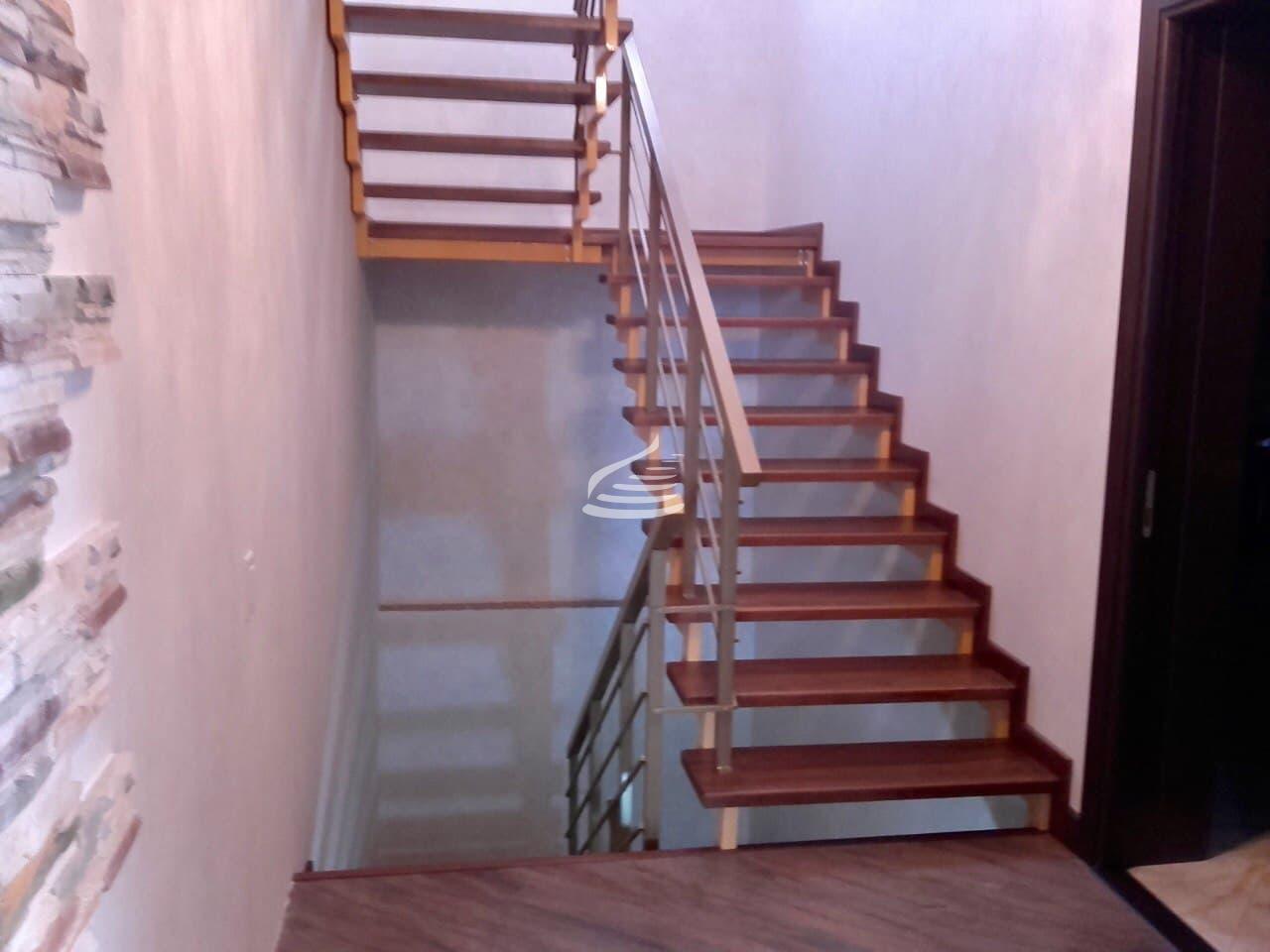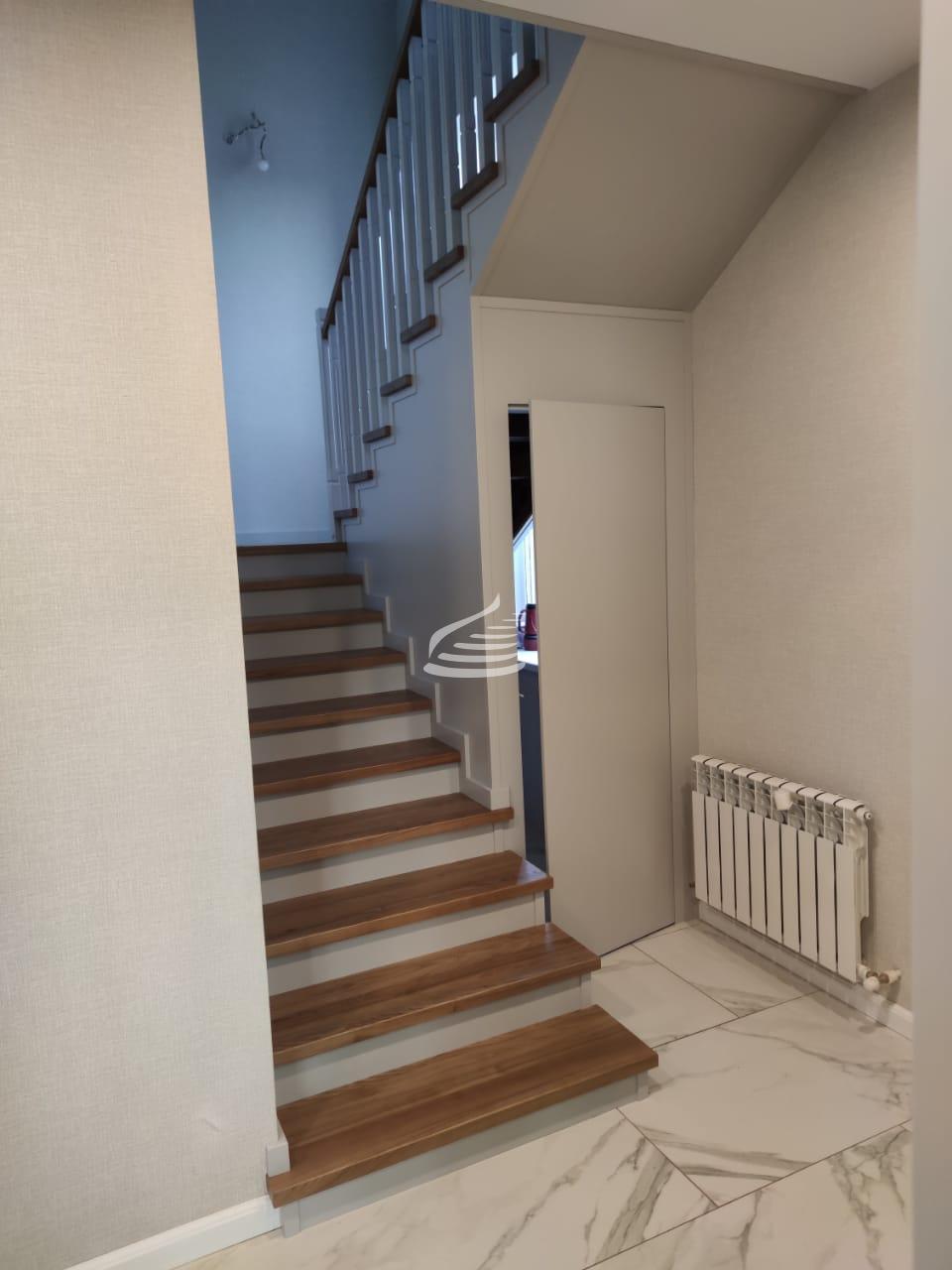 Лестница между стен, с пристенным поручнем и подиумными ступенями, в серых тонах, из цельноламельного Ясеня. Обшивка готового металлокаркаса.