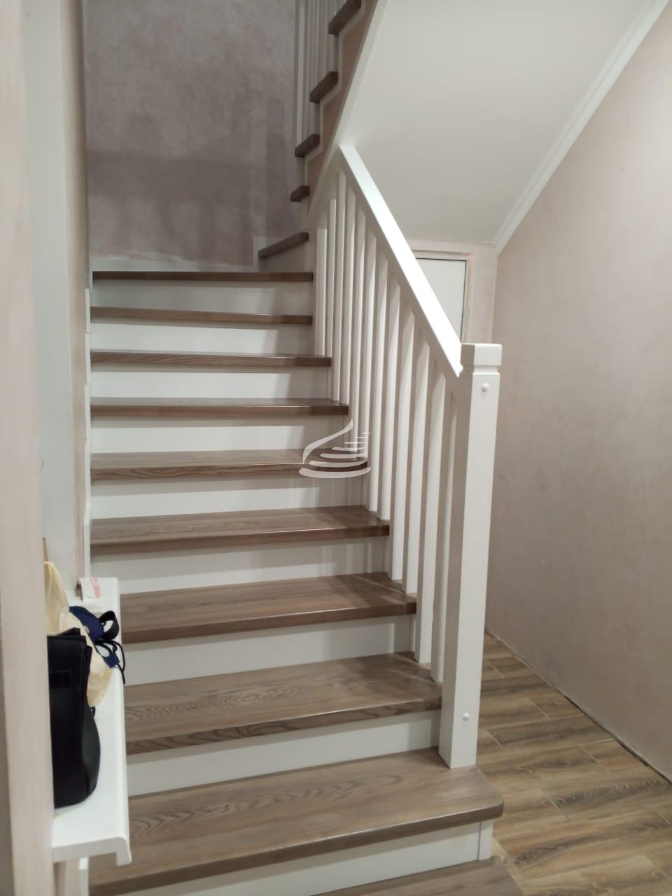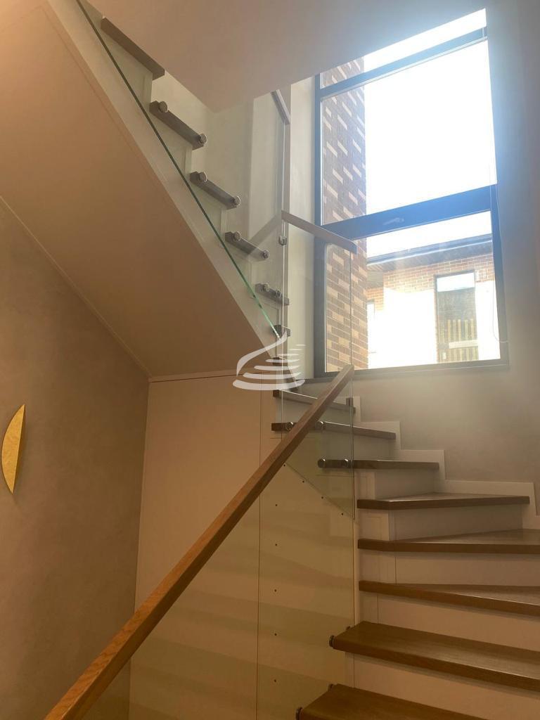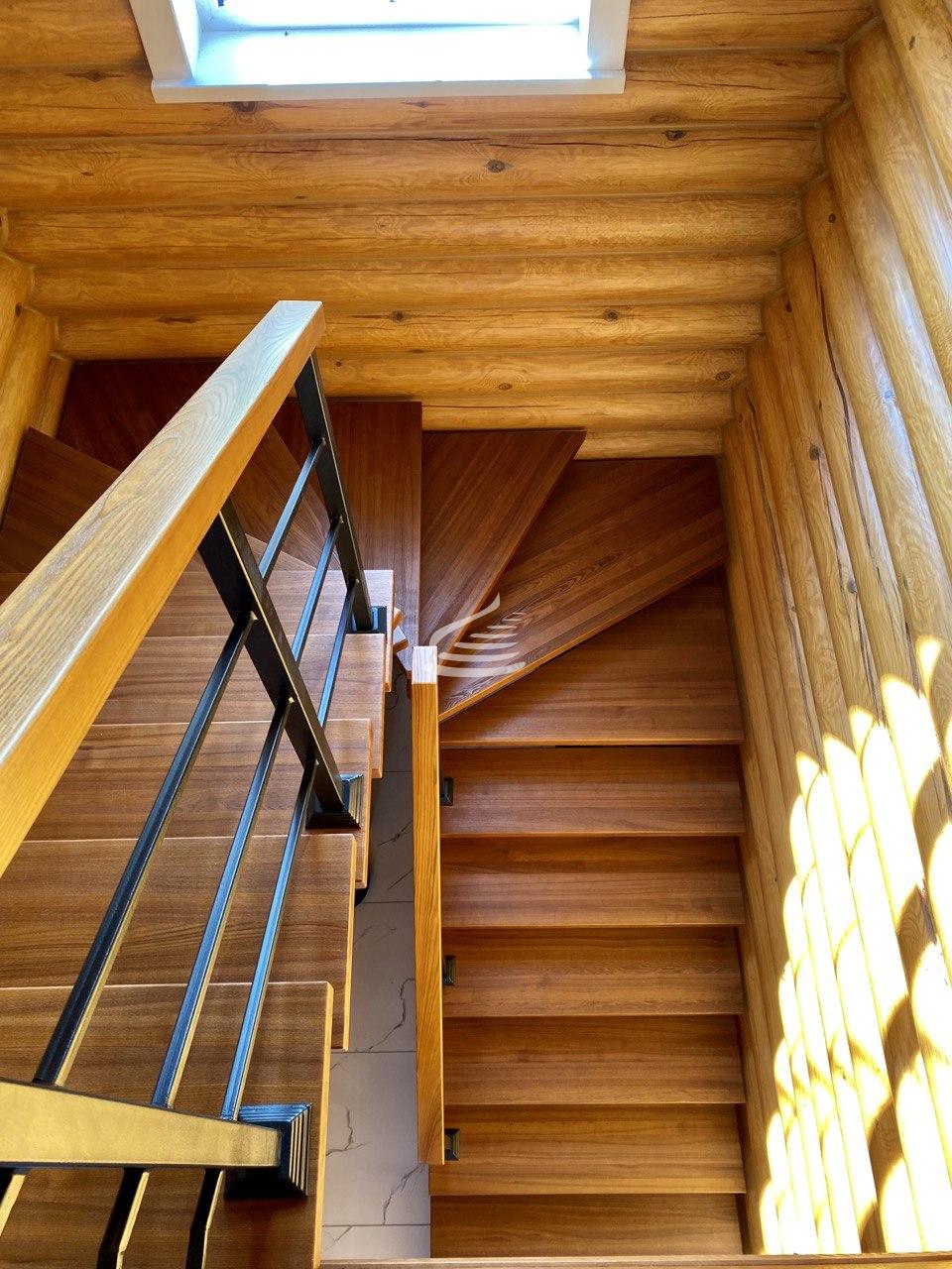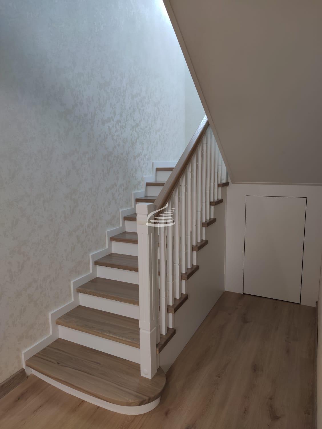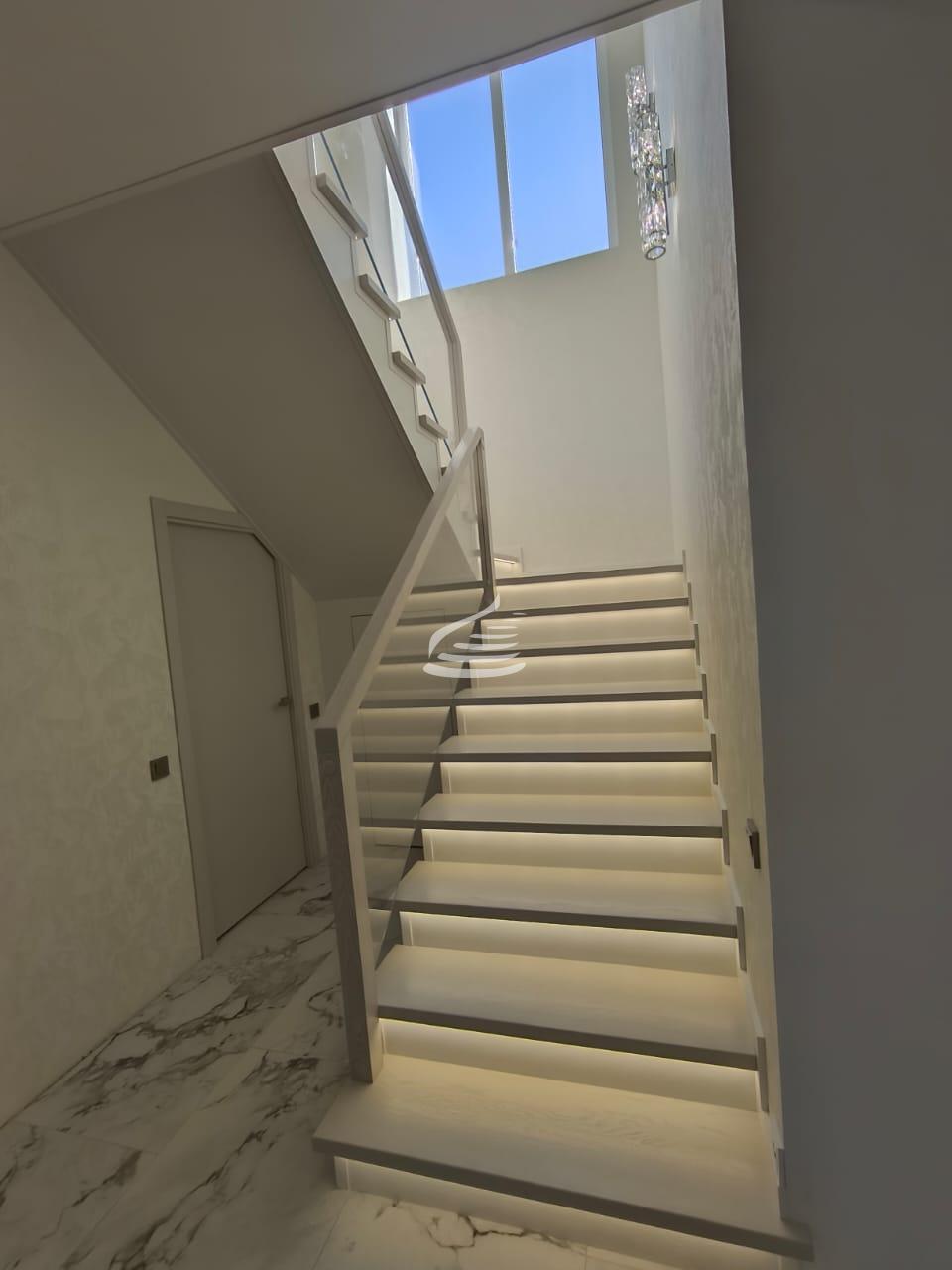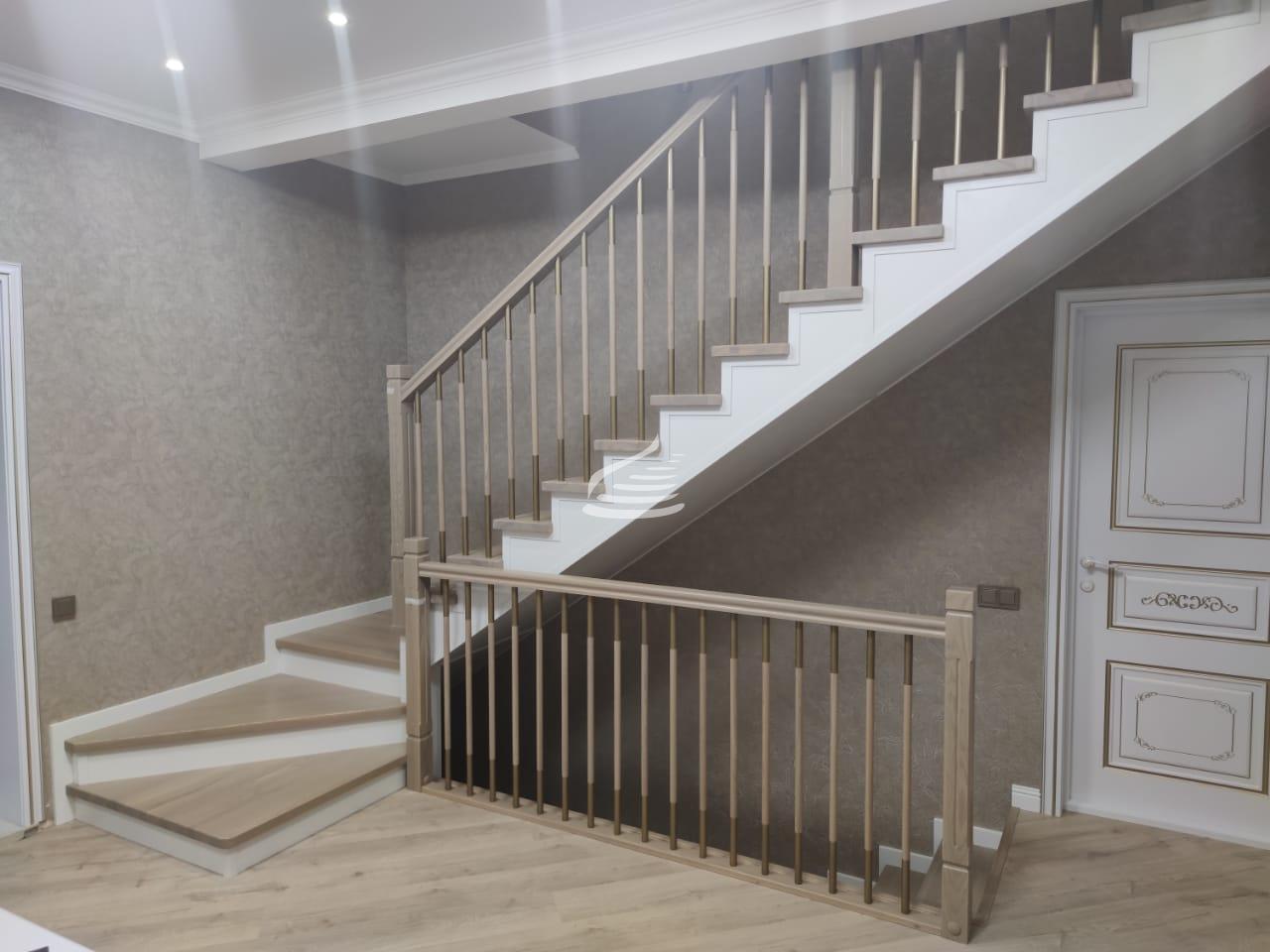 Лестница между стен, с пристенным поручнем и подиумными ступенями, в серых тонах, из цельноламельного Ясеня. Обшивка готового металлокаркаса.