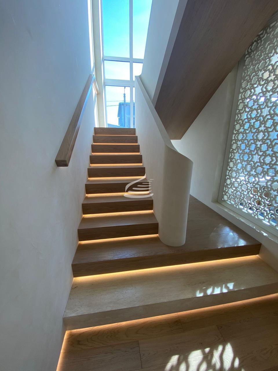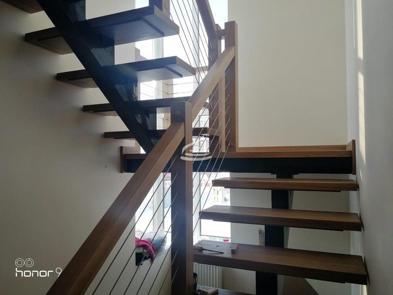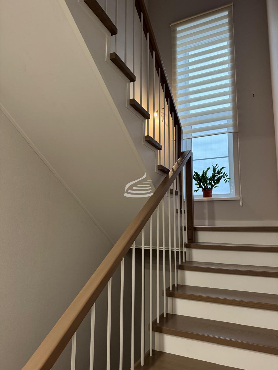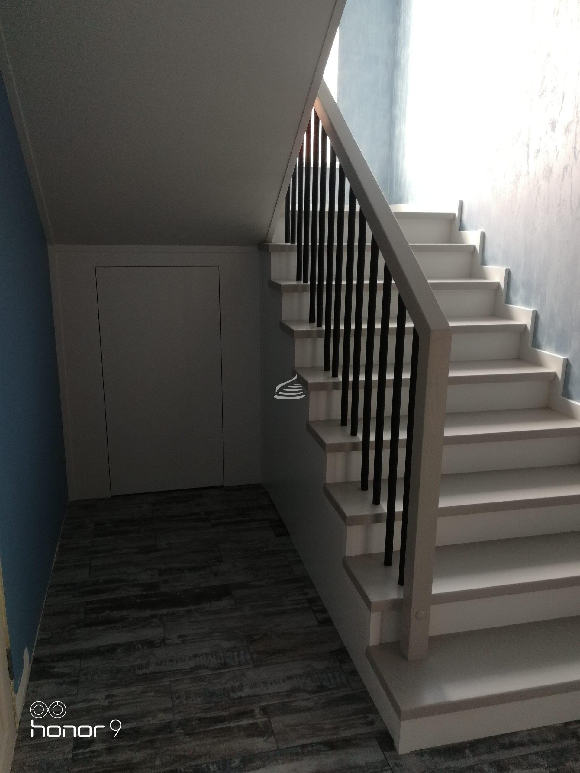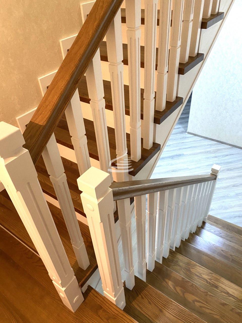 Лестница между стен, с пристенным поручнем и подиумными ступенями, в серых тонах, из цельноламельного Ясеня. Обшивка готового металлокаркаса.