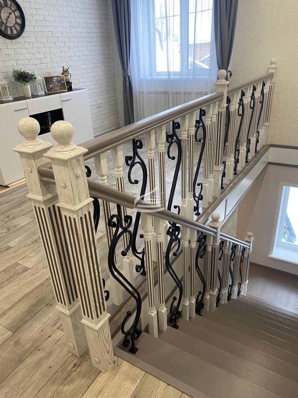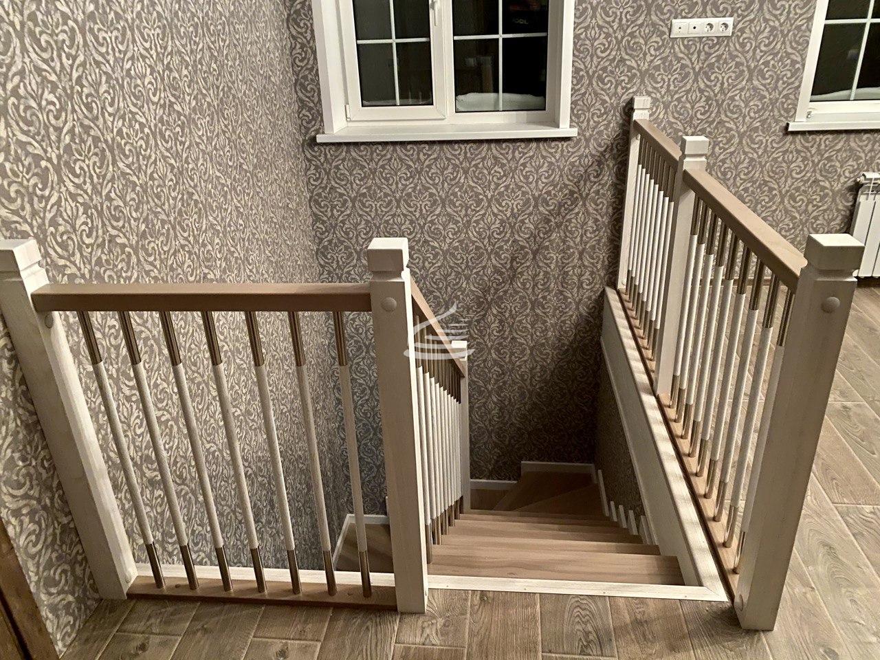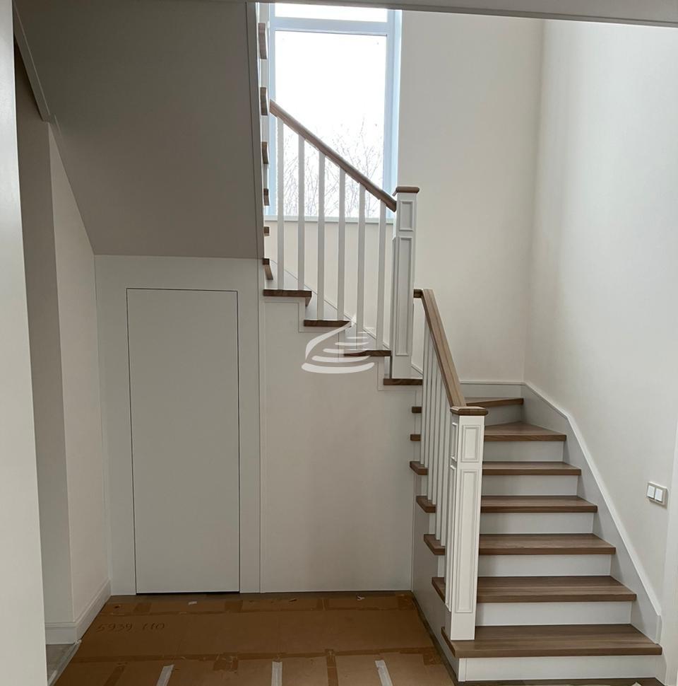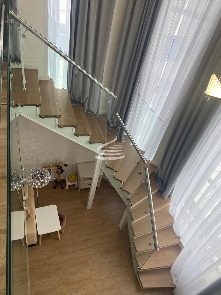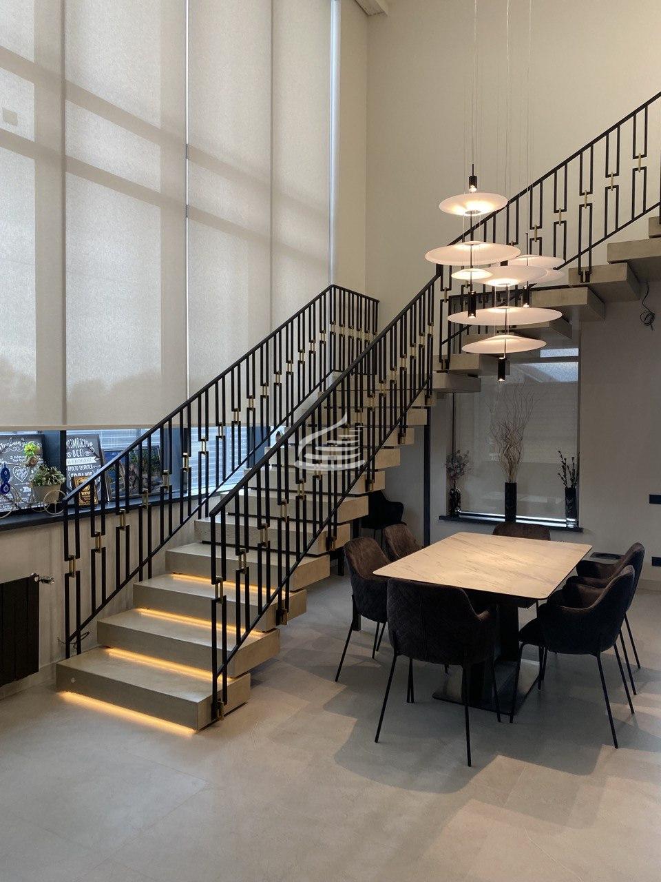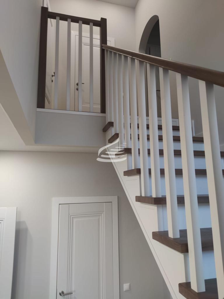 Лестница между стен, с пристенным поручнем и подиумными ступенями, в серых тонах, из цельноламельного Ясеня. Обшивка готового металлокаркаса.