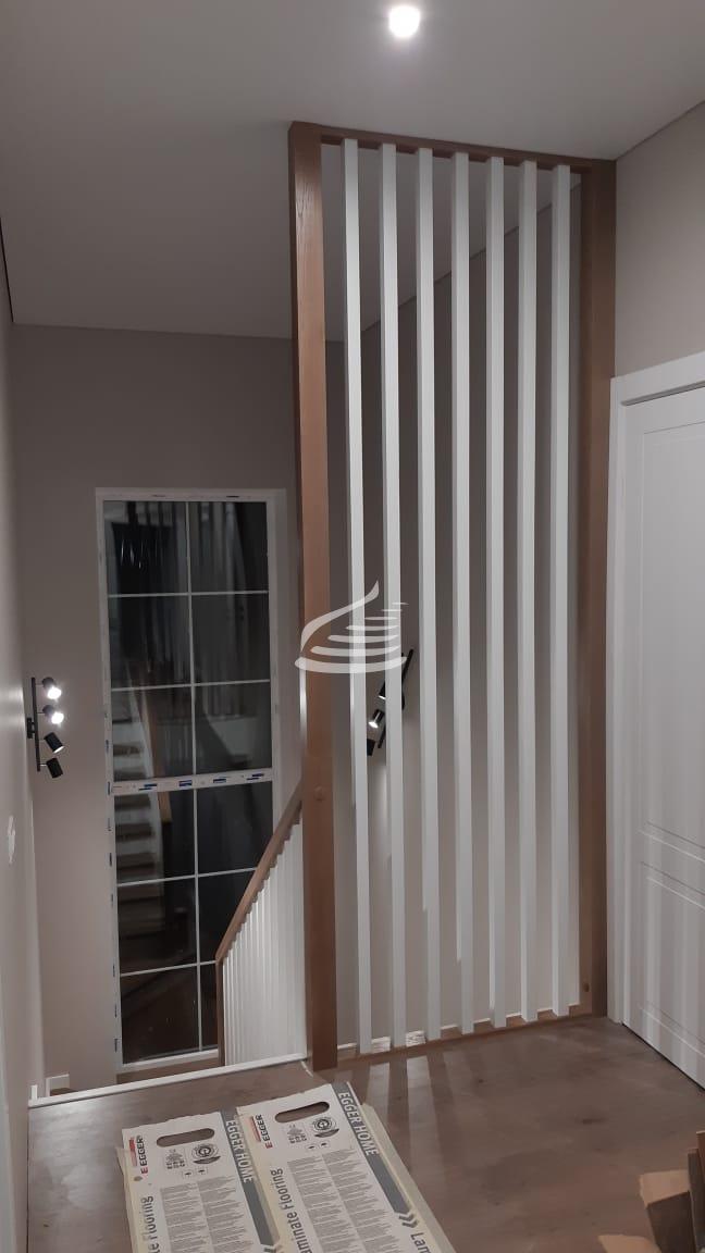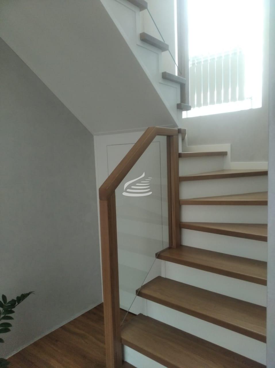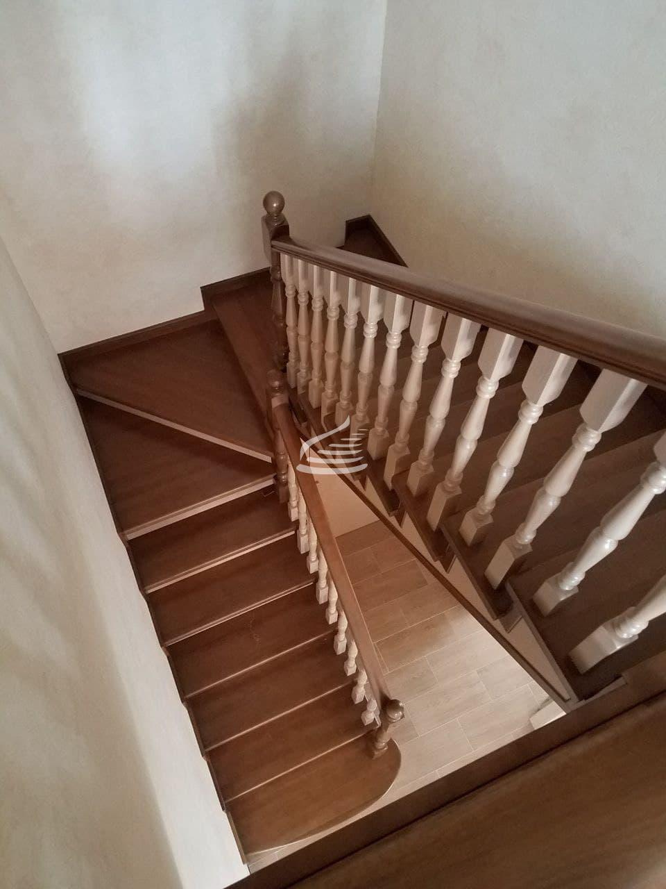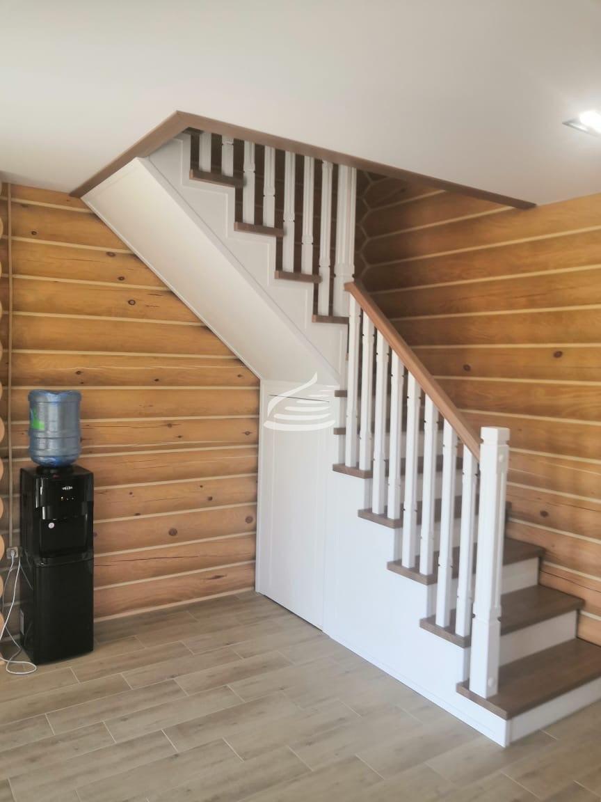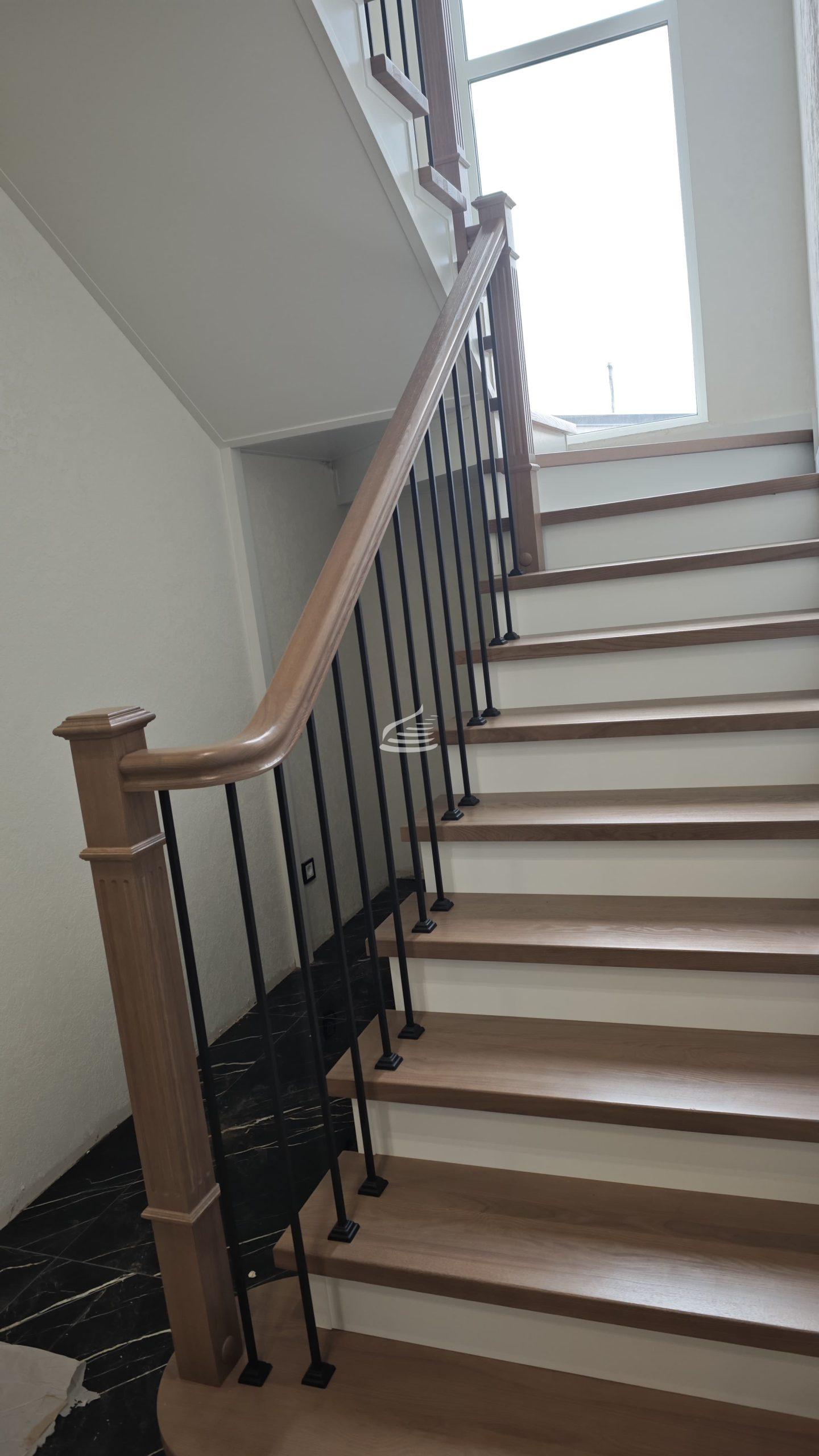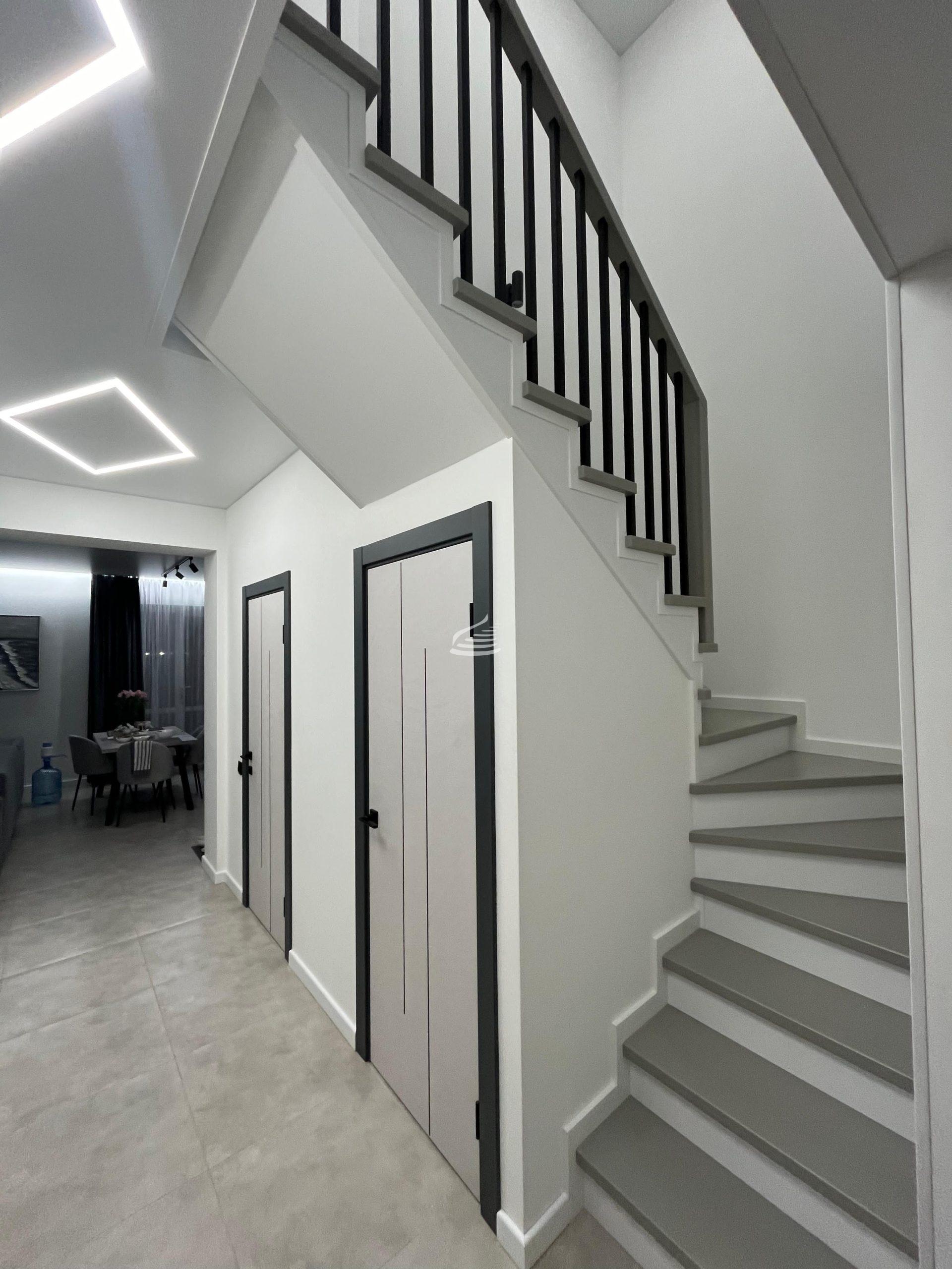 Лестница между стен, с пристенным поручнем и подиумными ступенями, в серых тонах, из цельноламельного Ясеня. Обшивка готового металлокаркаса.