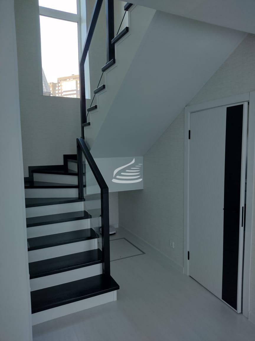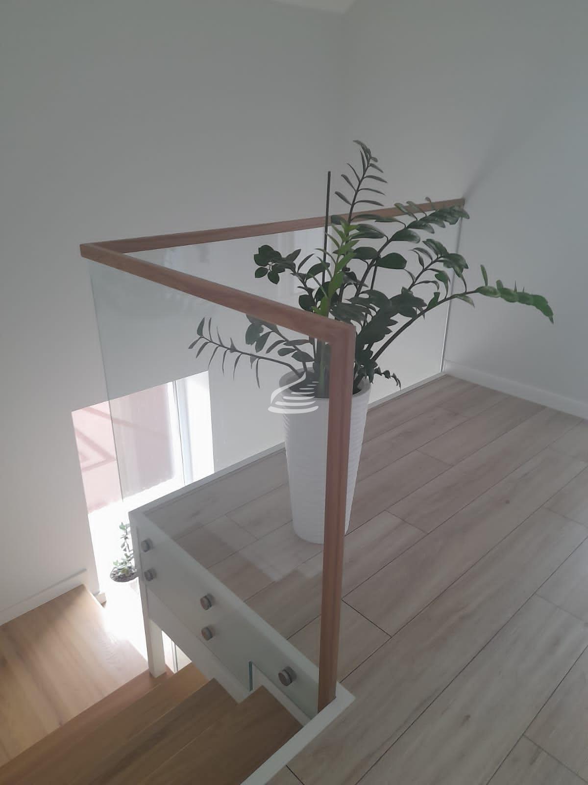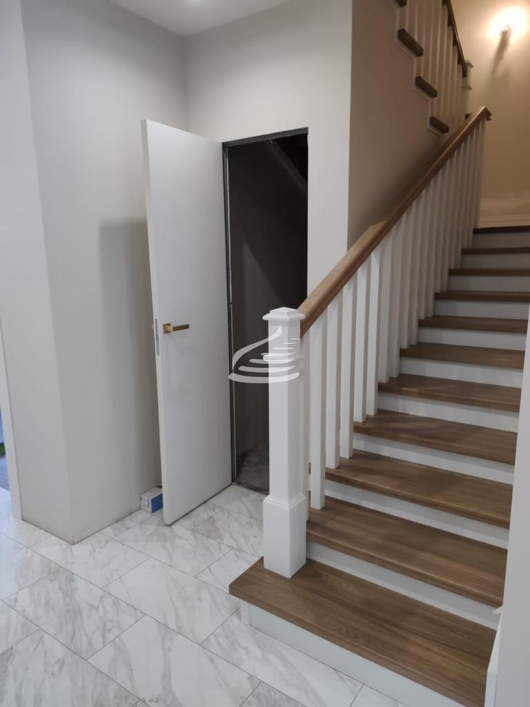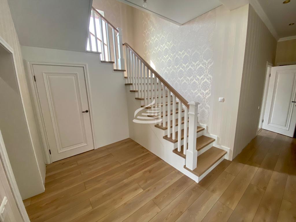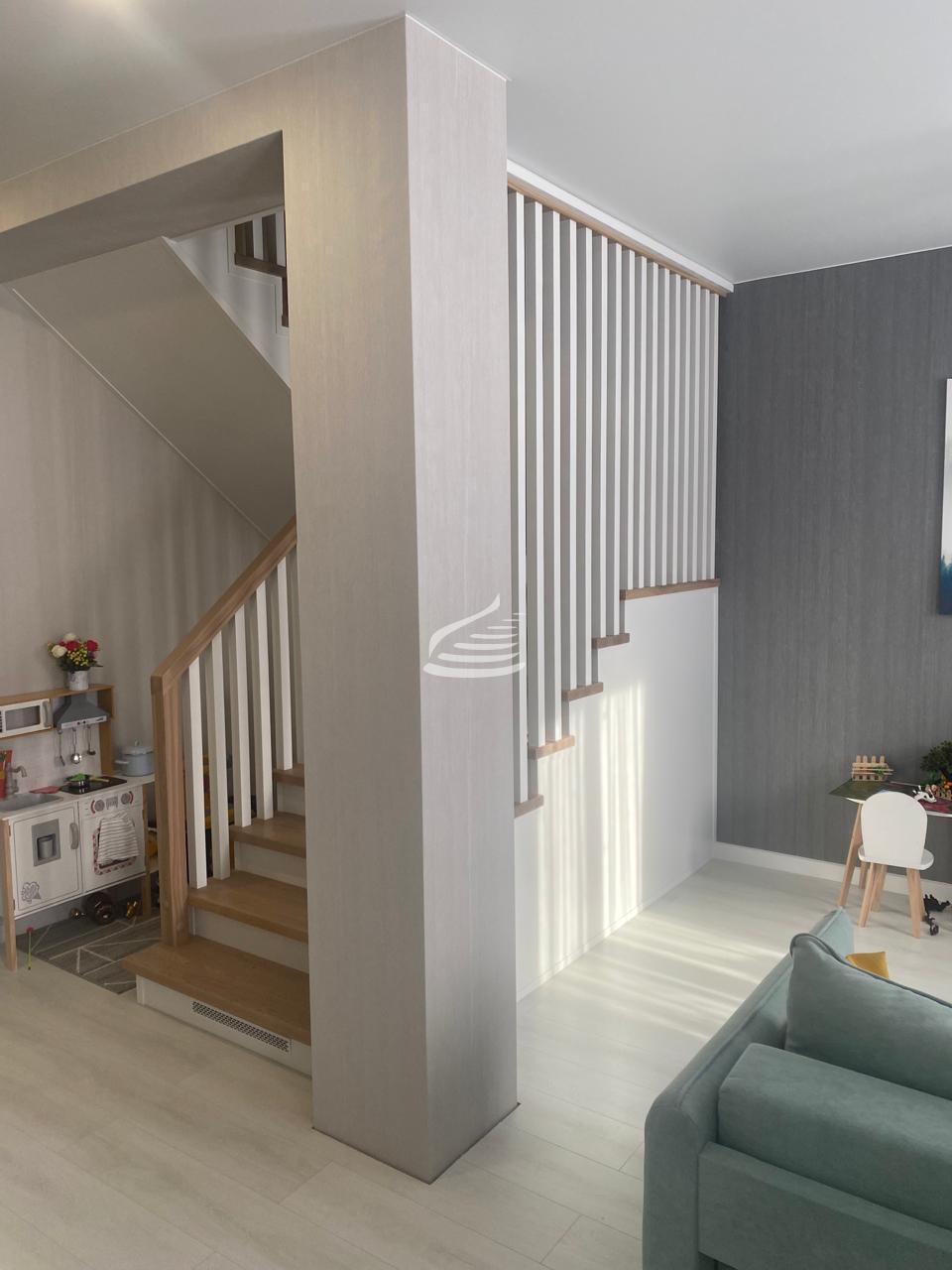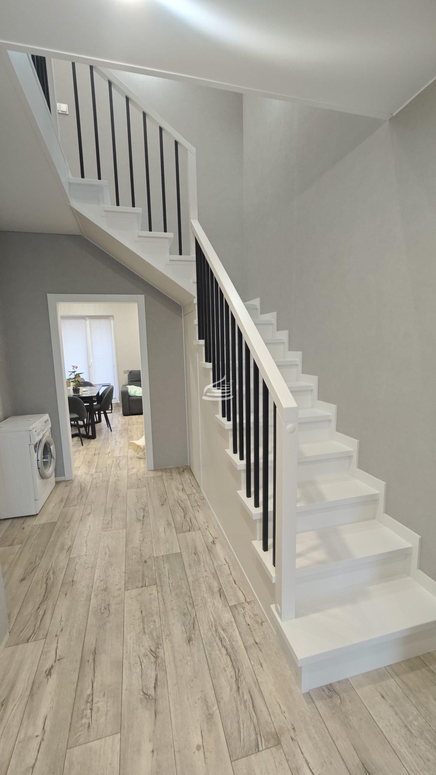 Лестница между стен, с пристенным поручнем и подиумными ступенями, в серых тонах, из цельноламельного Ясеня. Обшивка готового металлокаркаса.