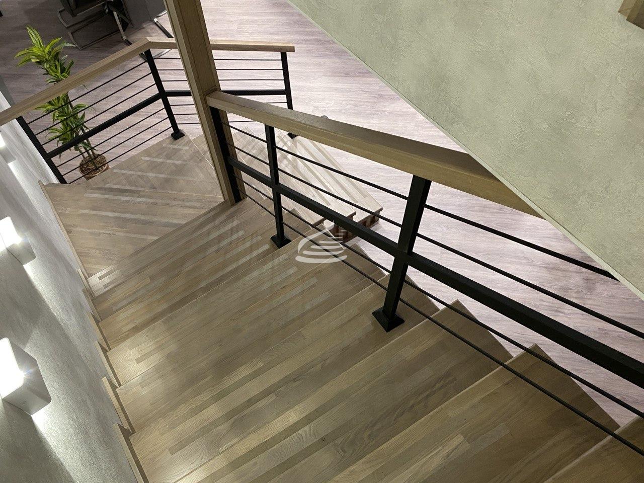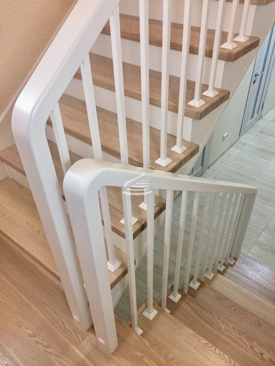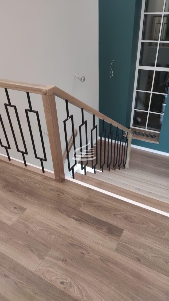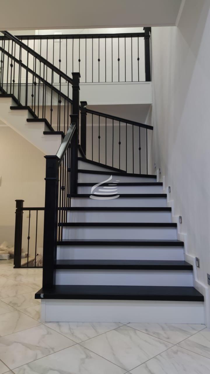 Строгость и сдержанность балясин, окрашенных в тон "черный муар", подчеркнута белоснежной фальш-тетивой, которая придает форму, создает контраст и вносит необходимый штрих к простой и сдержанной красоте этой лестницы.