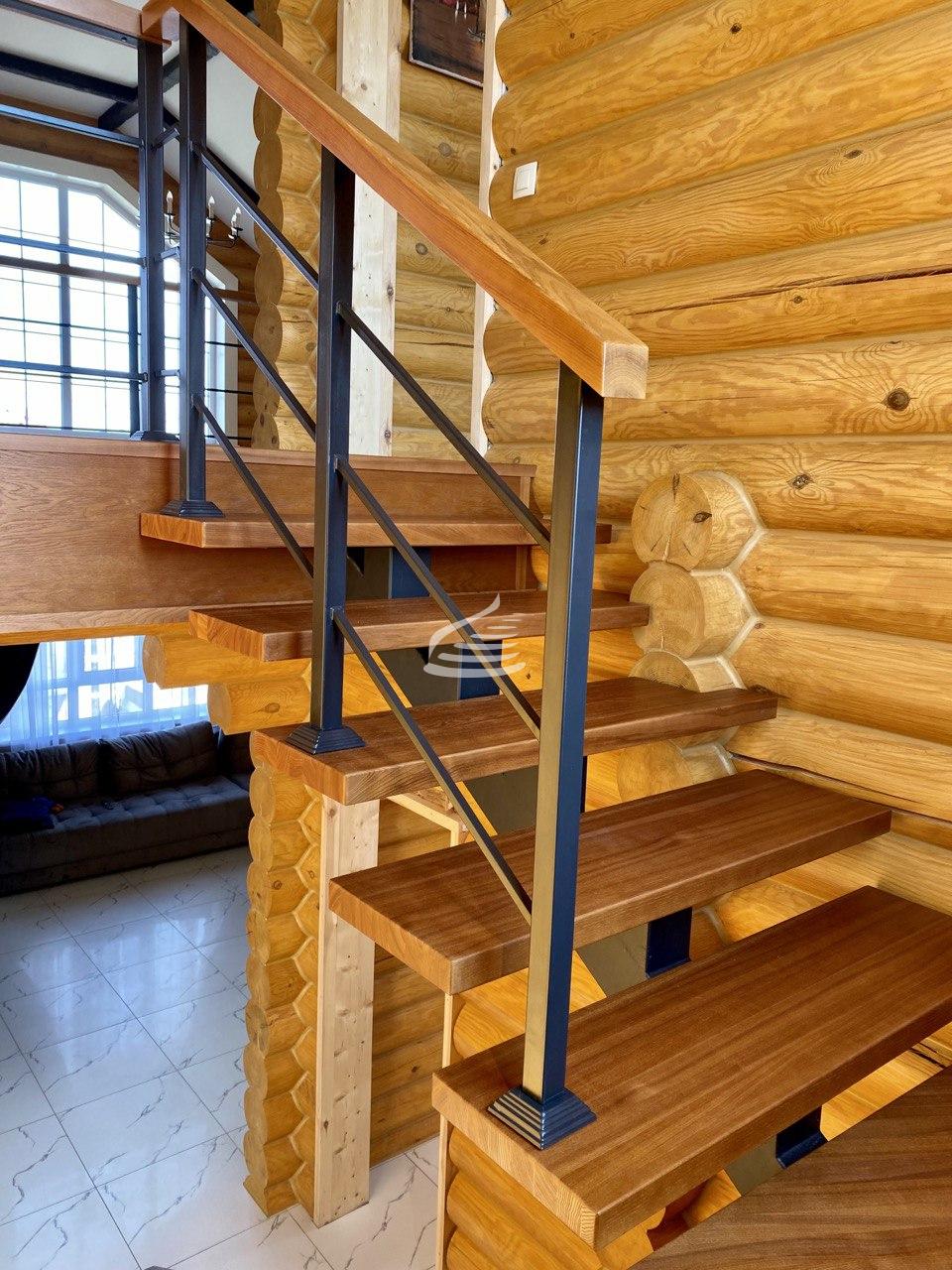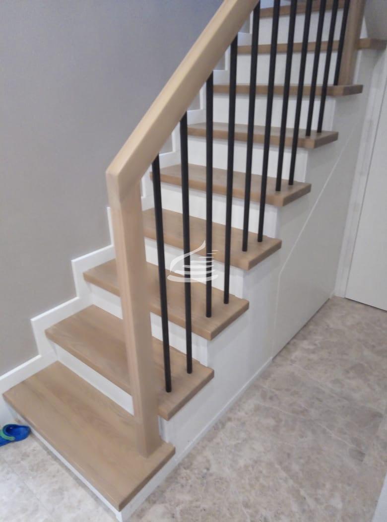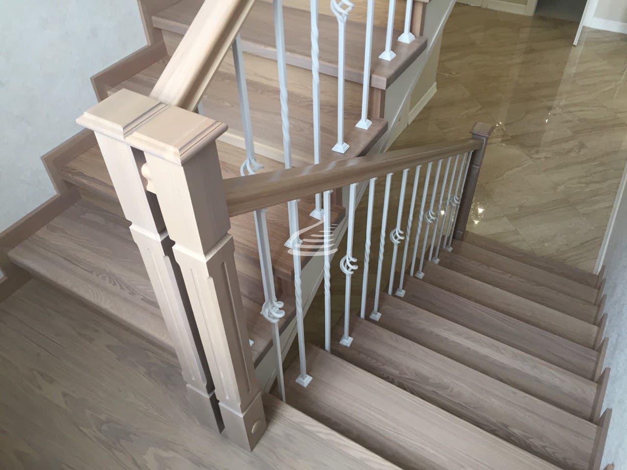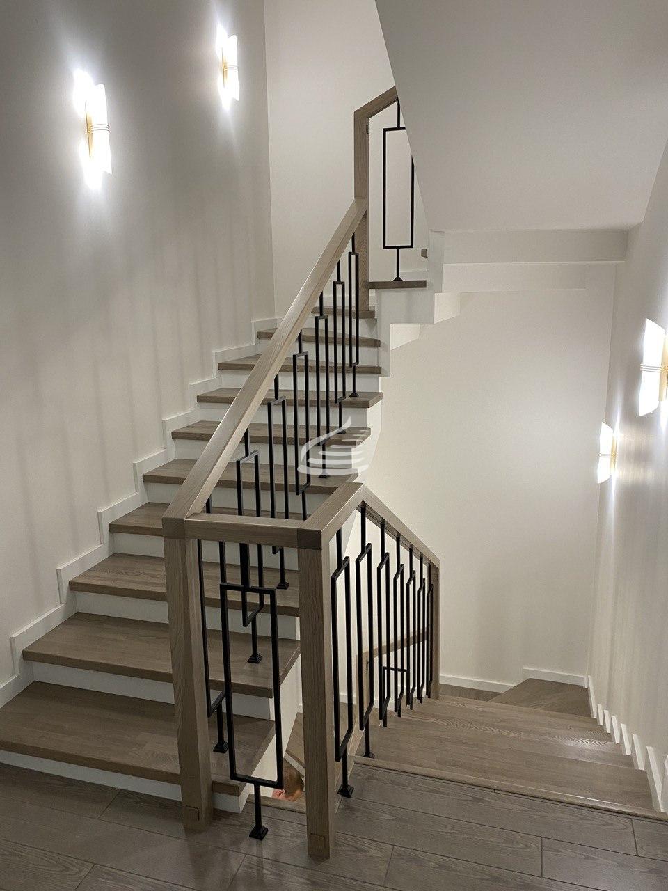 Строгость и сдержанность балясин, окрашенных в тон "черный муар", подчеркнута белоснежной фальш-тетивой, которая придает форму, создает контраст и вносит необходимый штрих к простой и сдержанной красоте этой лестницы.