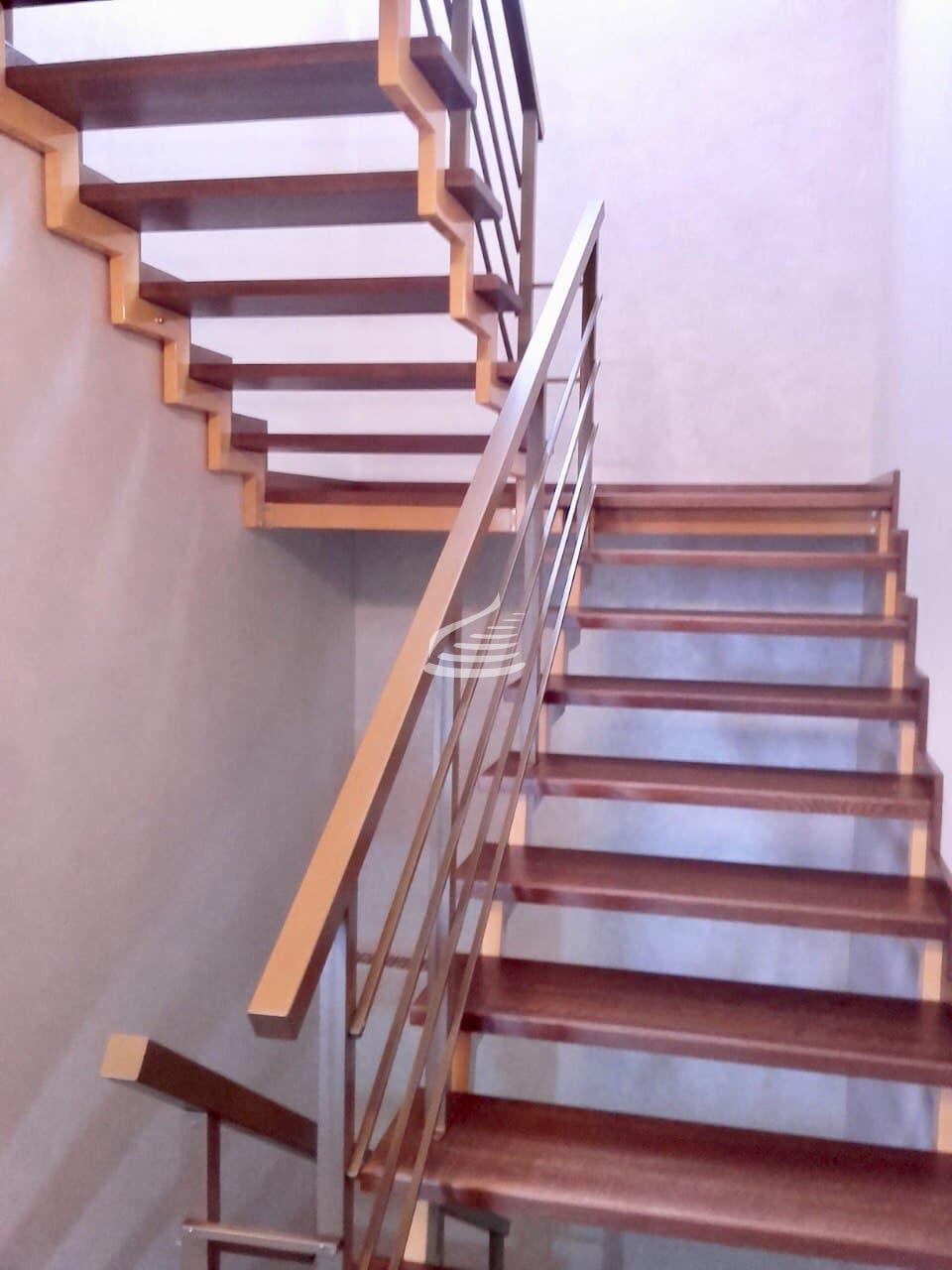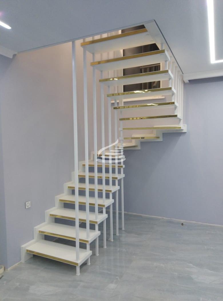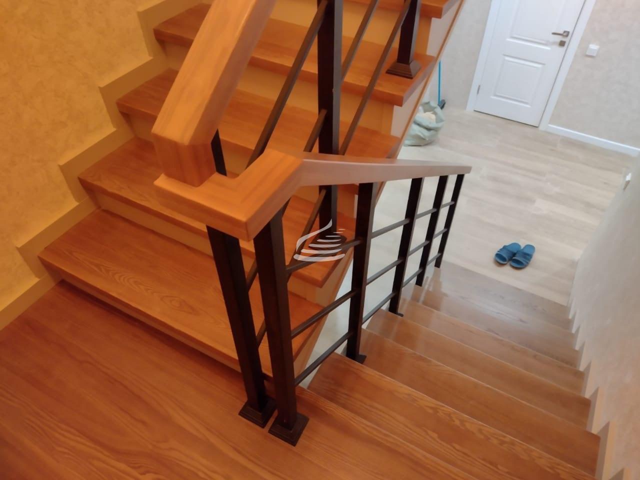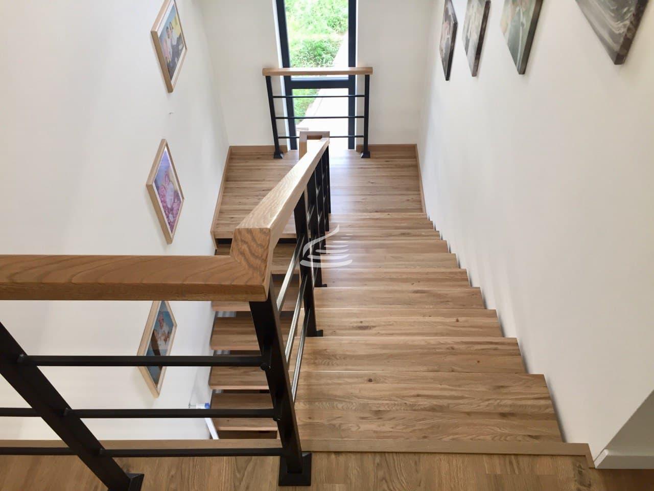 Строгость и сдержанность балясин, окрашенных в тон "черный муар", подчеркнута белоснежной фальш-тетивой, которая придает форму, создает контраст и вносит необходимый штрих к простой и сдержанной красоте этой лестницы.